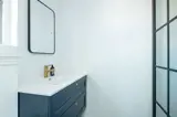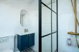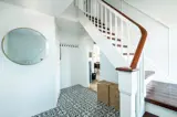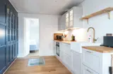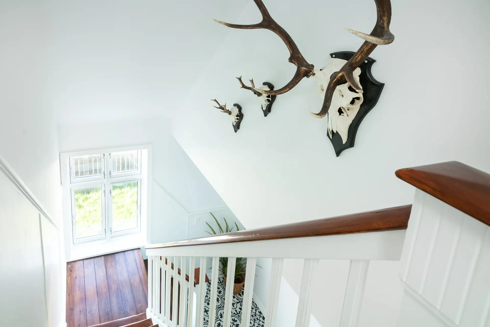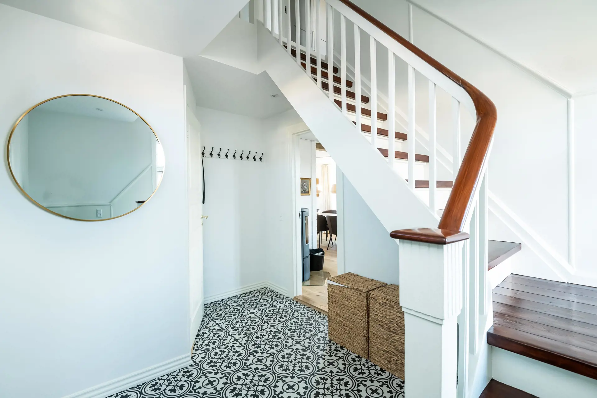 Der einladende Wohnküchenbereich bildet das natürliche Herz des Hauses. Der große Esstisch lädt zu langen Abendessen und gemütlichen Stunden mit der Familie ein. Das Wohnzimmer ist mit weichen Möbeln ausgestattet und wird durch einen schönen Kaminofen ergänzt, der eine warme und entspannte Atmosphäre schafft. Zahlreiche Fenster sorgen im gesamten Haus für einen wunderbaren Lichteinfall und eine helle, sehr freundliche Stimmung. Im Obergeschoss verleihen weiß gestrichene Böden und stilvolle Tapeten der Etage eine leichte, poetische Eleganz. Darüber hinaus stehen zwei elegante Badezimmer zur Verfügung, die für hohen Komfort sorgen – ganz ohne Warteschlangen am Morgen.