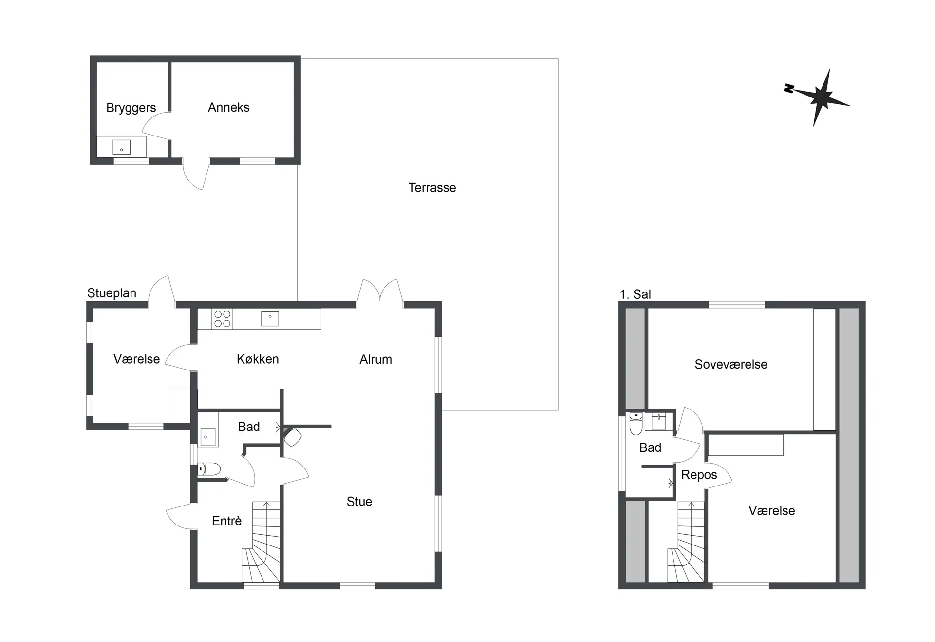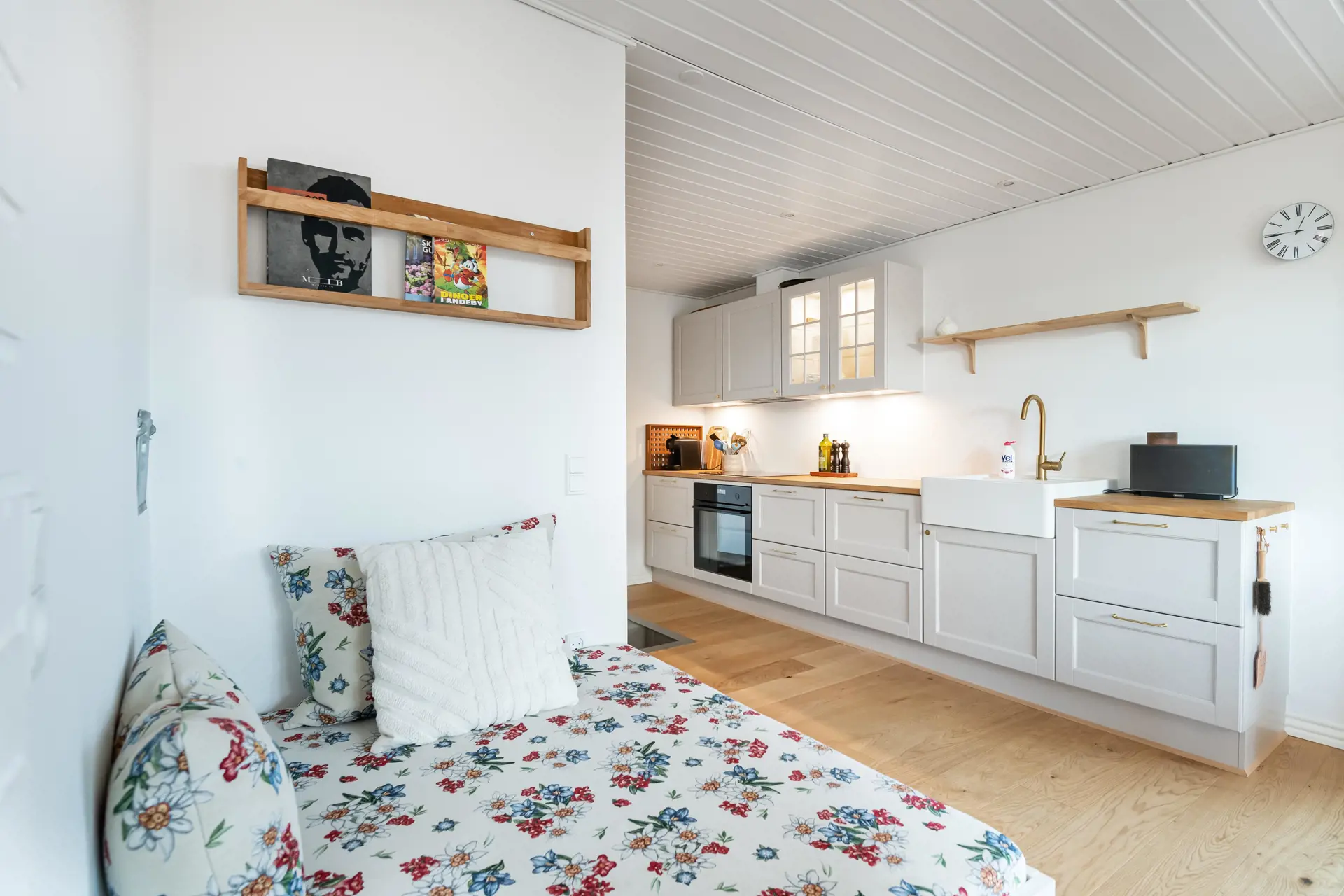 Das Haus verfügt über drei geschmackvoll und hochwertig eingerichtete Schlafzimmer im Haupthaus sowie ein separates Gästehaus mit eigenem Schlafzimmer. Das Gästehaus ist schlicht eingerichtet und ideal für Gäste, die Wert auf zusätzliche Privatsphäre und Ruhe legen.