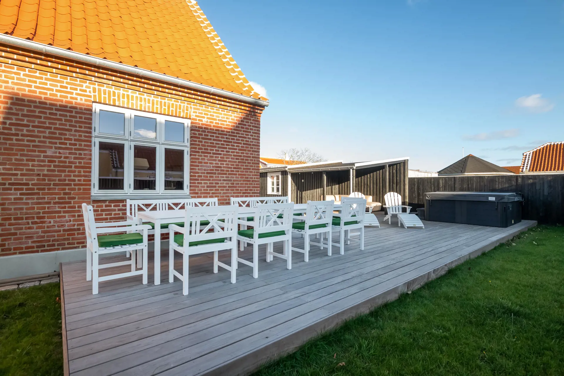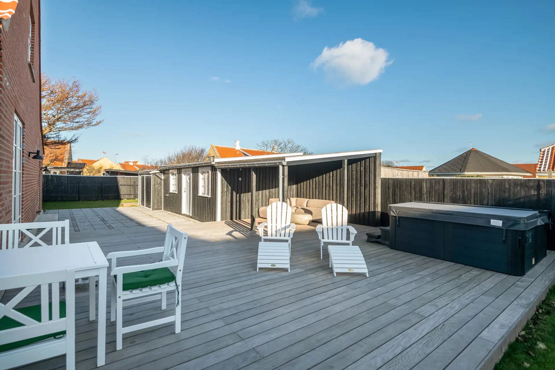 Im Außenbereich verwöhnt das Ferienhaus mit einem geschlossenen Garten mit Rasenfläche sowie einer großen, schönen Terrasse, die zu Entspannung und geselligem Beisammensein einlädt. Zudem gibt es einen Outdoor-Whirlpool sowie eine überdachte Terrasse mit Loungemöbeln, auf der laue Sommerabende auch dann genossen werden können, wenn der Tau bereits gefallen ist.