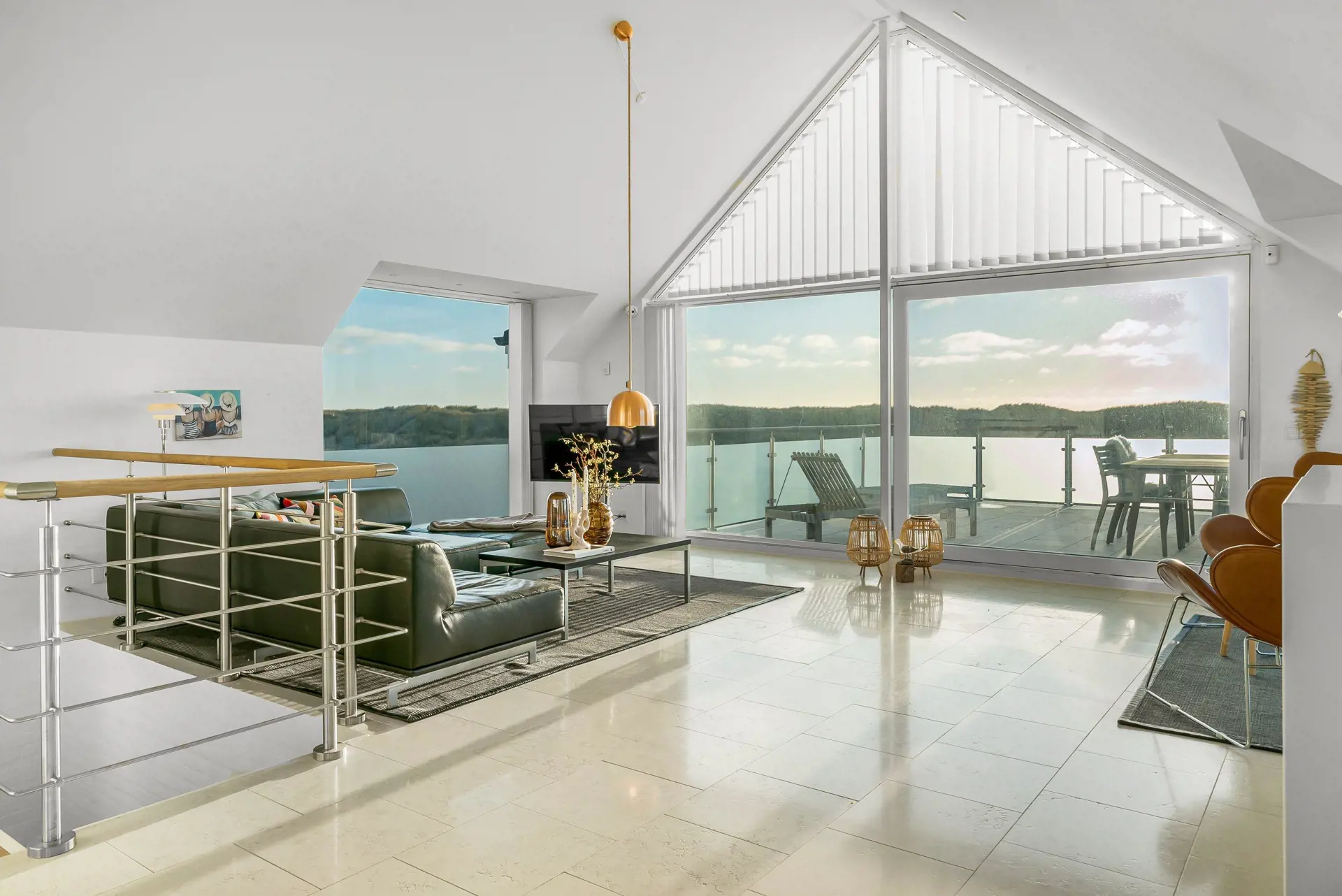 Das Haus liegt erhöht im Gelände und bietet einen herrlichen Blick auf Strand und Meer – beides kann sowohl von den Wohnräumen als auch von der Terrasse aus genossen werden.