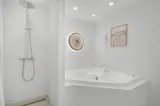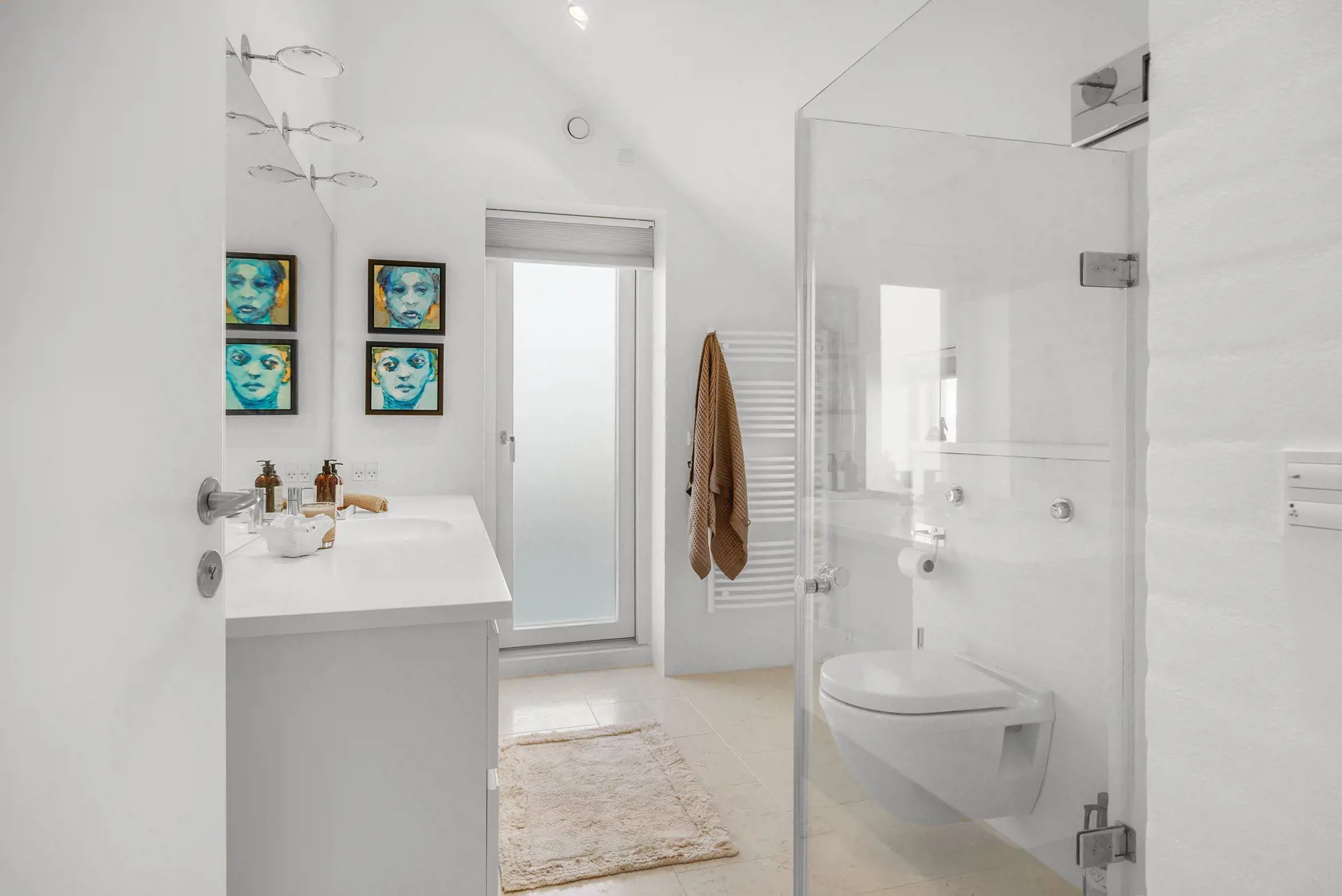 1 Schlafzimmer mit Doppelbett (180 x 200 cm) im Obergeschoss mit eigenem Bad en suite.