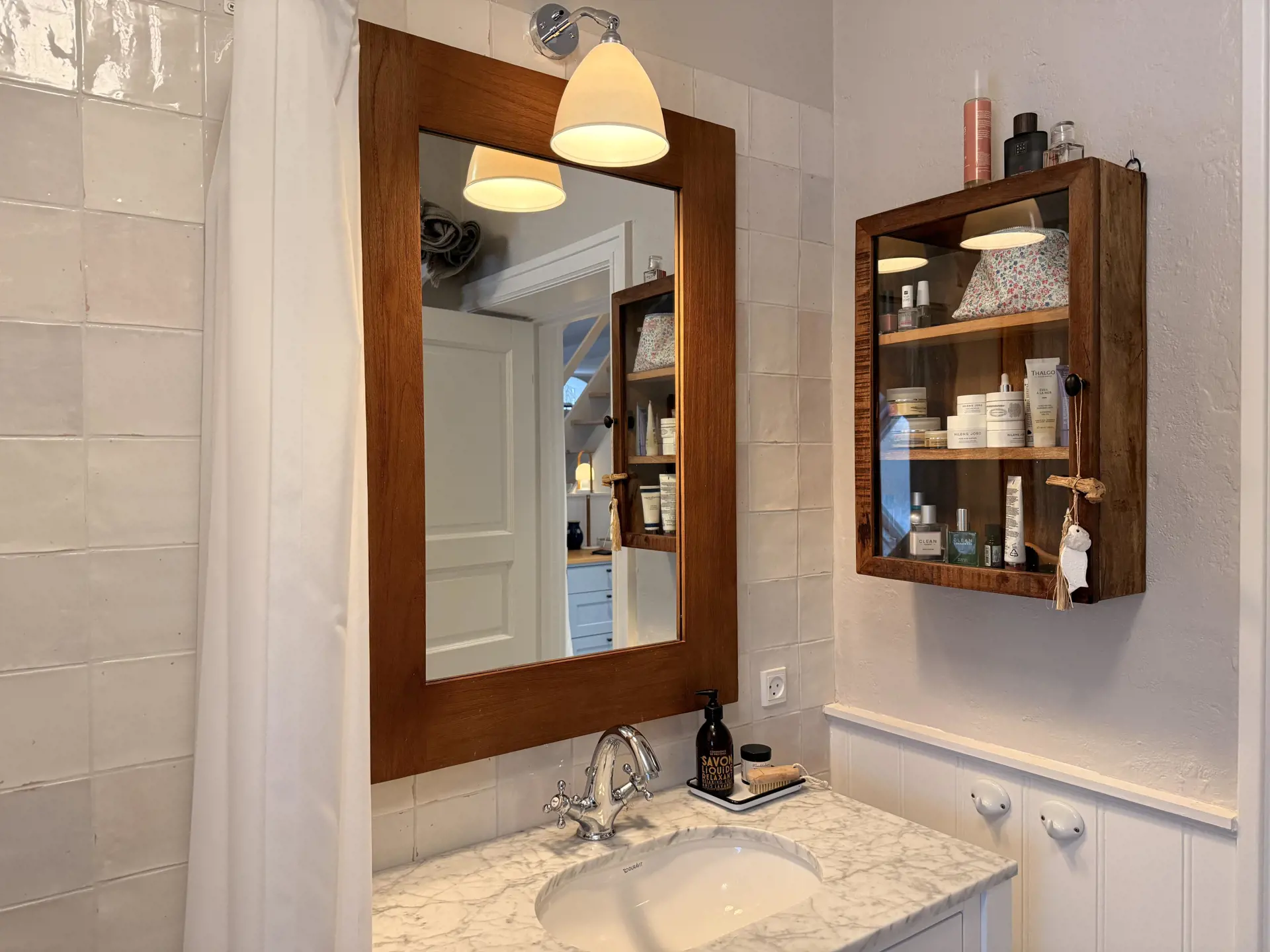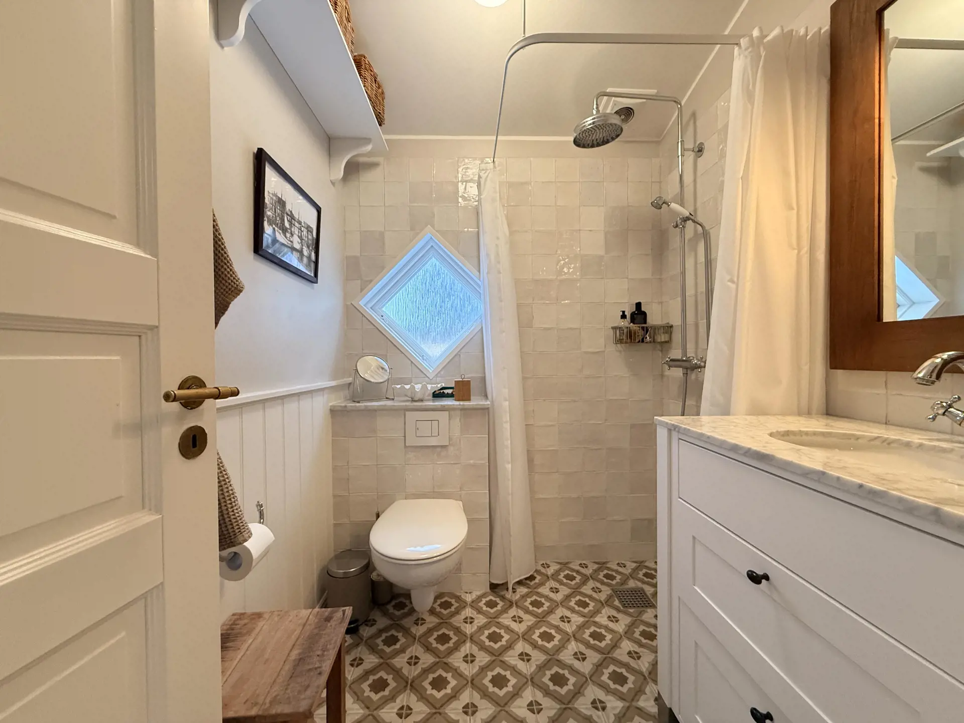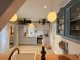 Der offene Küchen- und Wohnbereich bildet den natürlichen Mittelpunkt. Modern ausgestattet und wunderbar gestaltet, lädt besonders der gemütliche Essplatz mit der großen, kissenreichen Bank zu langen Frühstücken und entspannten Abenden ein. Das Badezimmer präsentiert sich elegant und stilrein mit Dusche, WC und Waschbecken.