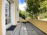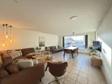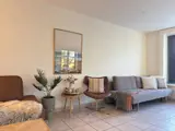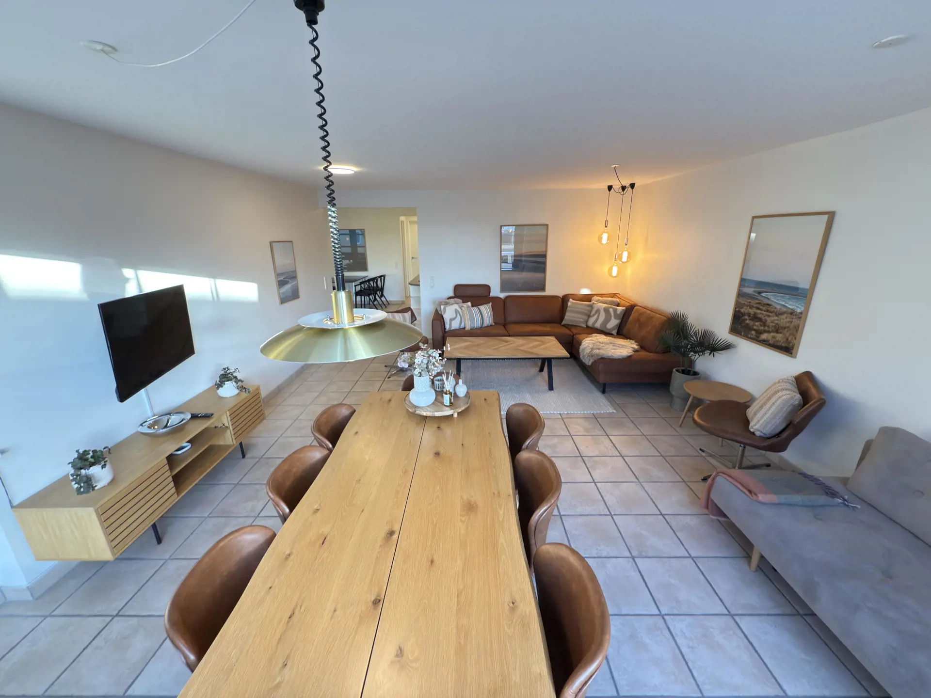 Die Wohnung befindet sich im Erdgeschoss des Hauses und hat einen eigenen Eingang auf der linken Seite der Treppe. Die 95 m2 der Ferienwohnung sind aufgeteilt in ein kleines Entree, zwei Schlafzimmer, eines mit Doppelbett und das andere mit zwei Einzelbetten, ein Badezimmer mit Dusche und WC sowie eine kombinierte Küche und Wohnzimmer. Die Küche ist mit einem schönen Essbereich ausgestattet. Von der Küche aus haben Sie Zugang zu einer kleinen 10 m² großen Holzterrasse mit Gartenstühlen und einen Gartentisch. Im Wohnzimmer gibt es eine kleine Sofaecke sowie ein Schlafsofa, welches im ausgeklappten Zustand Platz für zwei bietet. Insgesamt finden Sie in der Ferienwohnung Platz für sechs Personen.