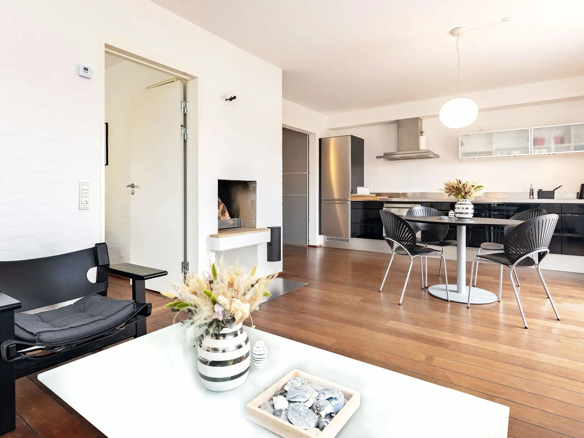 Die Wohnung befindet sich im Erdgeschoss. Den Mittelpunkt bildet die große Wohnküche mit moderner Ausstattung, schönem Essbereich und gemütlichem Wohnzimmer mit schönem Kamin und bequemen Möbeln. Zur hochwertigen Einrichtung der Ferienhäuser gehören eine Küche der Firma Gaggenau und Mobiliar von Casa Marc Italy. Der Kamin im Wohnzimmer sorgt bei Einbruch der Dunkelheit für eine besonders wohliche Atmosphäre.