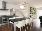 Die Wohnung befindet sich im Erdgeschoss und hat eine großen Küchen-/Wohnbereich für das Familienleben mit moderner Einrichtung, schönem Kamin und stilvollem Mobiliar. Die geschmackvolle Einrichtung der Ferienhäuser besteht u.a. aus einer Küche der hochwertigen Marke Gaggenau und Möbeln von Casa Marc Italy. Vom Küchen-/Wohnbereich hat man direkten Zugang zur Terrasse. Das Badezimmer des Ferienhauses ist mit Dusche, WC und Waschbecken ausgestattet.