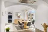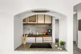 Die Küche ist mit Kühlschrank ausgestattet. Außerdem gibt es 4 Induktions-Kochzonen, Umluftofen, Mikrowelle sowie Geschirrspüler.