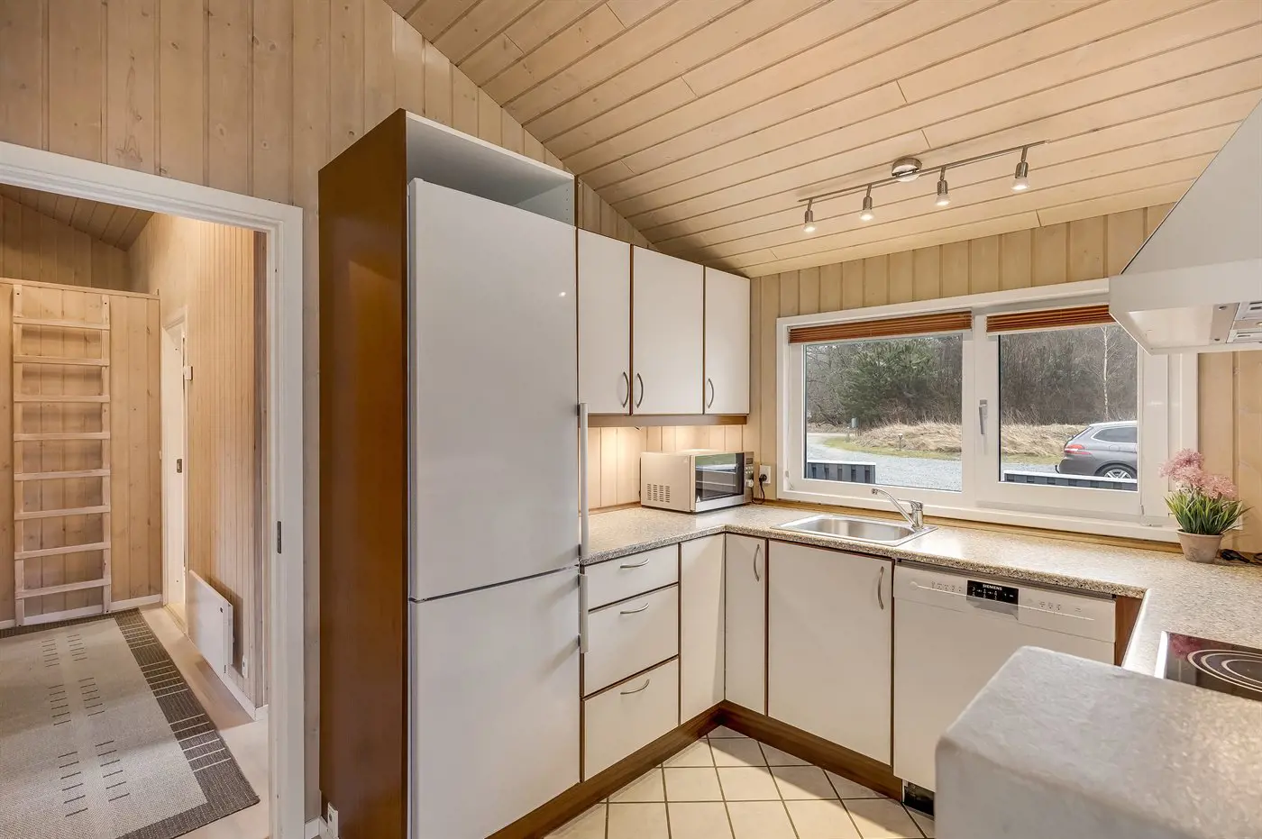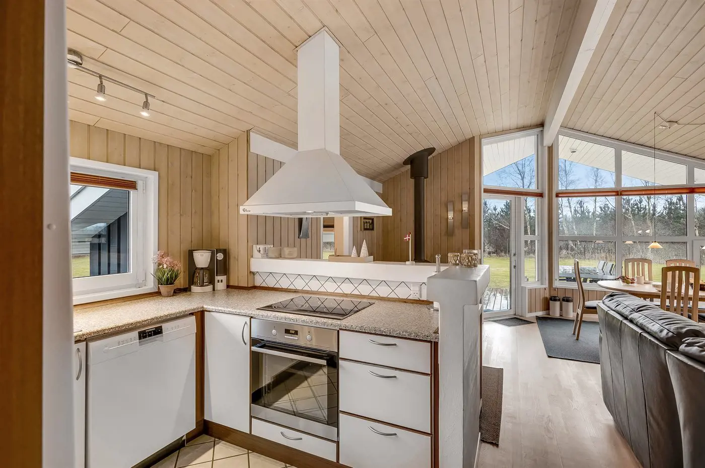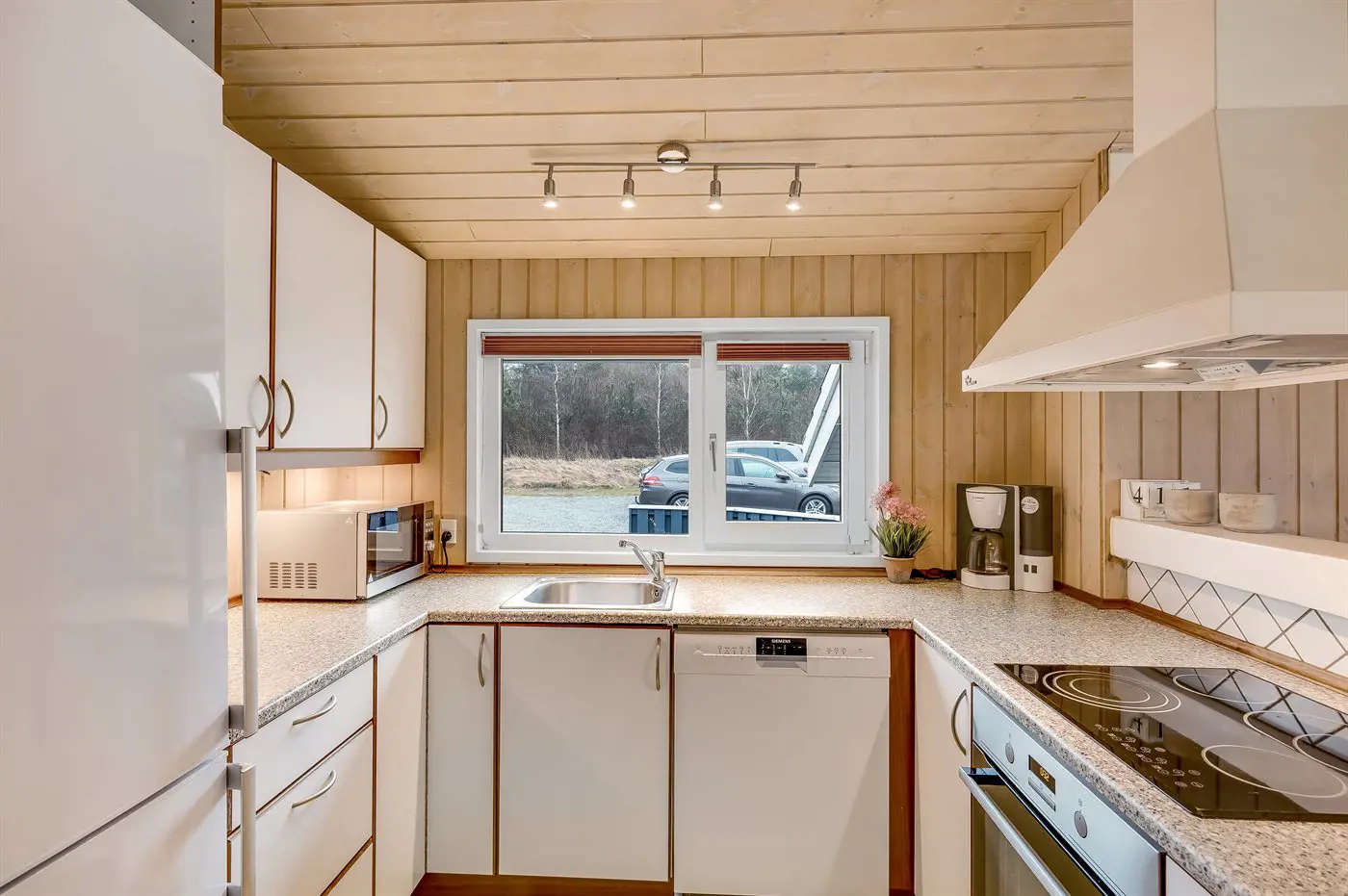 Die Küche ist mit Kühlschrank ausgestattet. Außerdem gibt es 4 Keramik-Kochfelder, Umluftofen, Mikrowelle, Airfryer sowie Geschirrspüler.