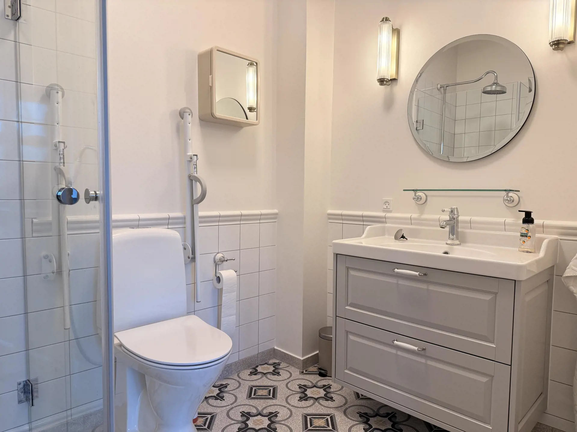 Das Badezimmer ist hell und einladend mit Duschkabine, und die gesamte Wohnung präsentiert sich funkelnagelneu und funktional mit entspannter Urlaubsatmosphäre.