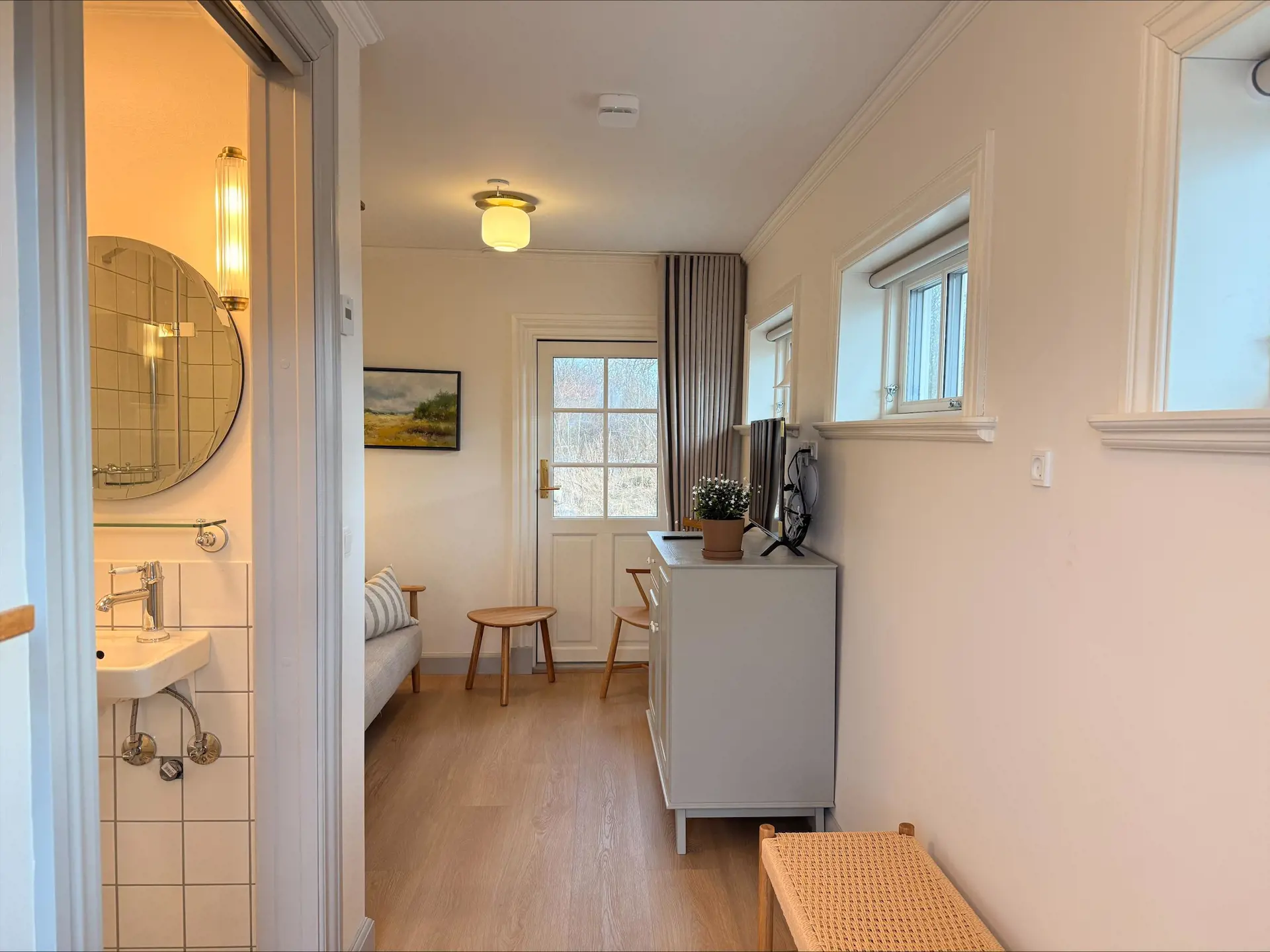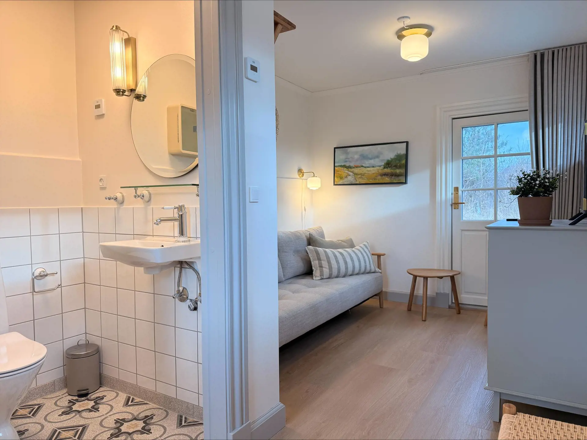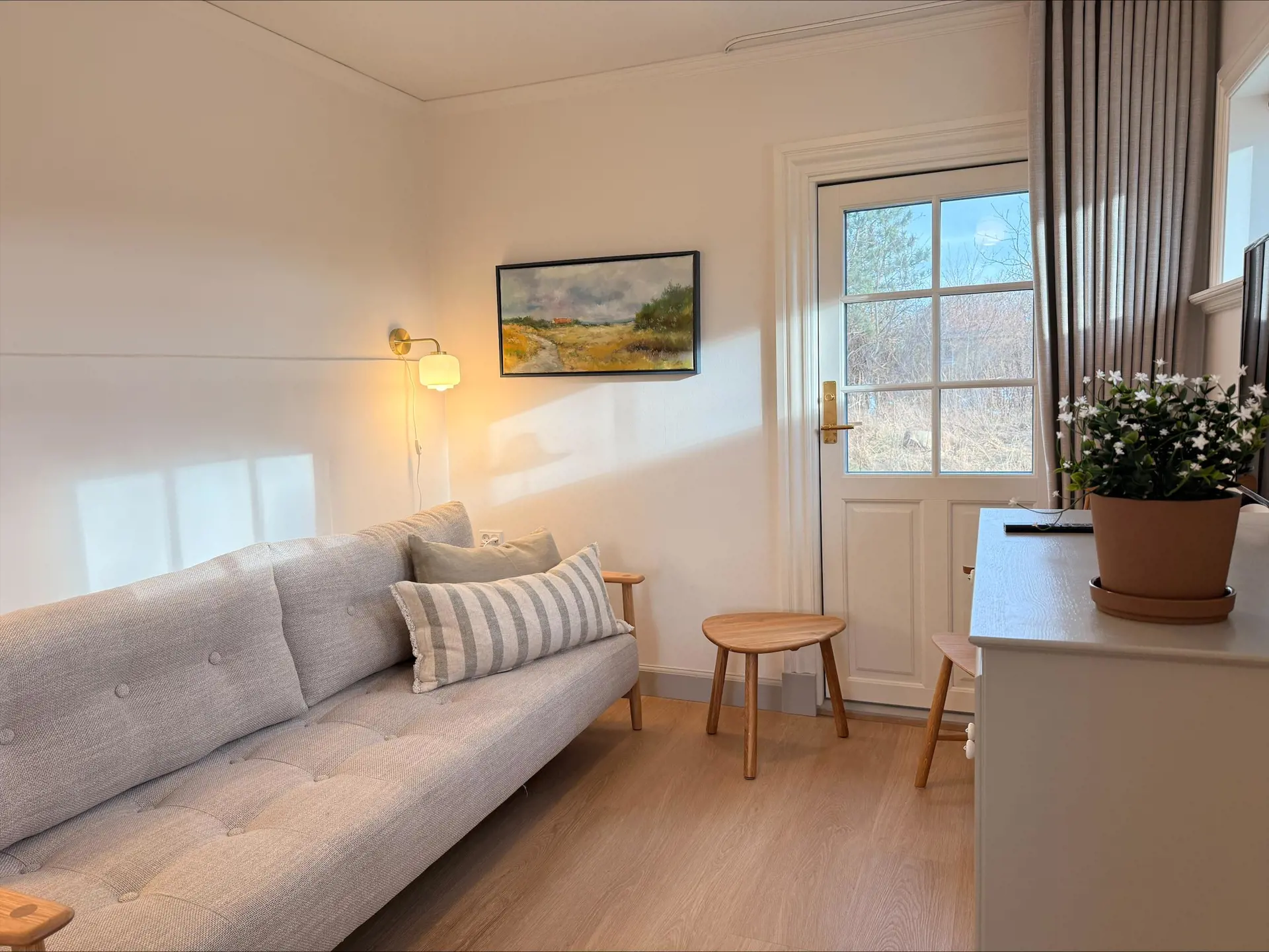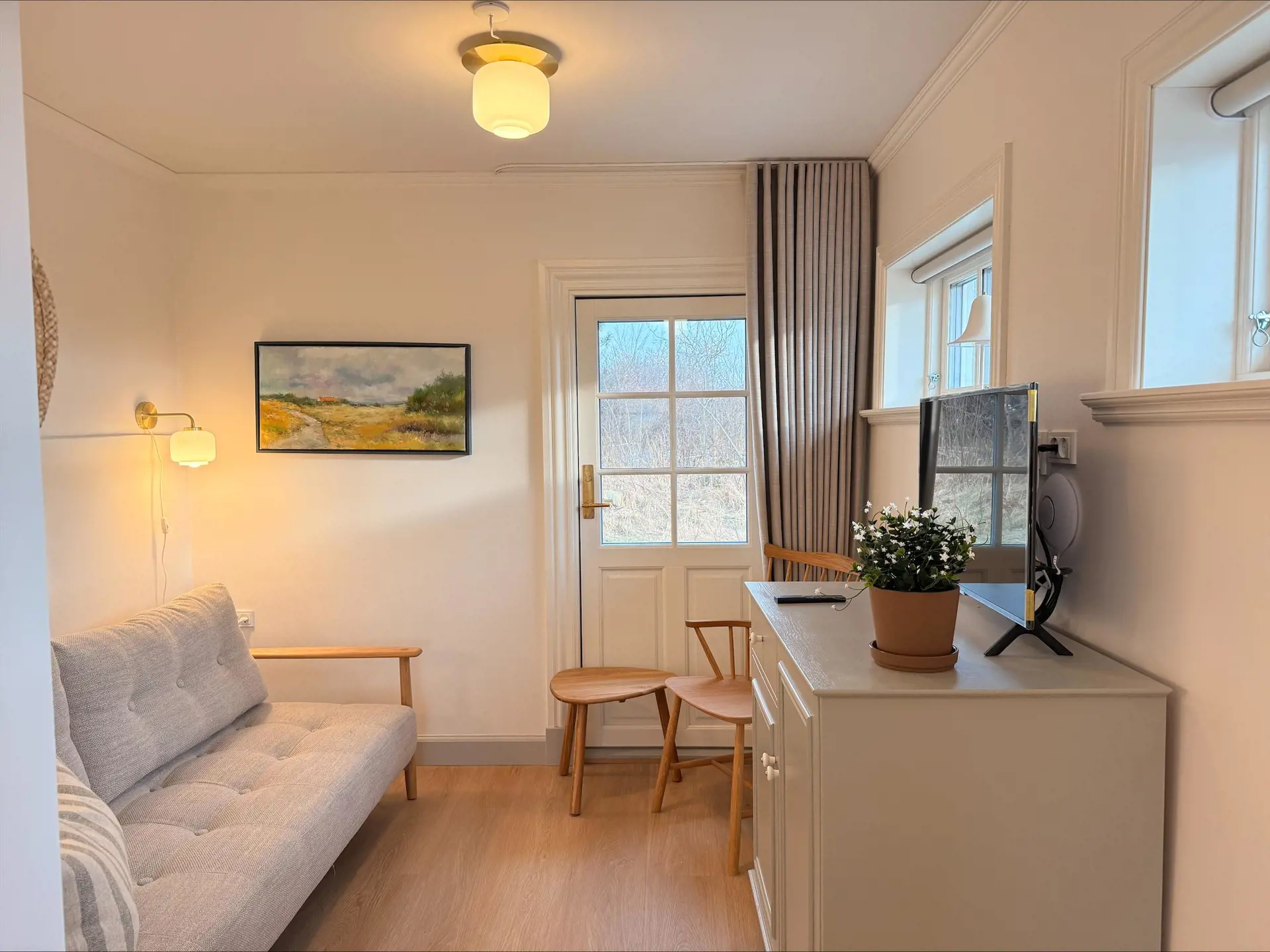 Gemütliches und gut eingerichtetes Doppelzimmer in der Tversted Badepension. Das Zimmer trägt die Nummer 9 und heißt außerdem „Rundbladet Suldug“. Es ist Teil des besonderen Konzepts der Badepension – alle Zimmer und Apartments sind nach Kräutern und Pflanzen benannt. Speisesaal und Aufenthaltsräume sind mit schönen Möbeln aus den alten Eisbrechern Danbjørn und Isbjørnen eingerichtet.