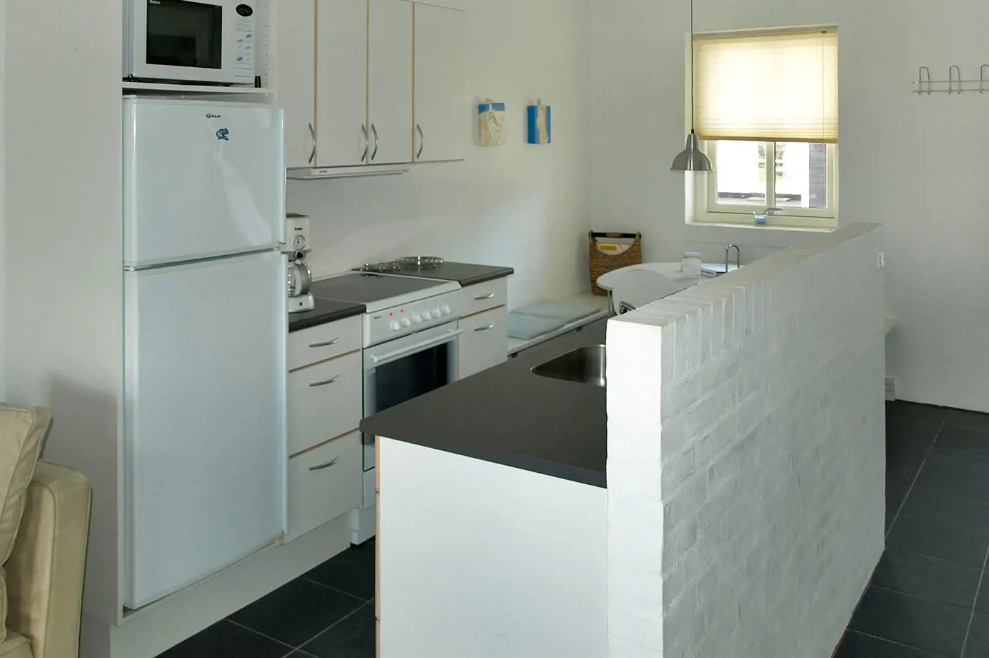 Die Küche ist mit Kühlschrank ausgestattet. Außerdem gibt es 4 Keramik-Kochfelder, Umluftofen, Mikrowelle sowie Geschirrspüler.