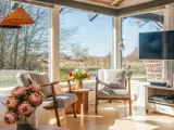 Vom Wohnzimmer aus gelangt man auf die Terrasse mit Blick auf die Landschaft. Es gibt zwei Badezimmer, die beide 2025 renoviert wurden, eines davon mit Zugang zur Sauna.