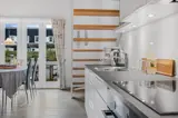 Die Küche ist mit Kühlschrank ausgestattet. Außerdem gibt es 4 elektrische Kochplatten, Umluftofen sowie Geschirrspüler.