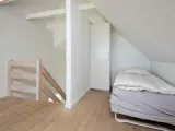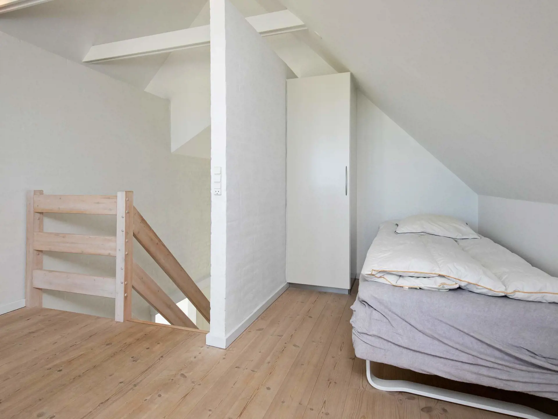 zur Verfügung. Der große Raum bietet auch Zugang zur Südterrasse des Hauses. Zudem führt vom Wohnbereich eine Treppe hinauf ins Dachgeschoss, wo es ein großes Wohnzimmer mit Balkon davor, der Ausblick zur herrlichen Dünenlandschaft bietet.