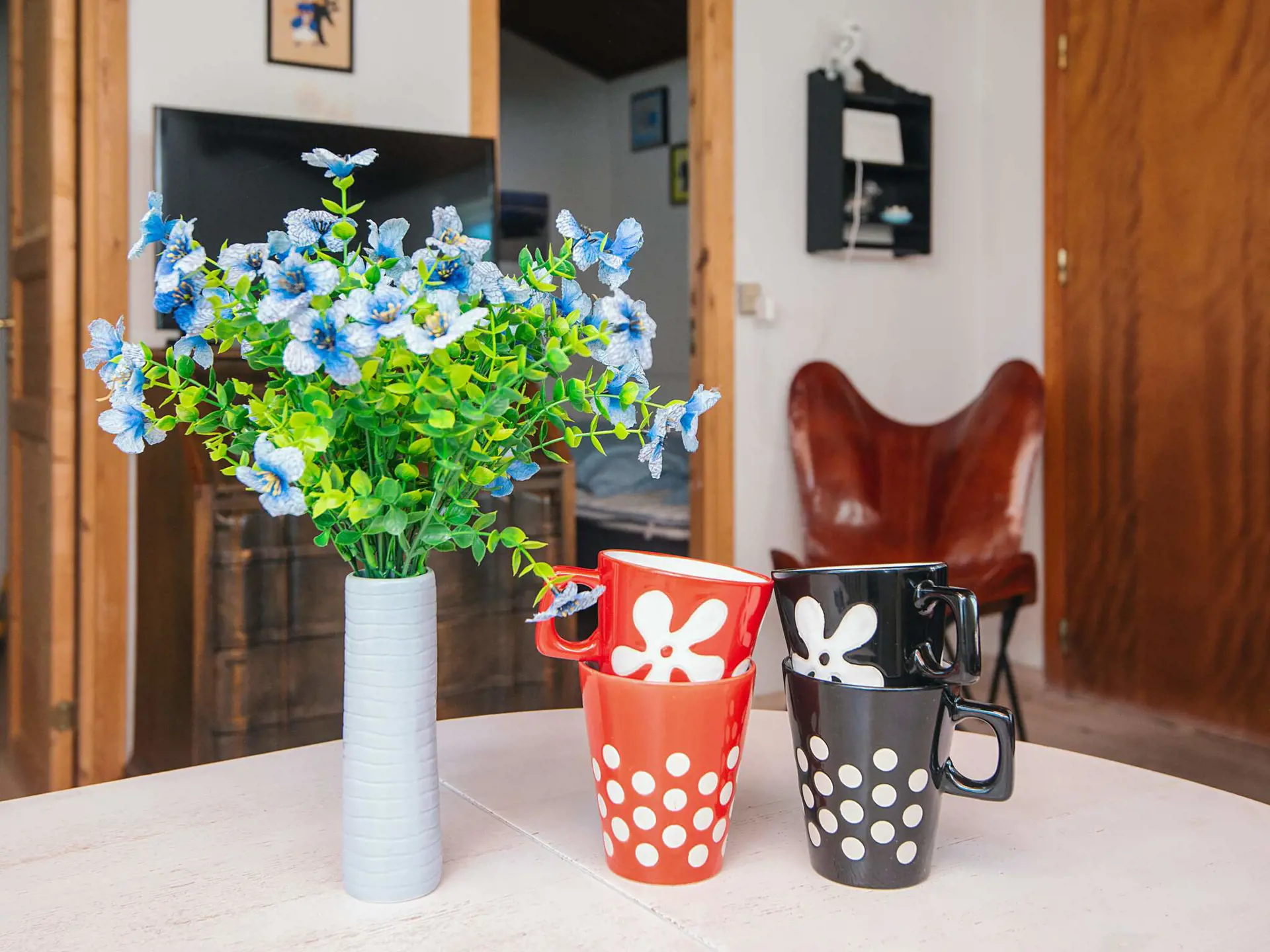 Das Ferienhaus verfügt über ein Wohnzimmer mit Essbereich, TV mit Chromecast und WLAN. Außerdem gibt es einen Holzofen für kühlere Abende. Offene Küche mit Geschirrspüler, Kühlschrank mit Gefrierfach. Zudem drei Schlafzimmer; eines mit Doppelbett, die anderen beiden mit je einem Einzelbett. Badezimmer mit Dusche. Waschmaschine im Nebengebäude.