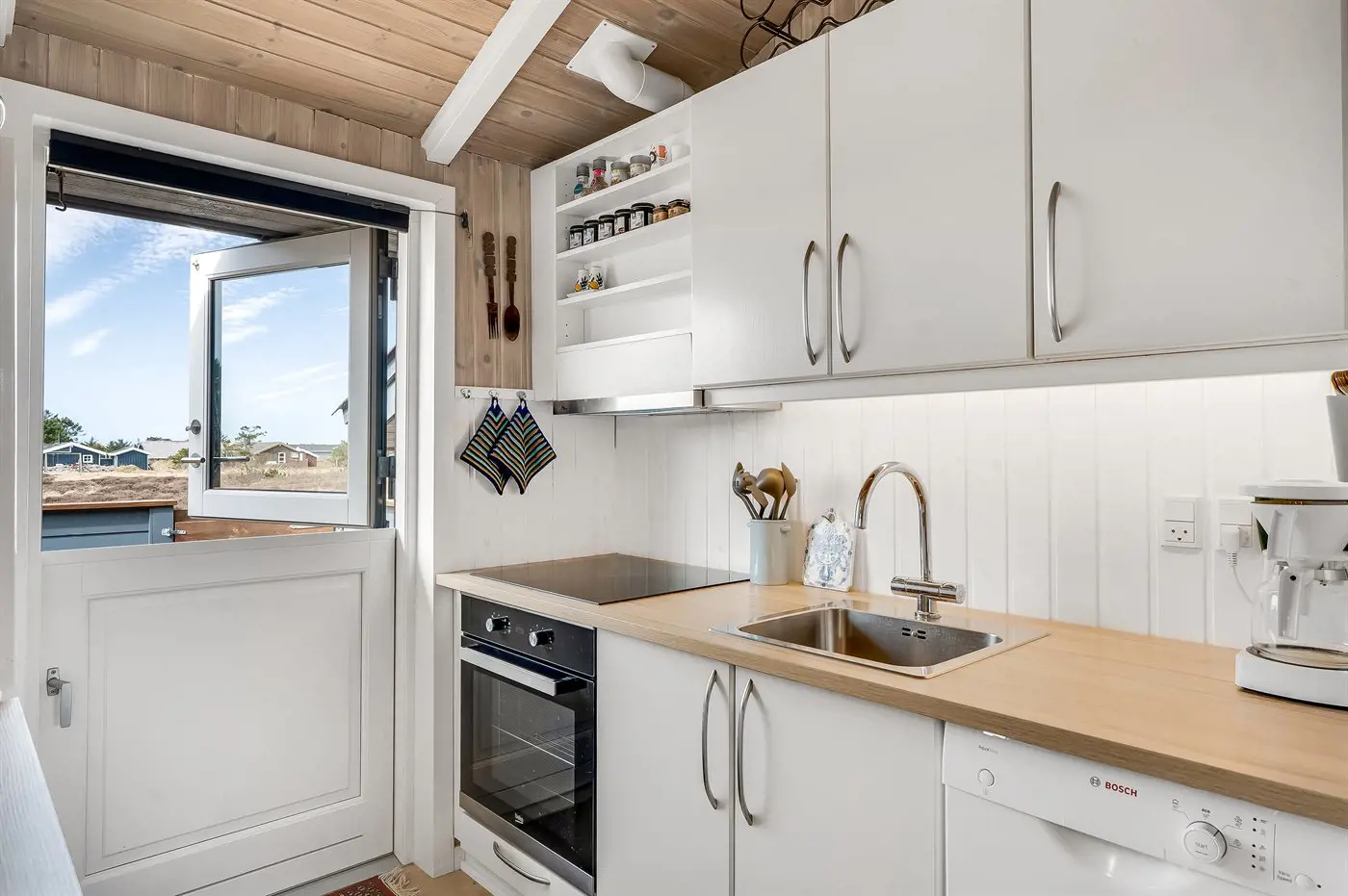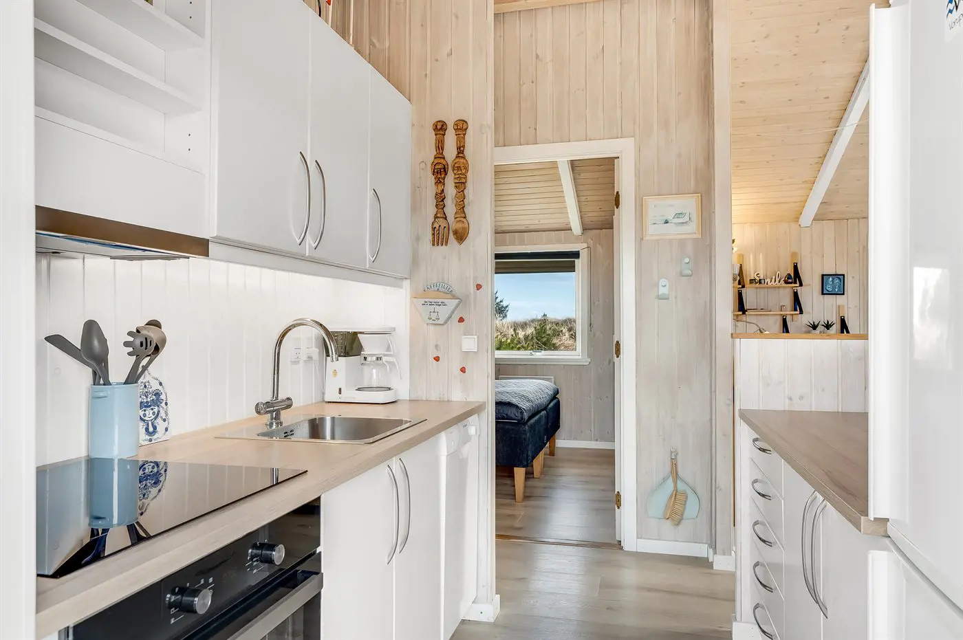Die Küche ist mit Kühlschrank ausgestattet. Außerdem gibt es 4 Induktions-Kochzonen, Umluftofen sowie Geschirrspüler.