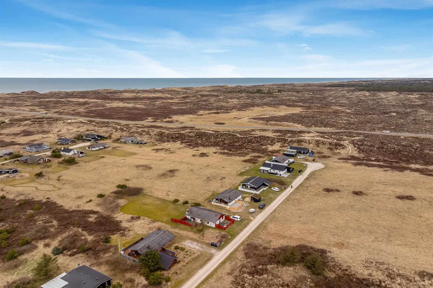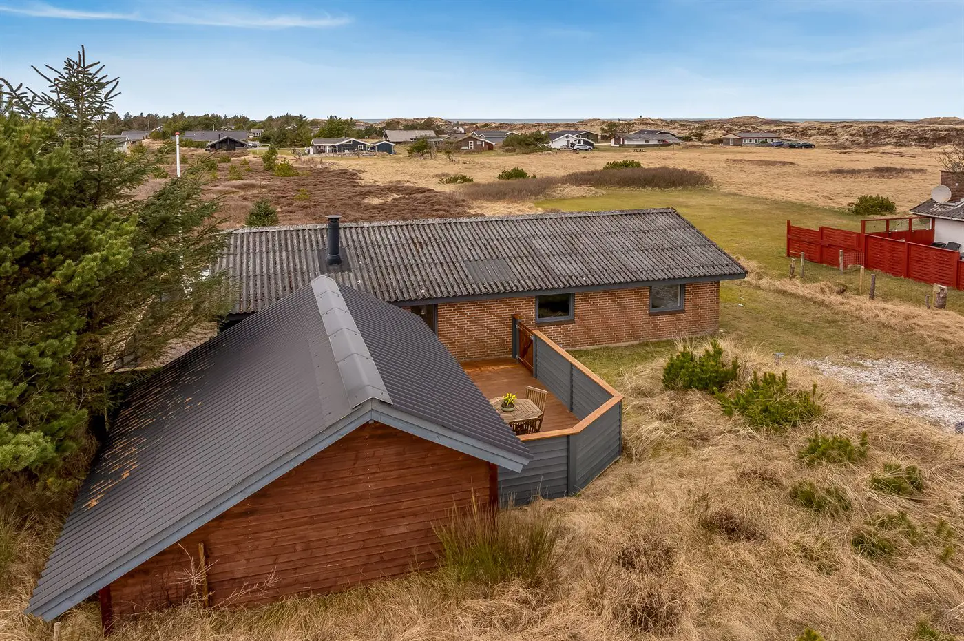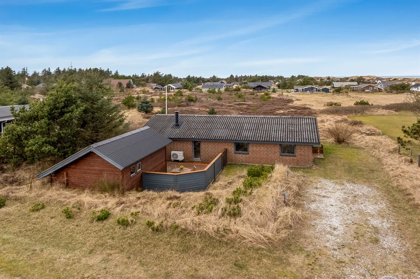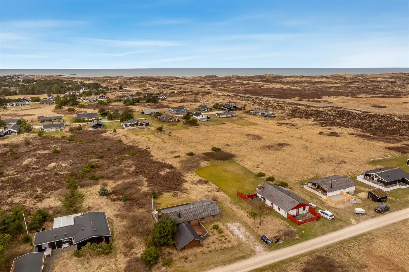 Die Ferienunterkunft liegt auf einem 1970 m² großen Dünengrundstück. Die Entfernung zum Meer beträgt 900 m. Die nächste Einkaufsmöglichkeit liegt 1500 m entfernt. Es steht ein offenes Terrassenareal zur Verfügung. Außerdem gibt es überdachte Terrasse. Geräteraum. Es steht ein Grill zur Verfügung. Parkplatz auf dem Grundstück.