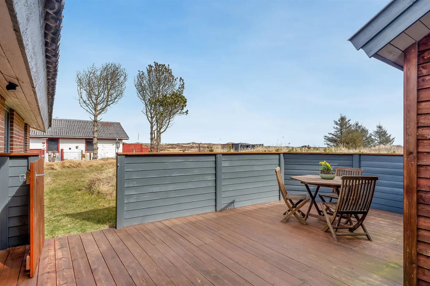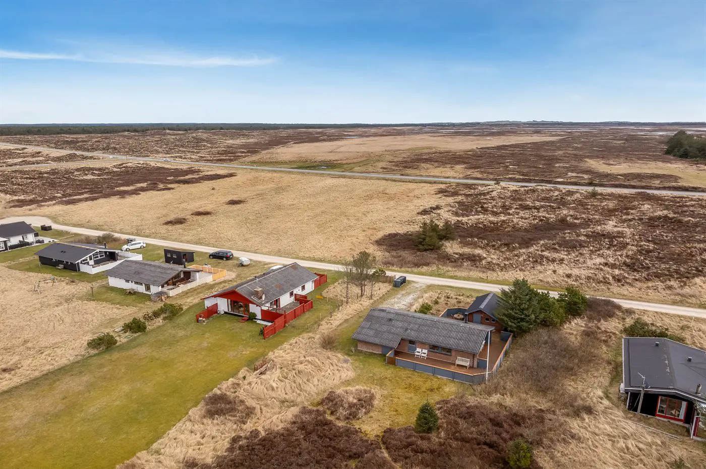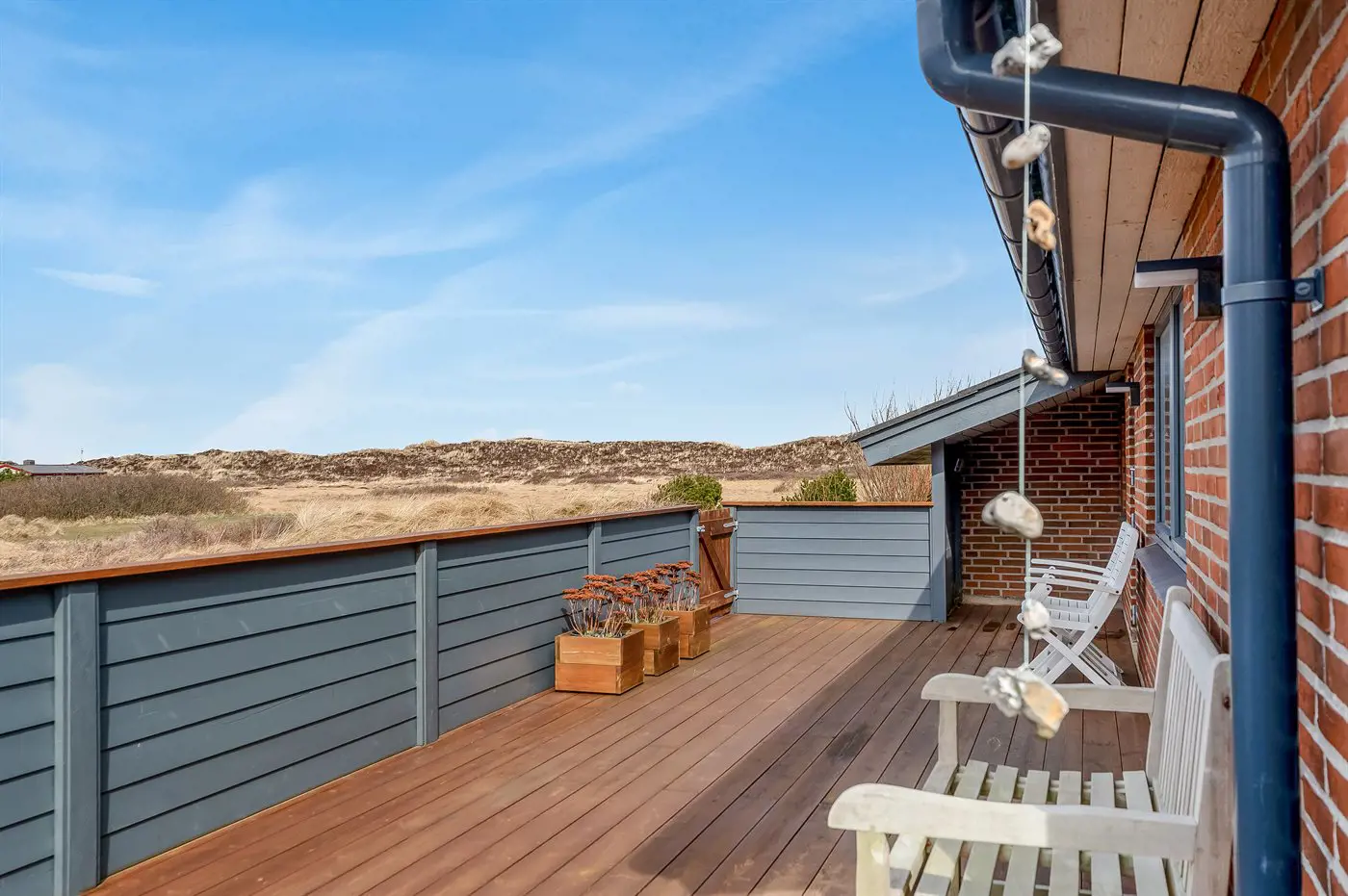 Die Ferienunterkunft liegt auf einem 1970 m² großen Dünengrundstück. Die Entfernung zum Meer beträgt 900 m. Die nächste Einkaufsmöglichkeit liegt 1500 m entfernt. Es steht ein offenes Terrassenareal zur Verfügung. Außerdem gibt es überdachte Terrasse. Geräteraum. Es steht ein Grill zur Verfügung. Parkplatz auf dem Grundstück.
