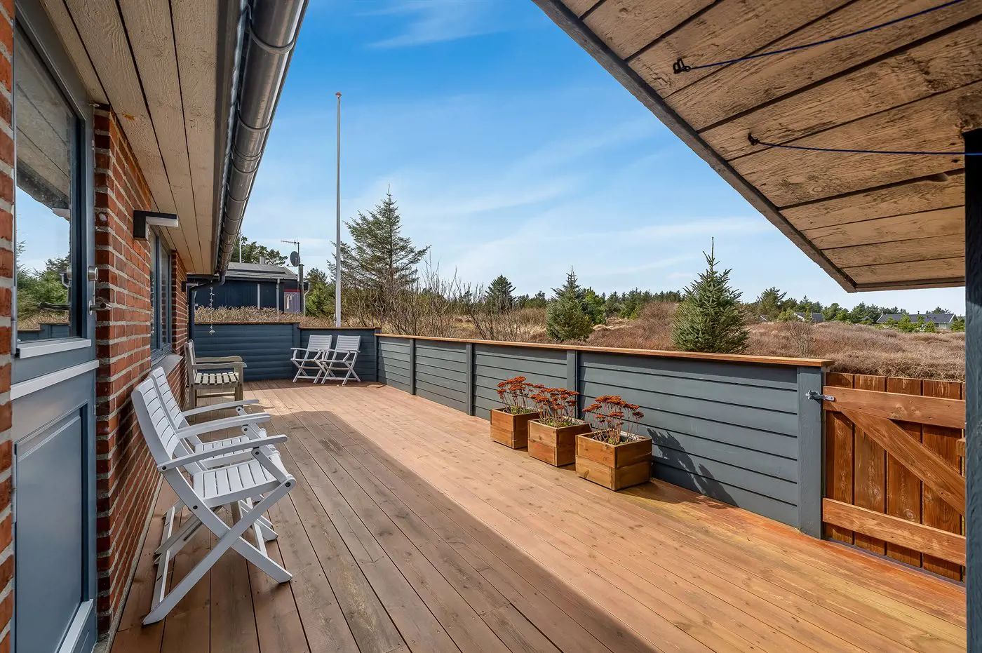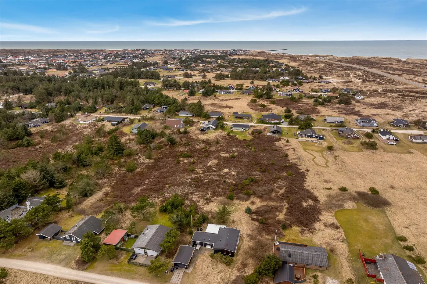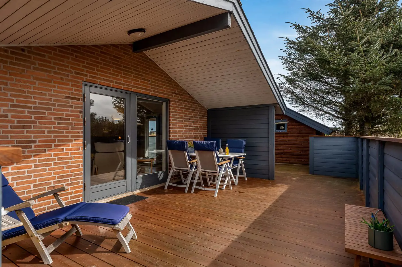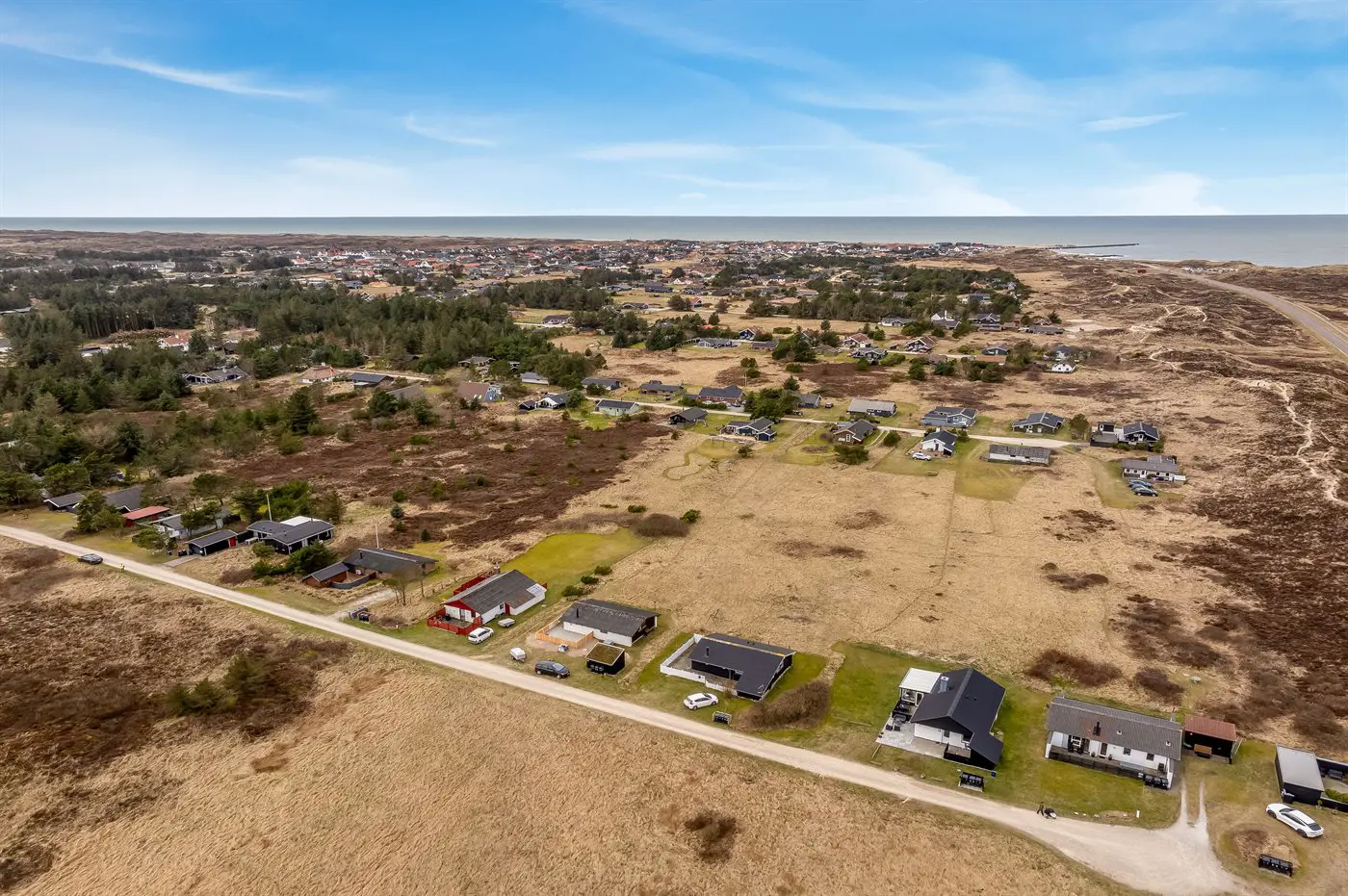 Die Ferienunterkunft liegt auf einem 1970 m² großen Dünengrundstück. Die Entfernung zum Meer beträgt 900 m. Die nächste Einkaufsmöglichkeit liegt 1500 m entfernt. Es steht ein offenes Terrassenareal zur Verfügung. Außerdem gibt es überdachte Terrasse. Geräteraum. Es steht ein Grill zur Verfügung. Parkplatz auf dem Grundstück.