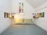 Das Ferienhaus ist mit einem offenen Küchen-/Wohnbereich mit Essecke und Holzofen, einem kleinen Badezimmer und zwei Schlafzimmern ausgestattet. Im Nebengebäude befindet sich ein weiteres Schlafzimmer mit zwei Einzelbetten. Im Haus befindet sich ein Fernseher, auf dem Sie Ihre eigenen TV-Dienste streamen können. Die Einrichtung ist hell und funktional gestaltet.