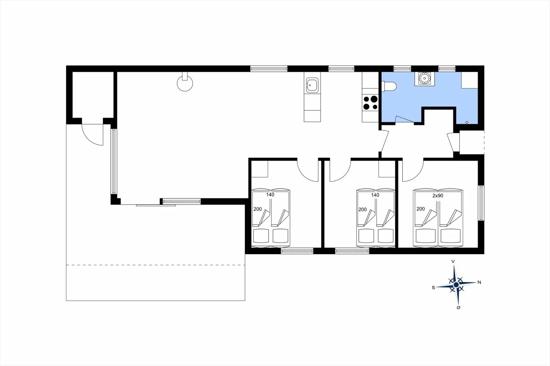 Das Haus liegt auf einem uneinsehbaren Grundstück in einer landschaftlich schönen und kinderfreundlichen Gegend in Nr. Fjand. Vom Wohnraum aus gelangen Sie auf die überdachte Terrasse, die nach Süden, Osten und Westen ausgerichtet ist – so finden Sie den ganzen Tag über sowohl Sonne als auch geschützte Plätze.