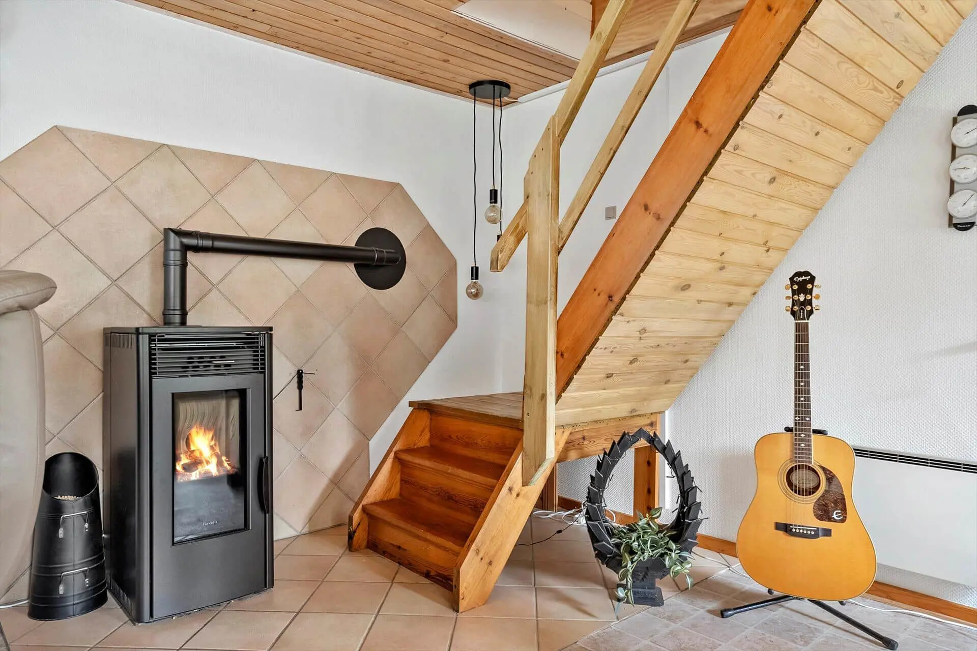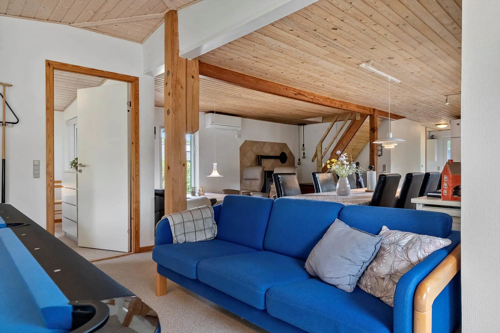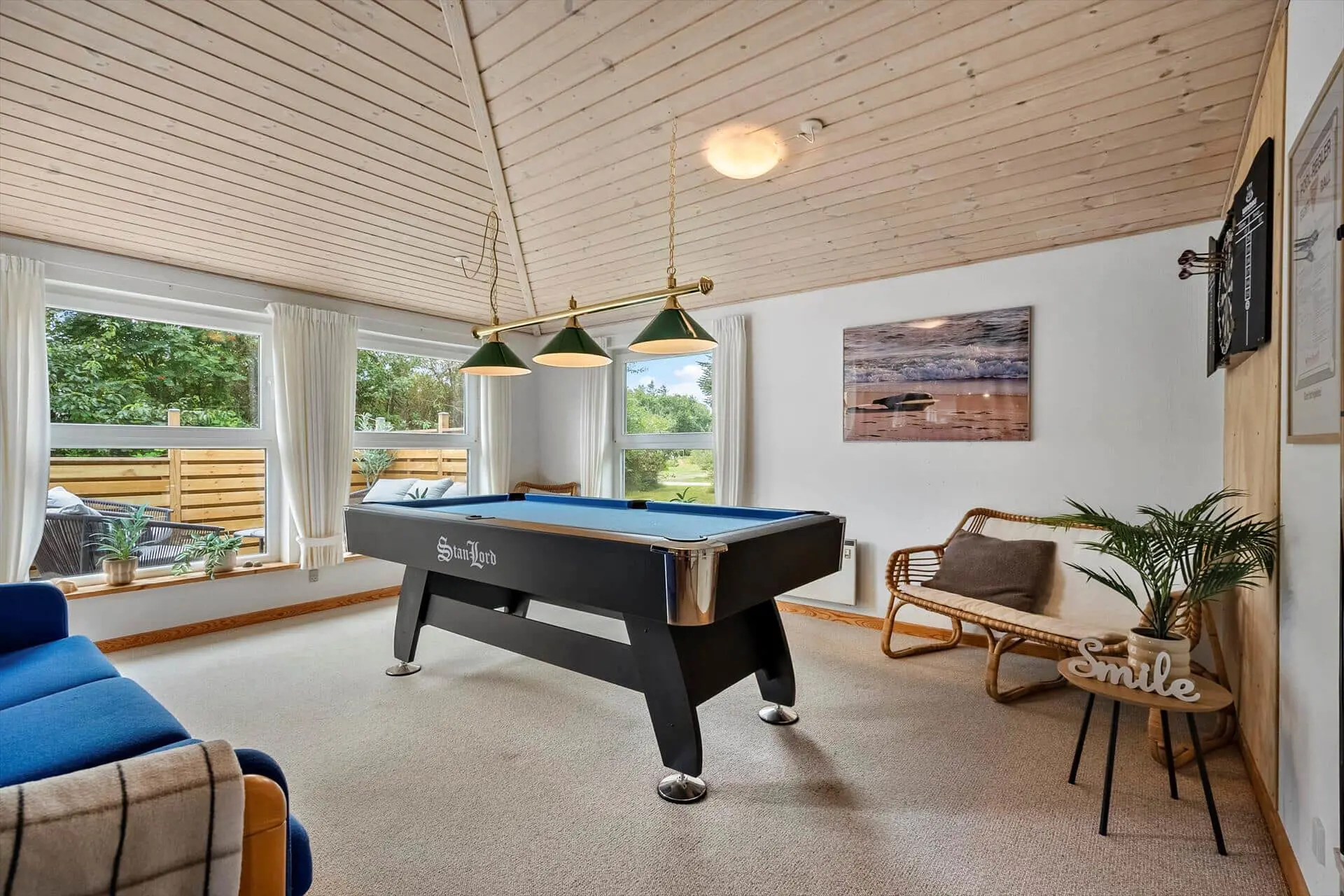 Hier erwarten Sie die besten Voraussetzungen für einen Urlaub voller Gemütlichkeit, gemeinsamer Stunden und schöner Erlebnisse. Das Holzferienhaus ist mit viel Liebe zum Detail eingerichtet und bietet sowohl Entspannung als auch Unterhaltung. Der große Wohnbereich verbindet Küche, Essplatz und Wohnzimmer, sodass alle zusammen sein können – ob beim Kochen, beim Lesen eines Buches oder beim gemütlichen Beisammensein am knisternden Kaminofen mit einer Tasse Kaffee. Am Ende des Wohnzimmers gibt es zusätzlichen Ferienspaß: ein kleiner Bereich mit Billard und Darts – perfekt für spannende Wettkämpfe für Groß und Klein. Hier ist Platz für die ganze Familie, und die Atmosphäre ist herzlich und einladend.