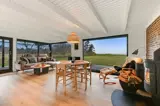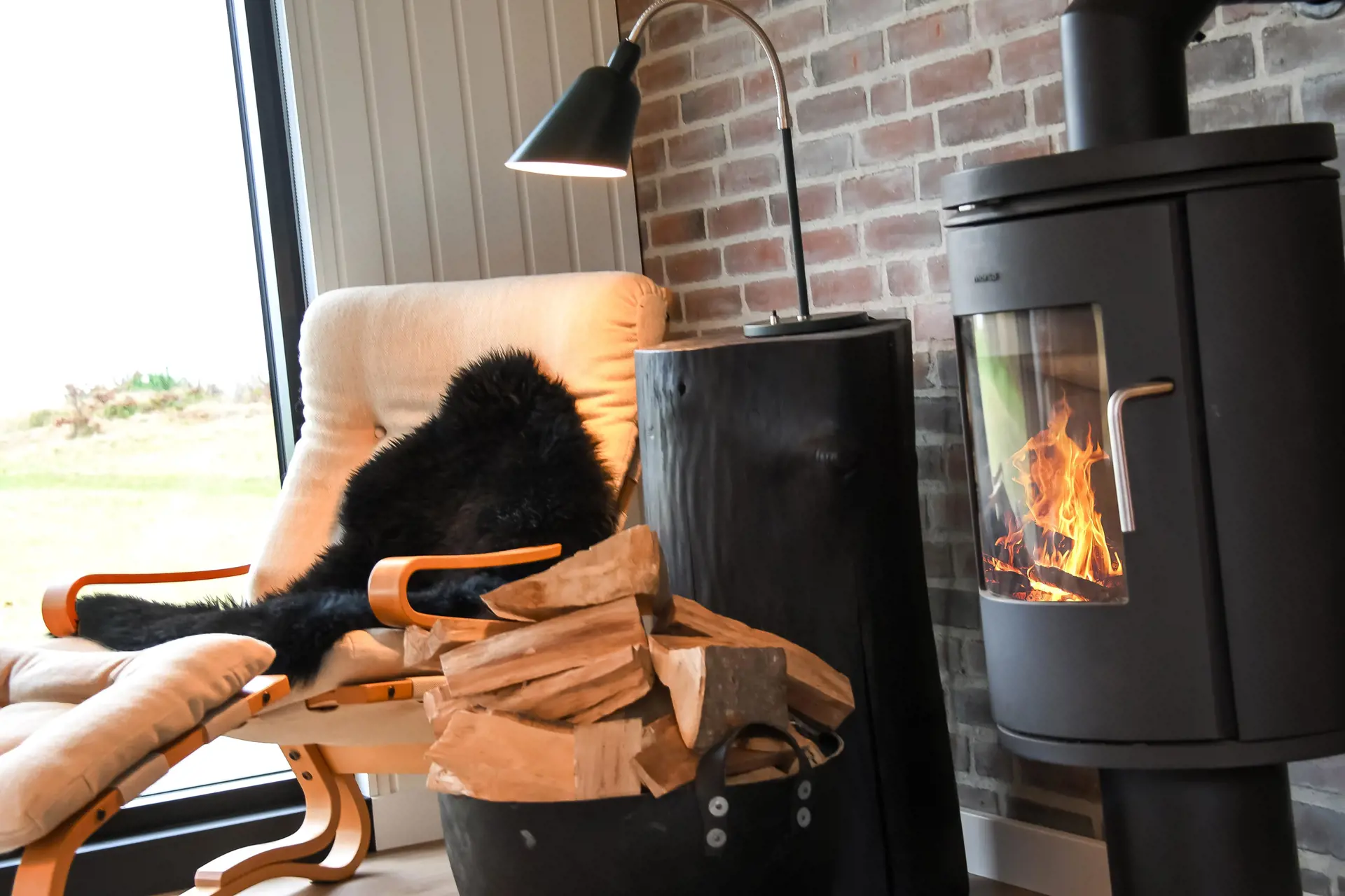 Im Wohnzimmer sorgt der Kaminofen für Gemütlichkeit, während große Fensterfronten den Blick auf den Fjord freigeben – ob beim Essen am Tisch oder beim Entspannen auf dem Sofa, die Aussicht ist stets präsent.