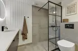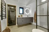 Das stilvolle Badezimmer ist mit Dusche, Waschmaschine und Trockner ausgestattet und bietet direkten Zugang zur Sauna, in der ihr euch nach einem Tag an der frischen Westseeluft wunderbar entspannen könnt.