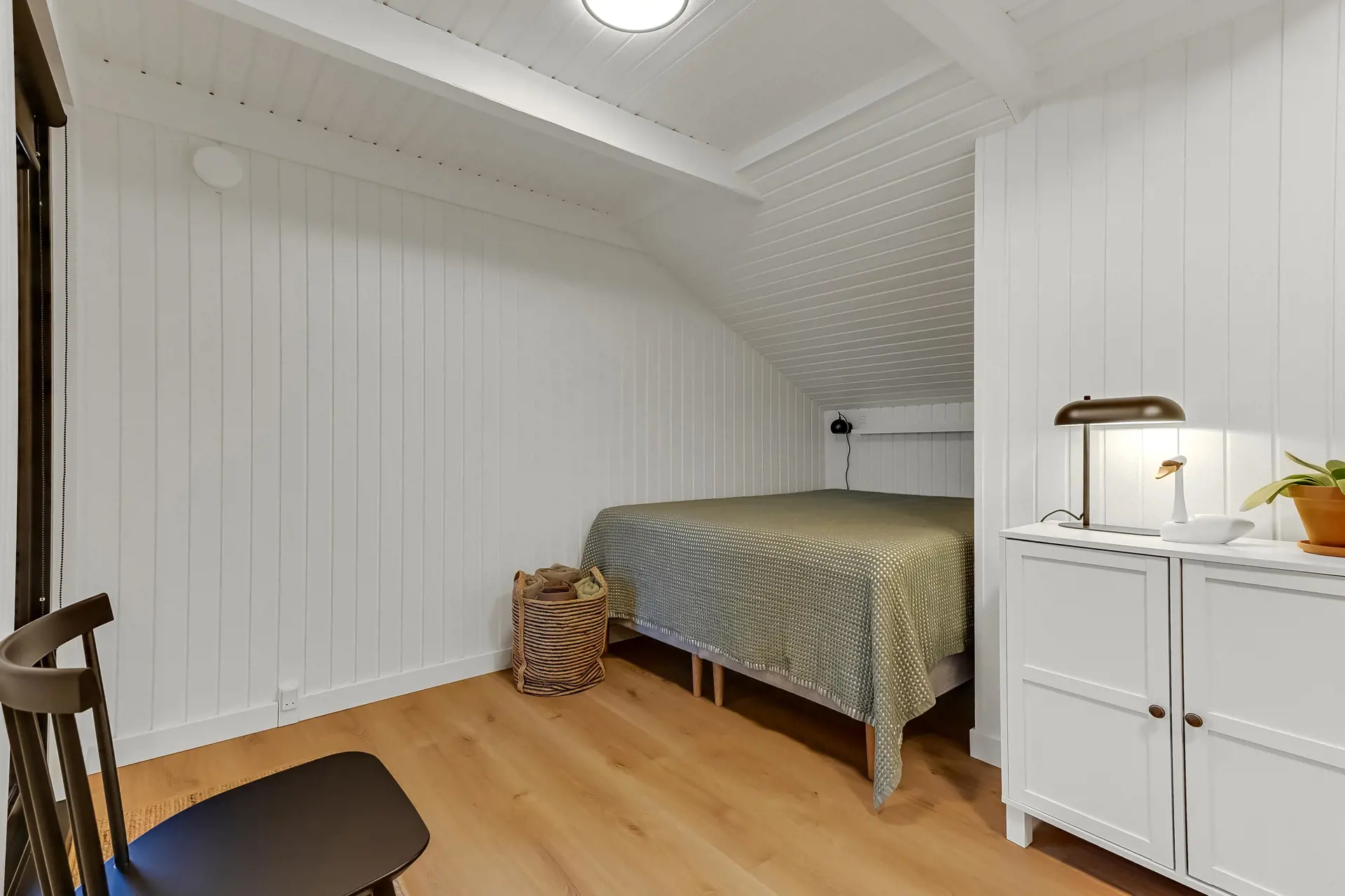 Das 86 m² große Ferienhaus verfügt über einen einladenden Eingangsbereich, ein gemütliches Schlafzimmer mit einem kleineren Doppelbett sowie ein großes Schlafzimmer mit verstellbarem Bett und einer beeindruckenden Panoramaaussicht über den Fjord – ein Raum, der ganz für sich Ruhe und Erholung ausstrahlt.