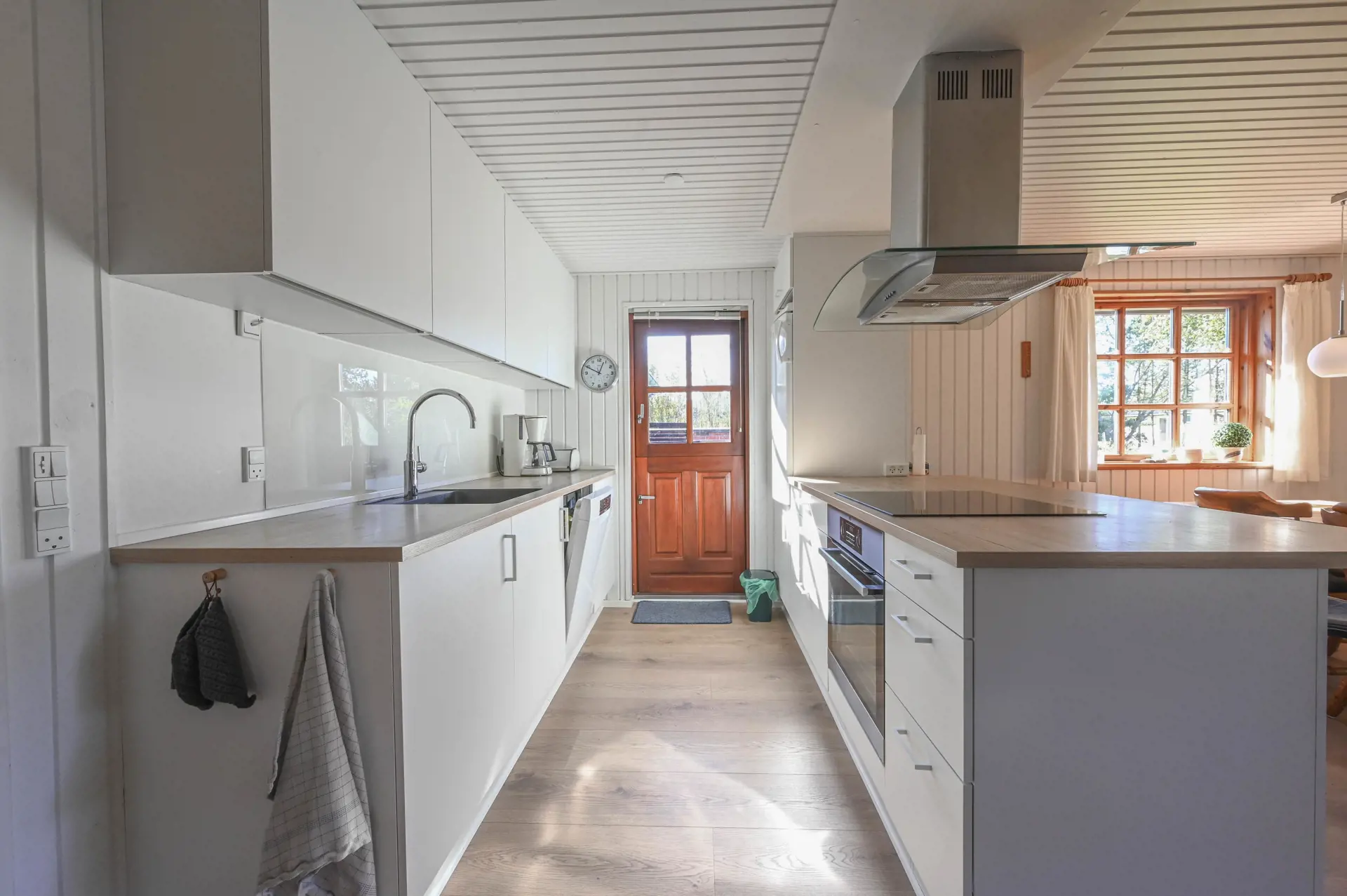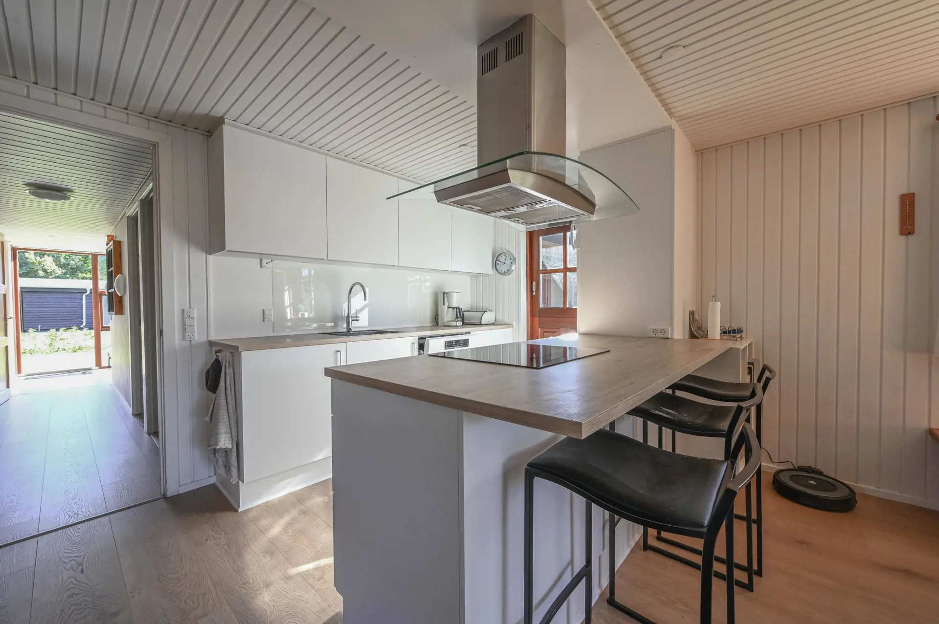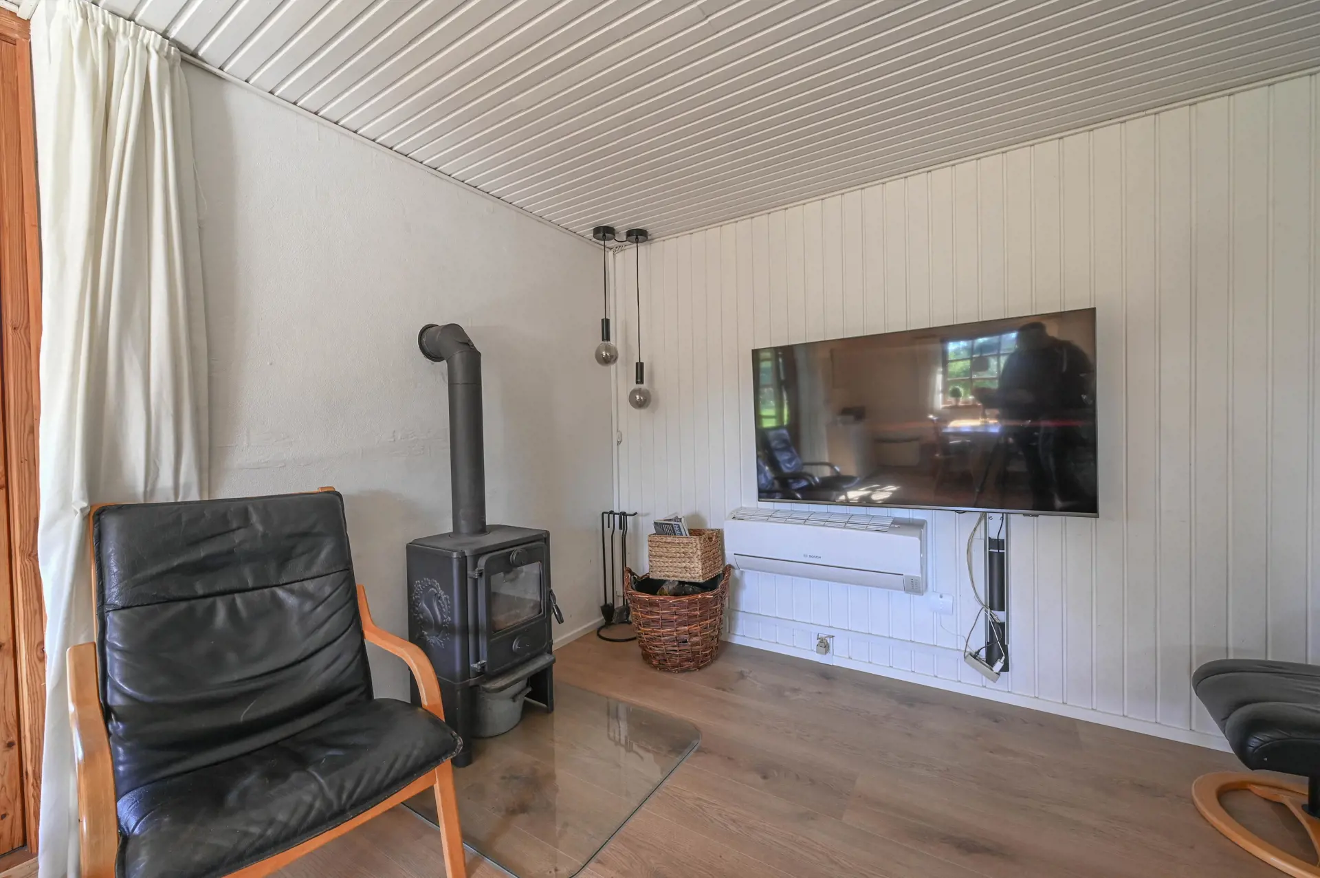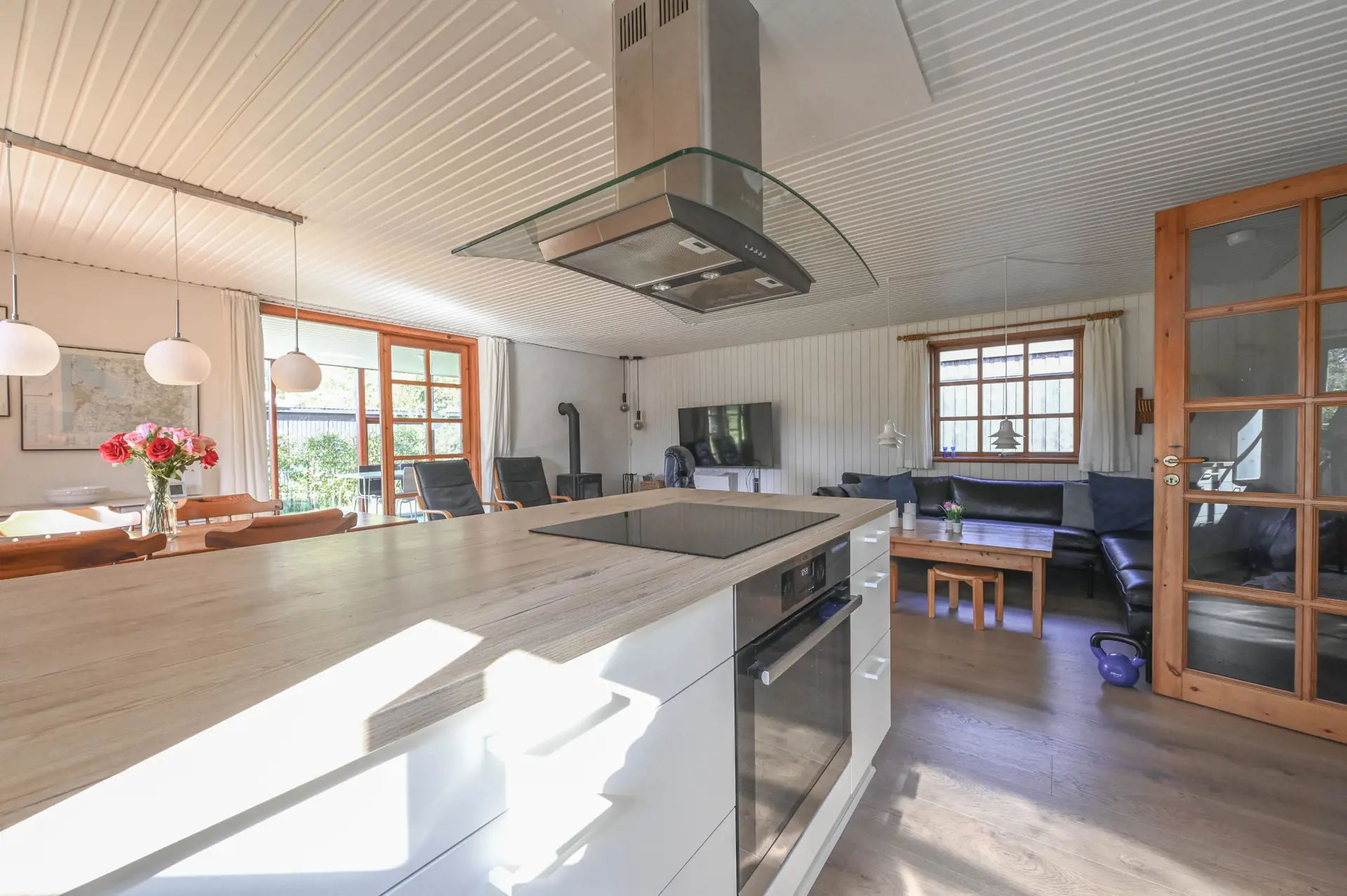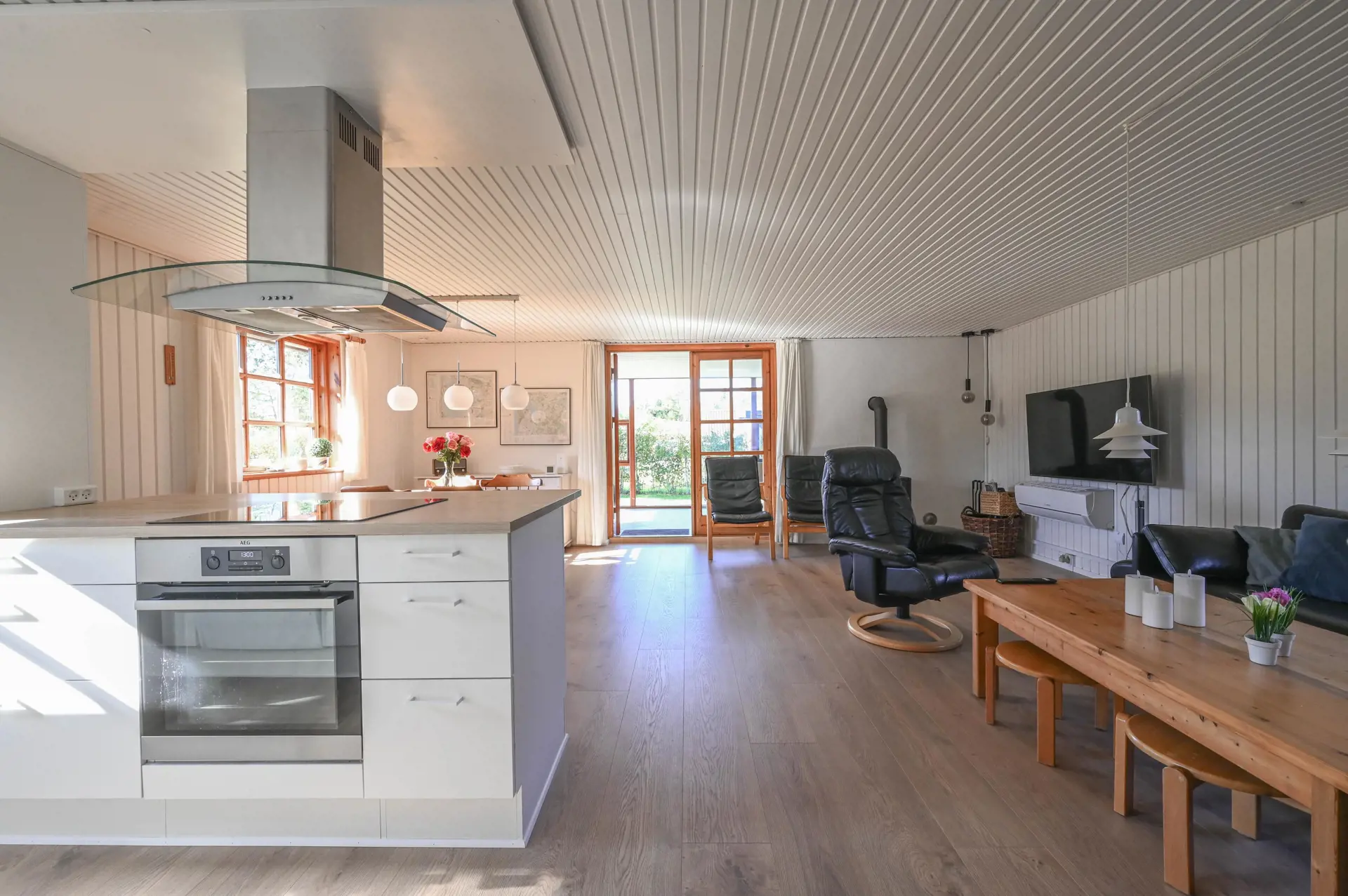 Das Haus verfügt über zwei Badezimmer mit Dusche sowie einen separaten Wellnessbereich mit Whirlpool und Zugang zur Sauna – ideal zum Entspannen nach einem Spaziergang am Fjord. Die offene Küche ist mit dem Wohnzimmer verbunden, wo ein Kaminofen, ein Flachbild-TV und ein bequemer Sitzbereich für gemütliche Abende sorgen. Vom Wohnzimmer aus gelangst du in einen hellen Wintergarten, in dem du die Sonne und den Blick ins Grüne genießen kannst – auch an kühleren Tagen.