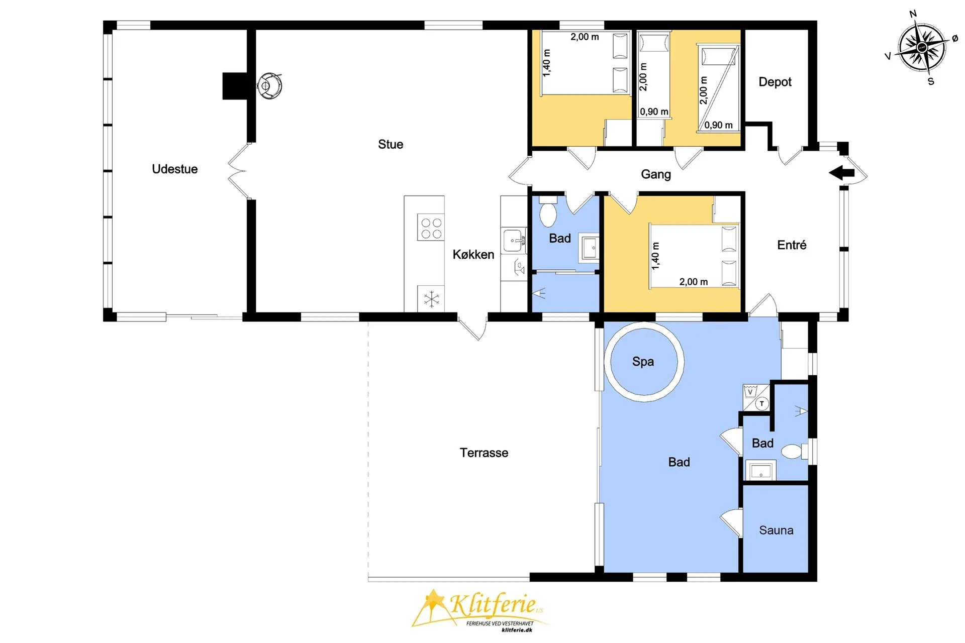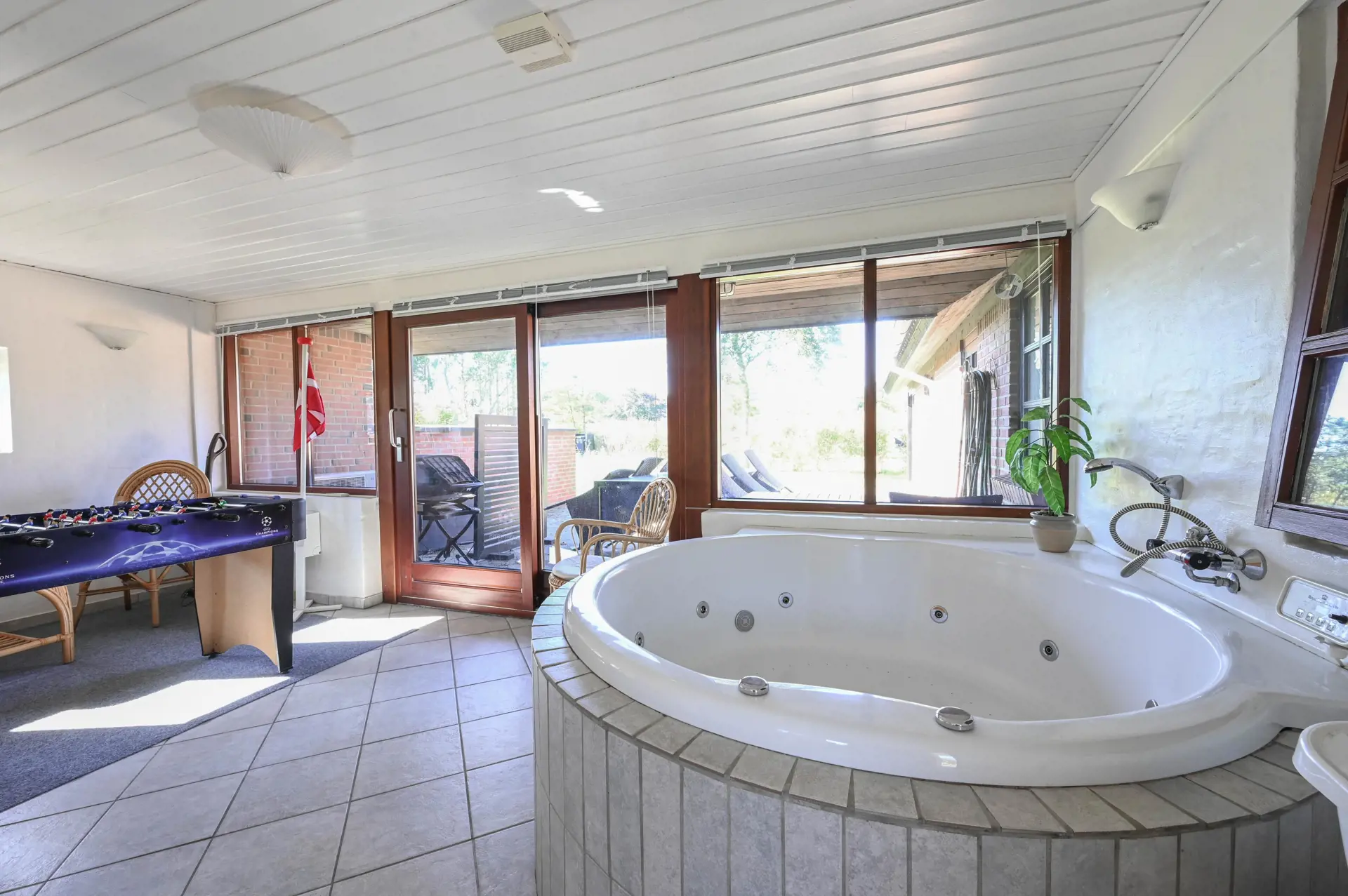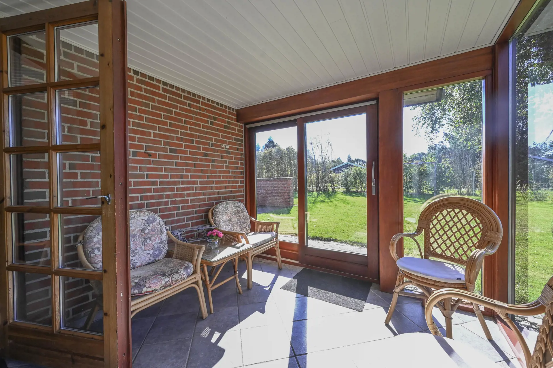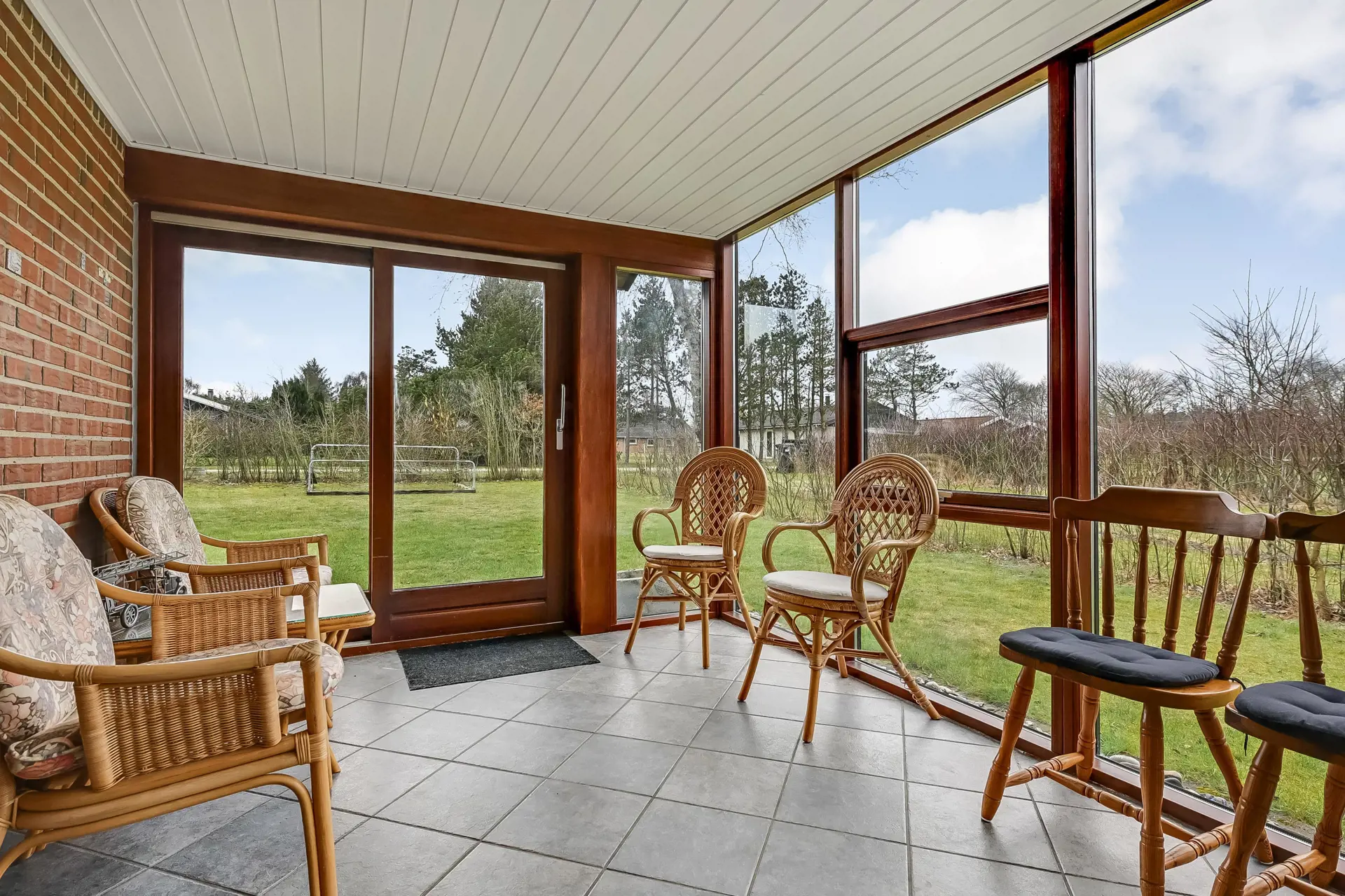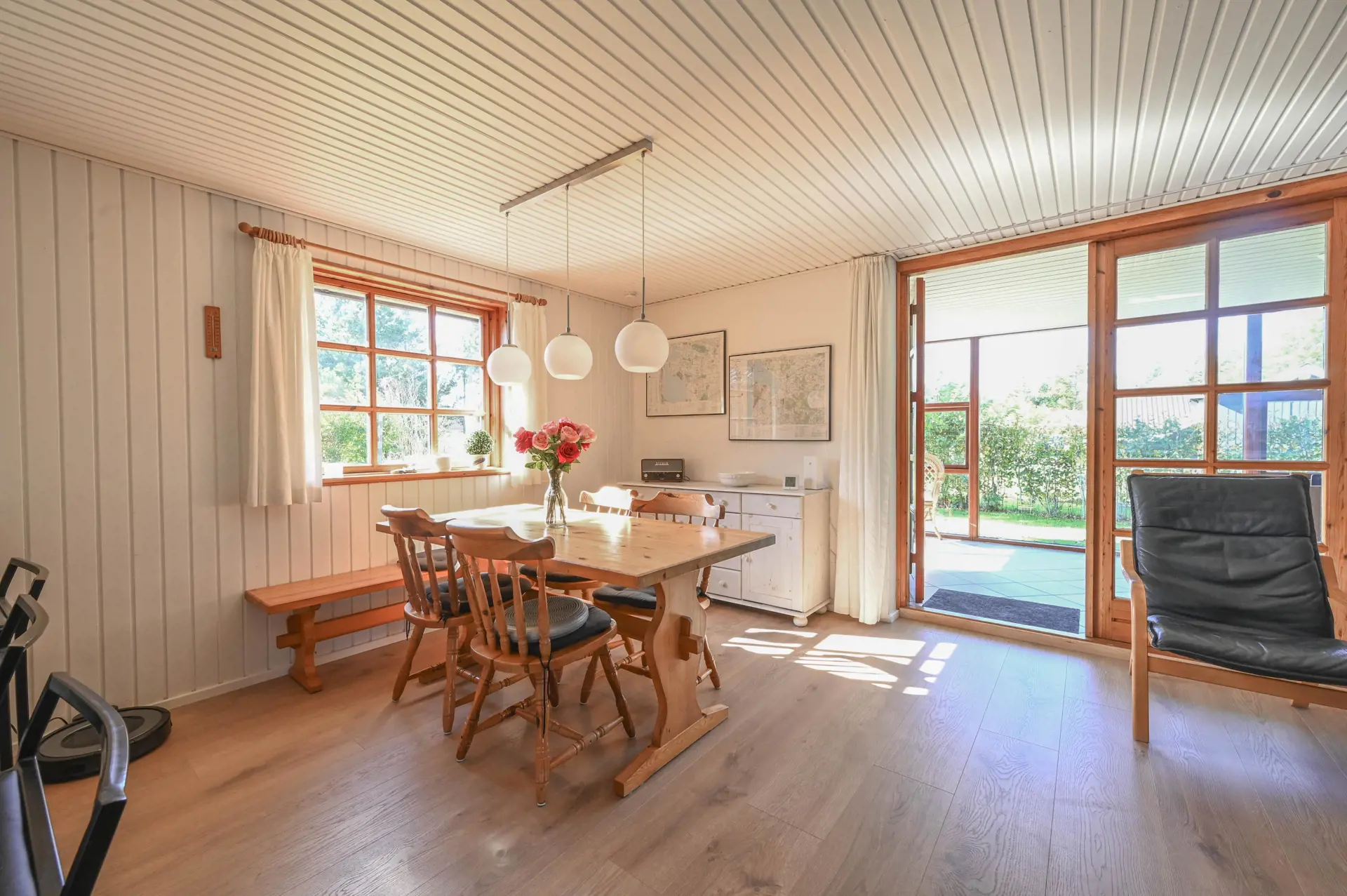 Das Haus verfügt über zwei Badezimmer mit Dusche sowie einen separaten Wellnessbereich mit Whirlpool und Zugang zur Sauna – ideal zum Entspannen nach einem Spaziergang am Fjord. Die offene Küche ist mit dem Wohnzimmer verbunden, wo ein Kaminofen, ein Flachbild-TV und ein bequemer Sitzbereich für gemütliche Abende sorgen. Vom Wohnzimmer aus gelangst du in einen hellen Wintergarten, in dem du die Sonne und den Blick ins Grüne genießen kannst – auch an kühleren Tagen.