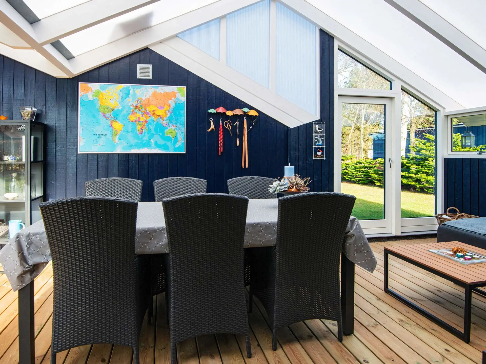 An allen Seiten des Hauses gibt es gemütliche Sitzecken mit Gartenmöbeln. Aufgrund der großen Bäume besteht eine gute Gelegenheit, im Garten Schutz zu finden. Das Haus hat auch einen großen Grill und einige Sonnenliegen. In Verlängerung des Wohnzimmers und in Richtung vom Annex findet man eine schöne, verglaste Veranda mit Holzterrassenboden.