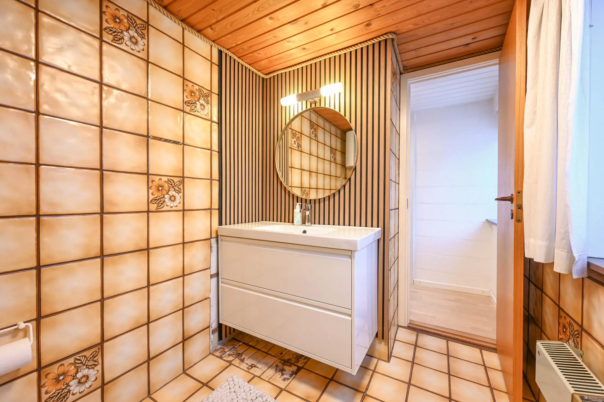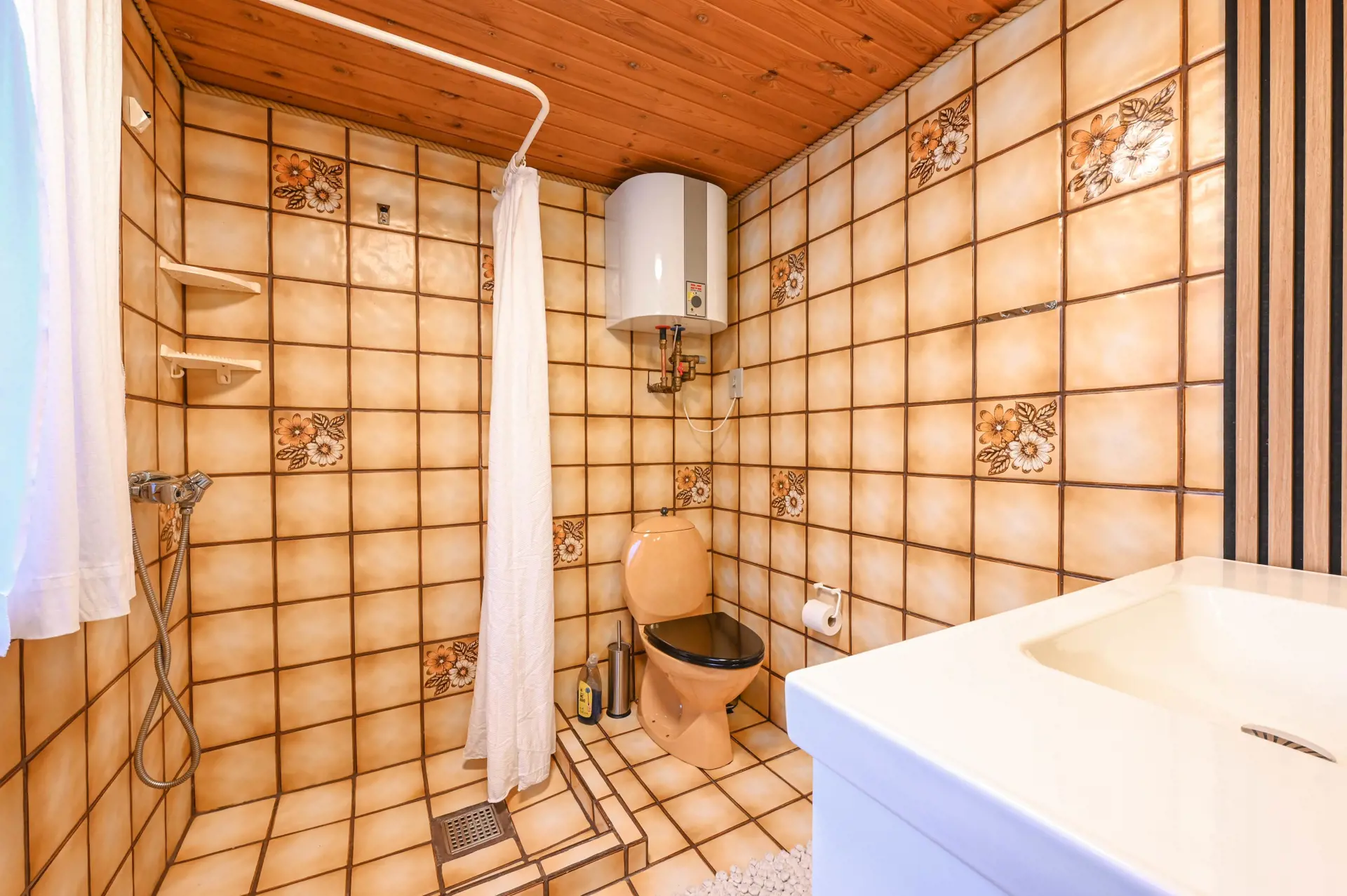 Küche, Wohn- und Esszimmer sind offen miteinander verbunden. Hier könnt ihr gemeinsam Zeit beim Essen verbringen, vor dem Fernseher entspannen oder an kühlen Tagen vor dem Holzofen die Wärme genießen. Das ältere Badezimmer ist funktionell und praktisch eingerichtet. Das Haus verfügt über 2 Schlafzimmer- eines mit einem Einzelbett und eines mit zwei Einzelbetten – und eignet sich gut für eine kleine Familie oder ein Paar, das zusätzlich Platz wünscht.
