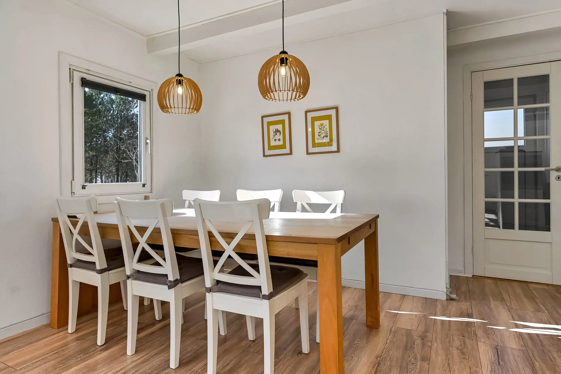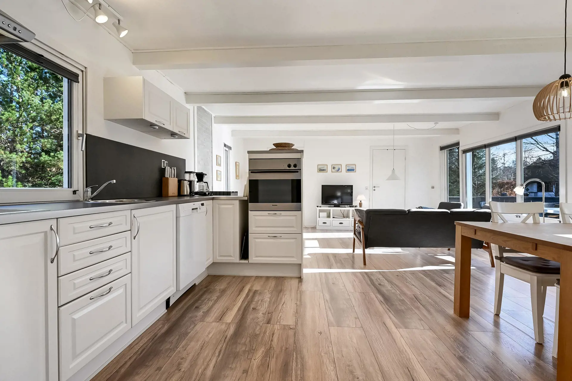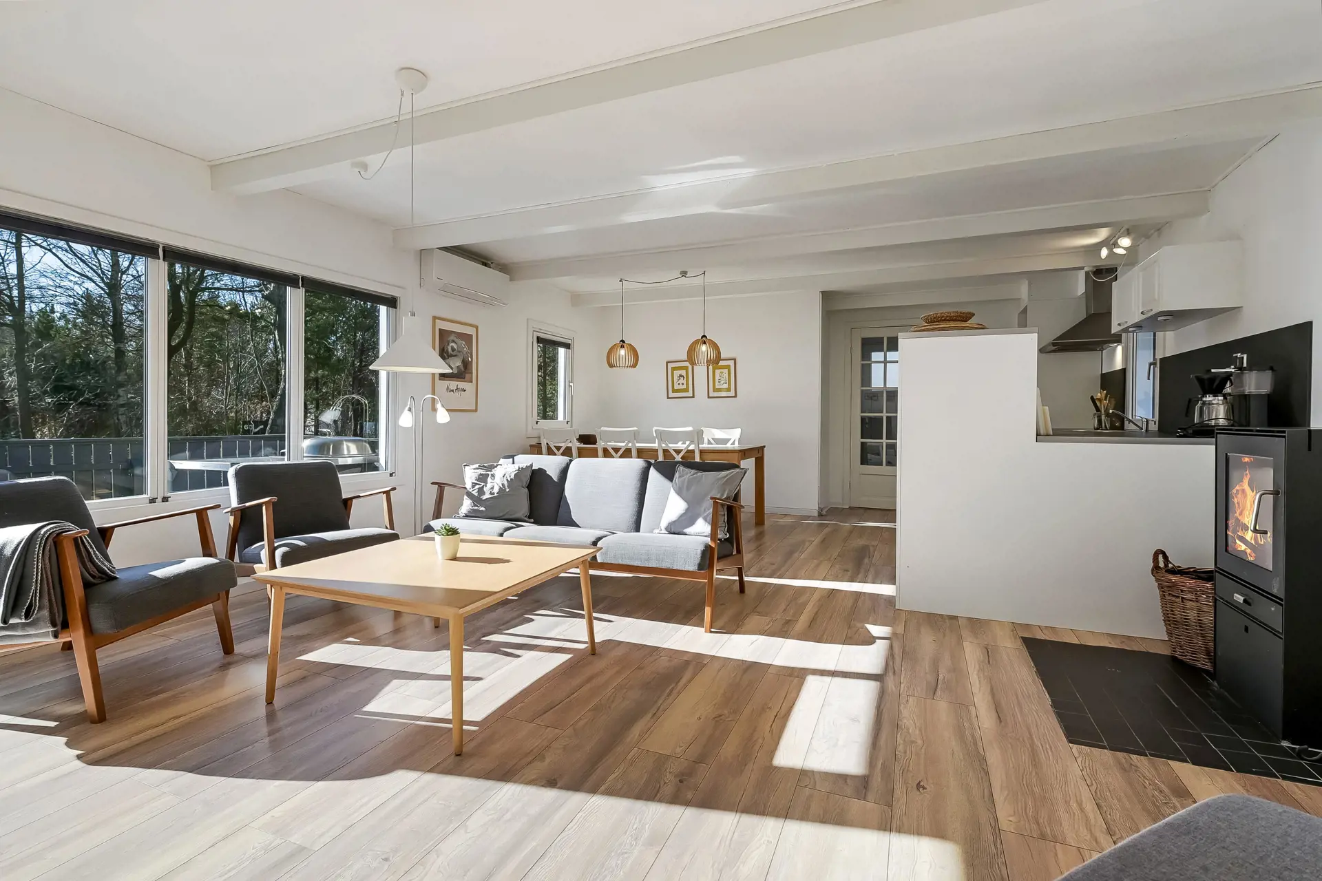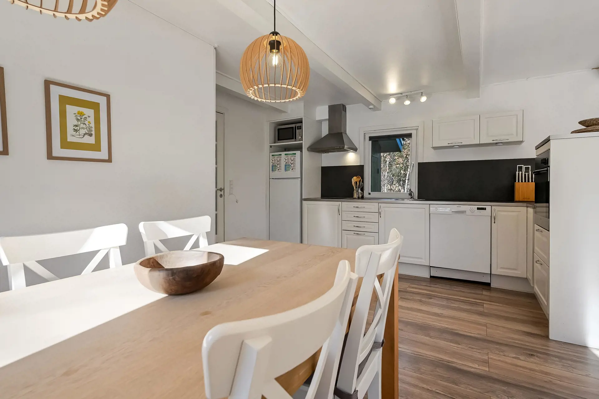 Das Haus ist hell und einladend mit einer weißen Küche, schönen Holzböden und einem renovierten Badezimmer. Die gemütlichen und bequemen Möbel unterstützen die warme Atmosphäre und machen es leicht, sich vom ersten Moment an wie zu Hause zu fühlen. Das Wohnzimmer ist in offener Verbindung mit der Küche und bildet einen natürlichen Treffpunkt, wo die Familie gemütlich Zeit miteinander verbringen kann – sei es beim Essen, beim Spielen am Tisch oder beim Entspannen auf dem Sofa.