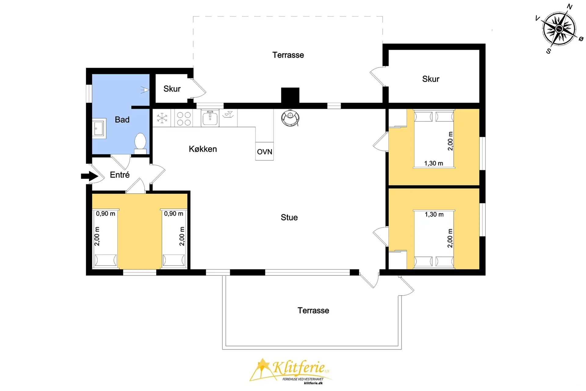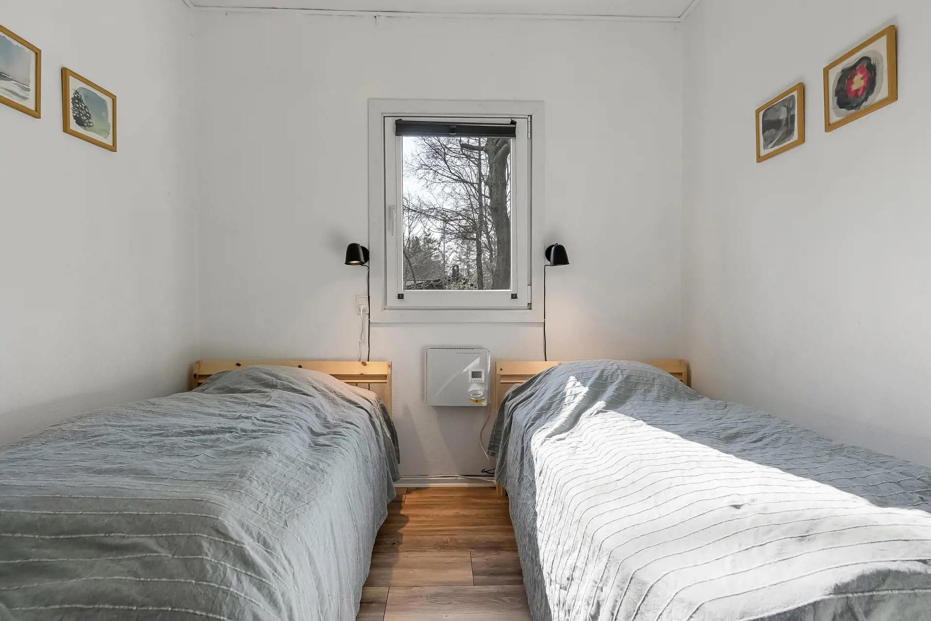 Das Ferienhaus verfügt über drei Zimmer: eines mit zwei Einzelbetten sowie zwei Zimmer mit kleineren Doppelbetten. Das Haus eignet sich daher perfekt für die kleine Familie, die sowohl Platz möchte als auch eine Ausstattung, die zu gemeinsamen Ferienstunden einlädt.