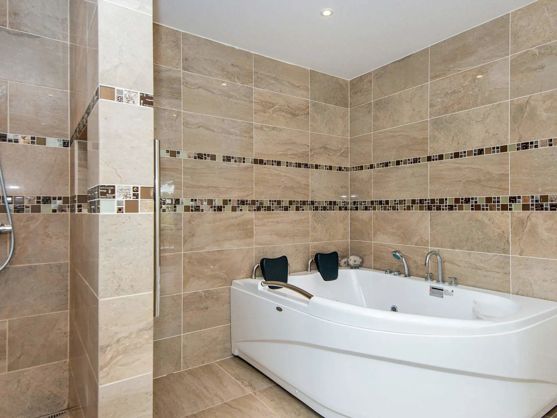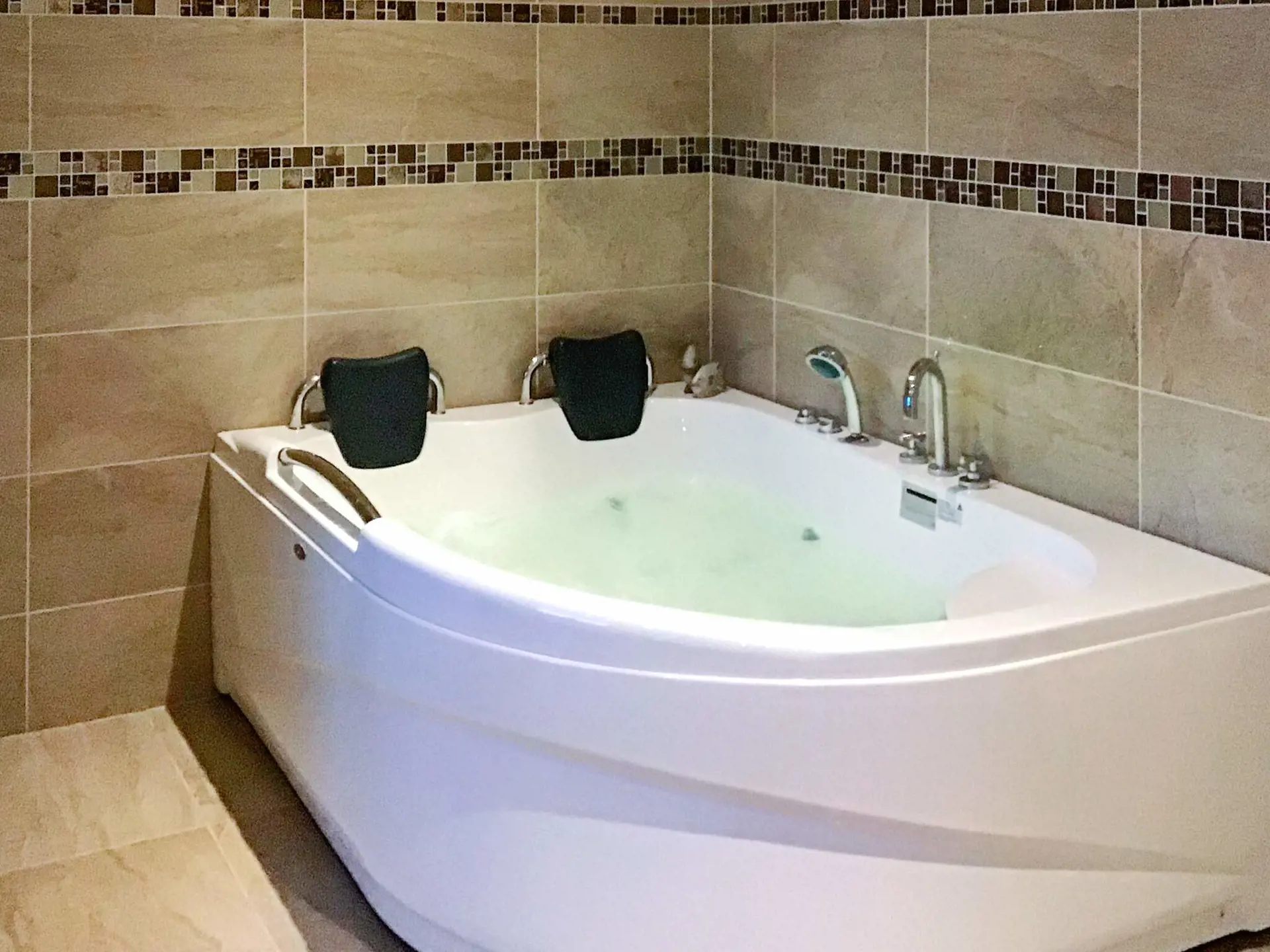 Badezimmer mit u.a. Waschmaschine, Trockner sowie Whirlwanne für 2 Personen. Das Haus hat zudem zwei Schlafzimmer; eines mit einem Doppelbett, das zweite mit Etagenbett. Im Wohnzimmer gibt es zudem ein Schlafsofa für zwei Personen.