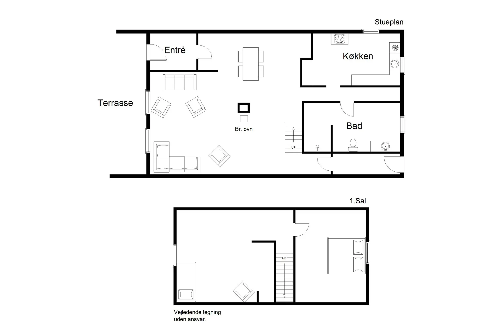 Im Obergeschoss befinden sich zwei Schlafzimmer – eines mit Doppelbett und eines mit Einzelbett.