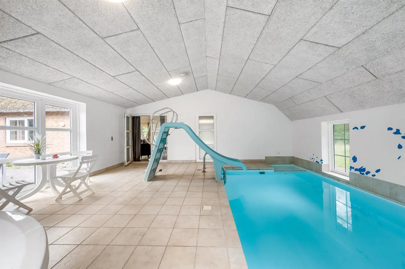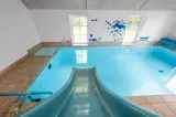 Große, herrliche Pool-Abteilung mit Swimmingpool (6,0 x 3,0 x 1,4 m) mit Gegenstromanlage, Kinderpool mit Wasserrutsche, 2-Pers.-Whirlpool und Zutritt zu einem Badezimmer mit Duschnische. Von diesem Badezimmer außerdem direkten Zutritt zur Sauna des Hauses. Zusätzliches, schönes Badezimmer mit Duschnische.
