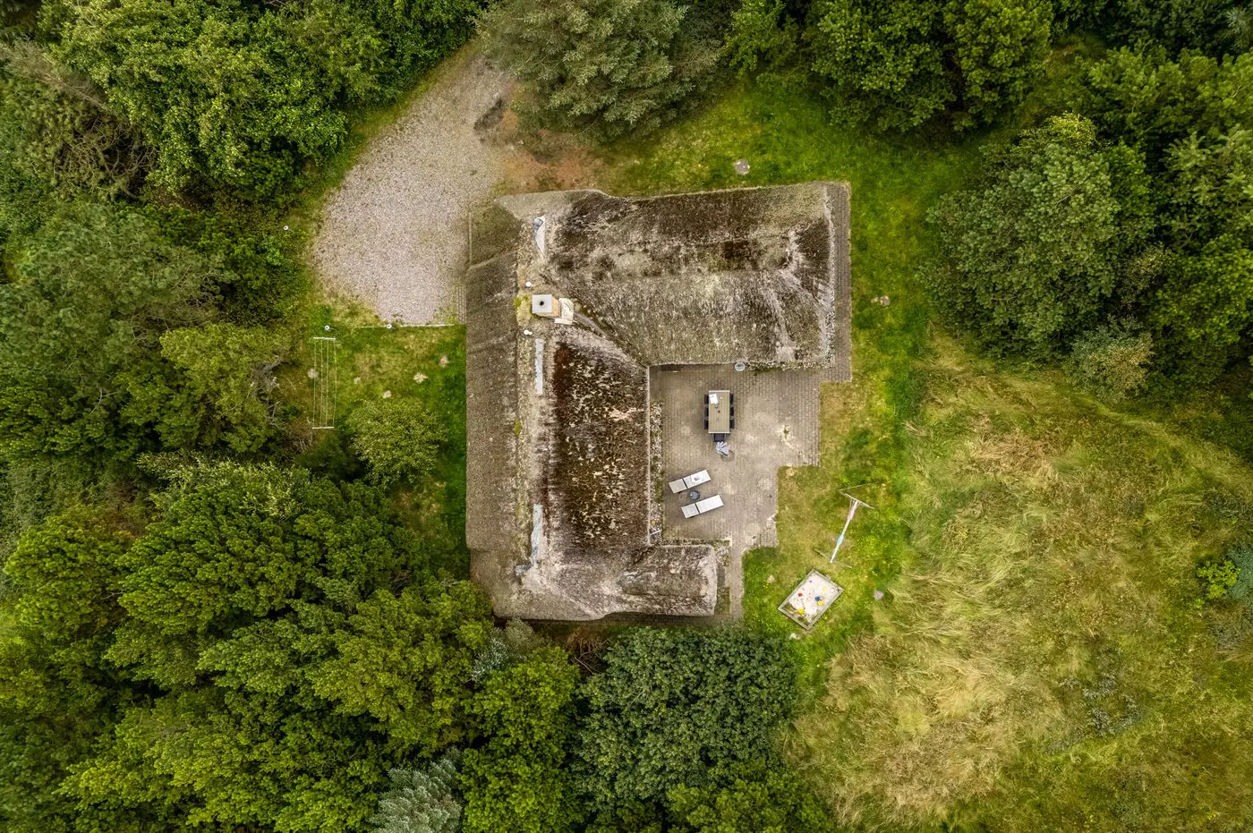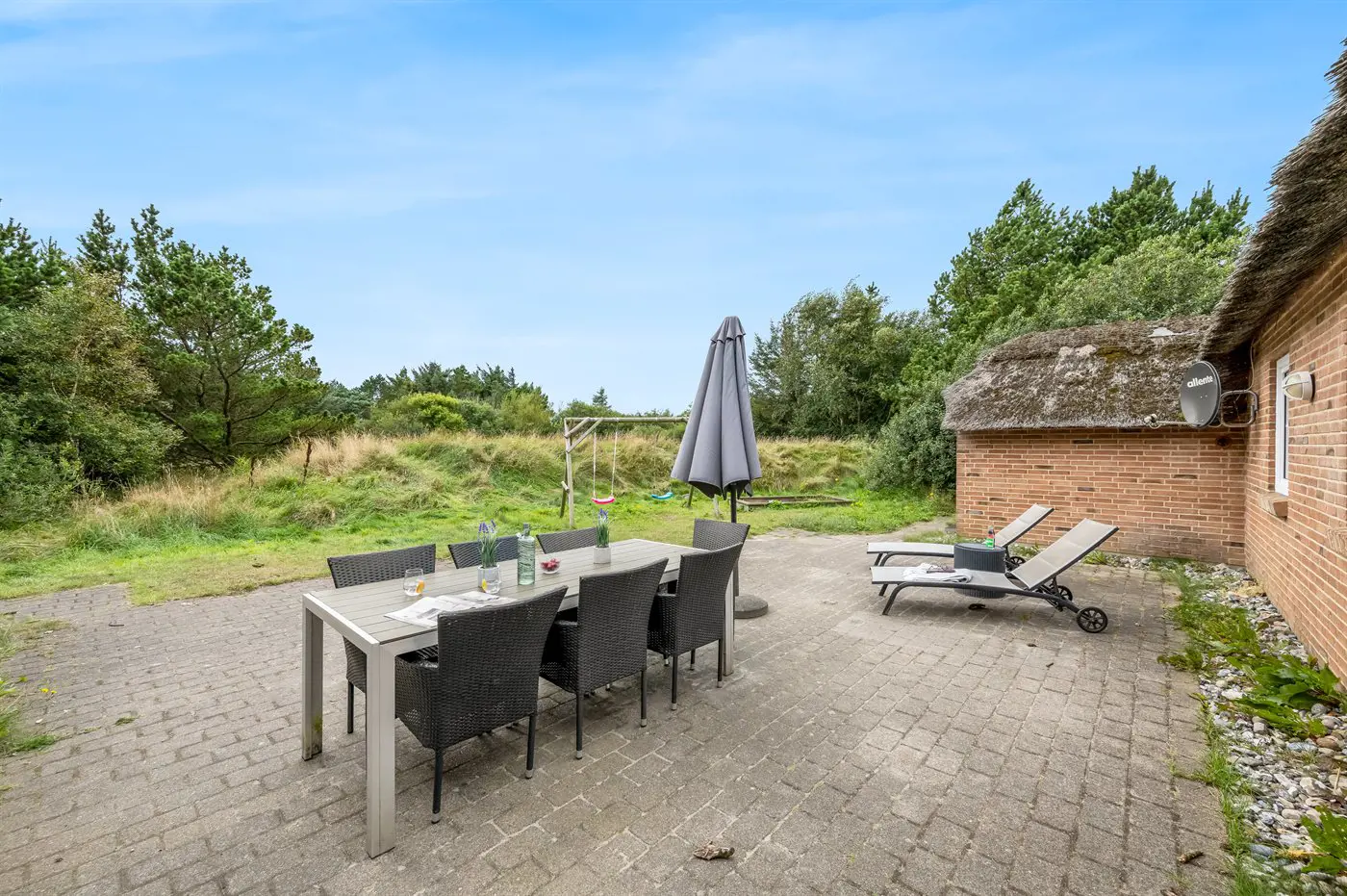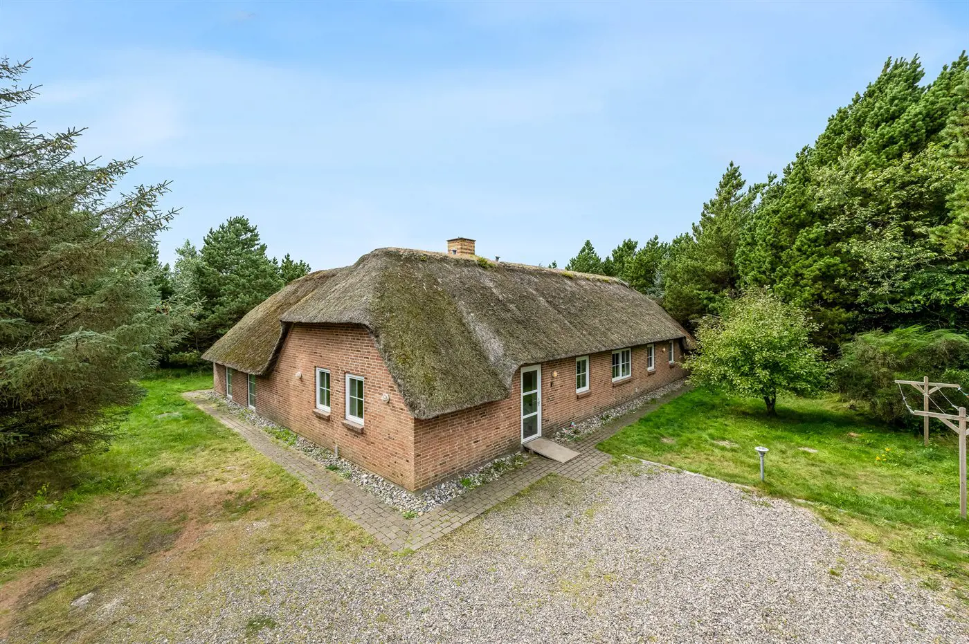Dieses gepflegte Ferienhaus aus Stein mit Reetdach, 1993 gebaut, liegt auf einem großen, prachtvollen und ungestörten Naturgrundstück, von Bäumen und Büschen umgeben. Zum Haus gehört eine große Terrasse mit Gartenmöbeln.