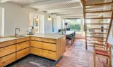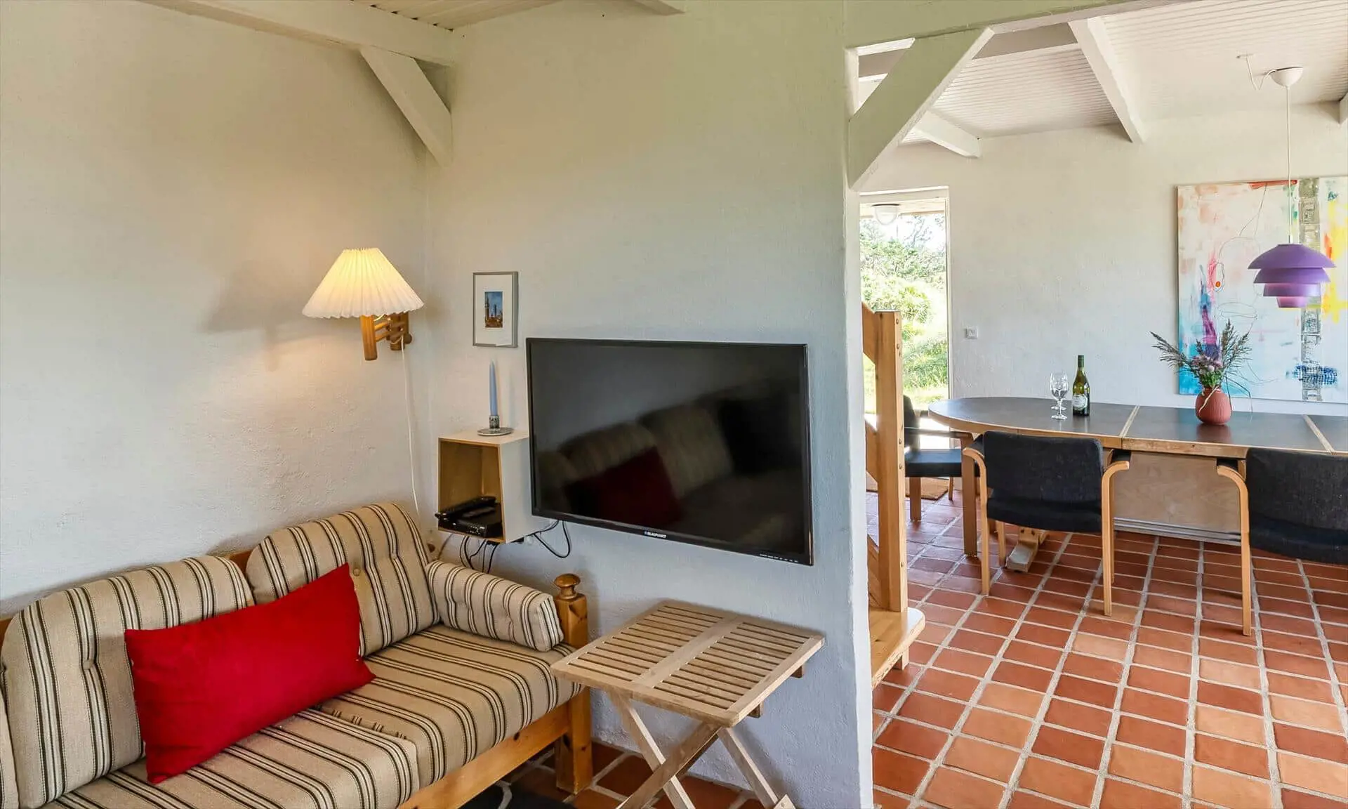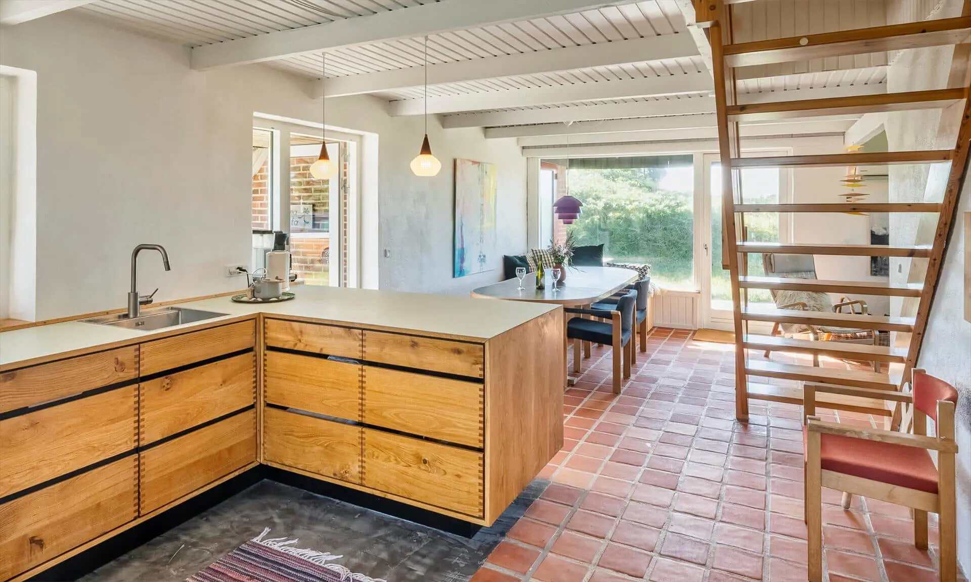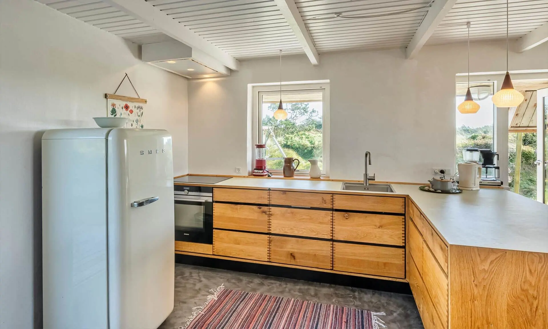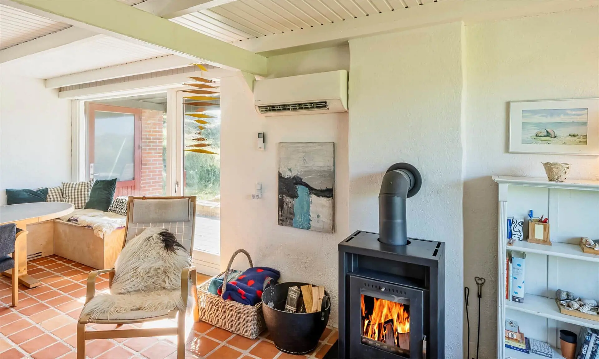 Das Ferienhaus erstreckt sich über zwei Etagen und verfügt über eine durchdachte Raumaufteilung mit viel Licht und einem gemütlichen Wohnbereich. Im Erdgeschoss finden Sie eine rustikale, aber moderne Küche in offener Verbindung mit dem Essbereich – perfekt für gemeinsames Kochen und gesellige Mahlzeiten. Von hier aus haben Sie direkten Zugang zu sonnigen Terrassen, auf denen Sie die Meeresbrise genießen können. Das Wohnzimmer lädt an kühleren Tagen zum Entspannen vor dem Kaminofen ein, und die energieeffiziente Wärmepumpe sorgt das ganze Jahr über für ein angenehmes Raumklima.