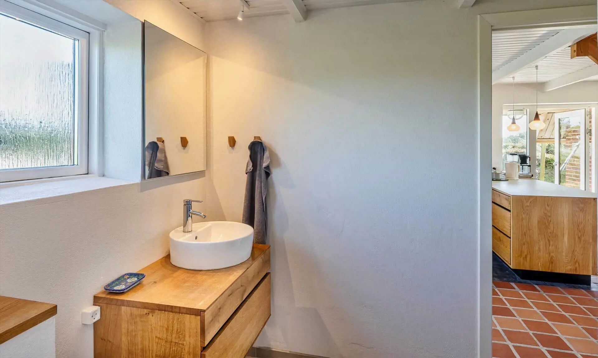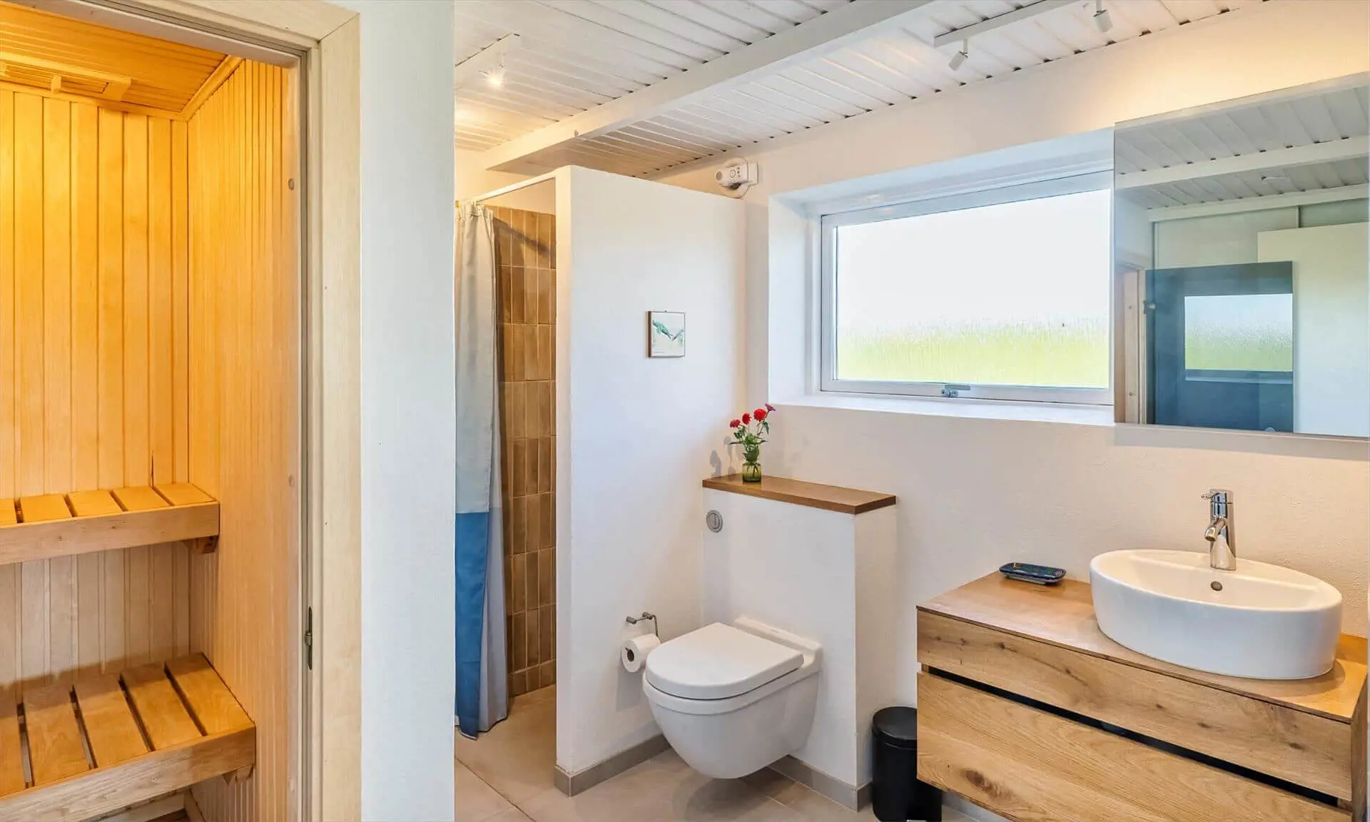 Das Badezimmer ist mit Fußbodenheizung, Dusche, Toilette, Waschbecken, Waschmaschine – und nicht zuletzt einer herrlichen Sauna ausgestattet, in der Sie sich nach einem Tag an der frischen Meeresluft aufwärmen können.
