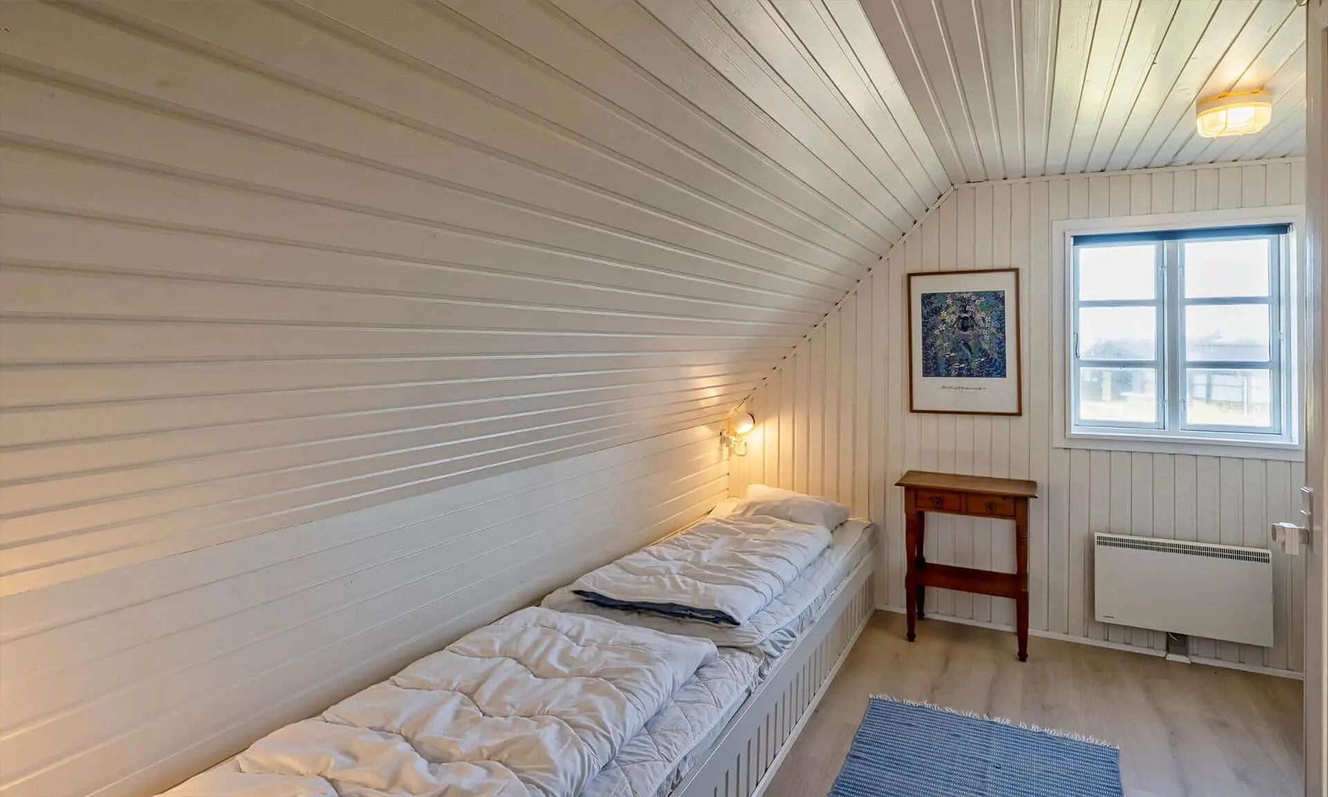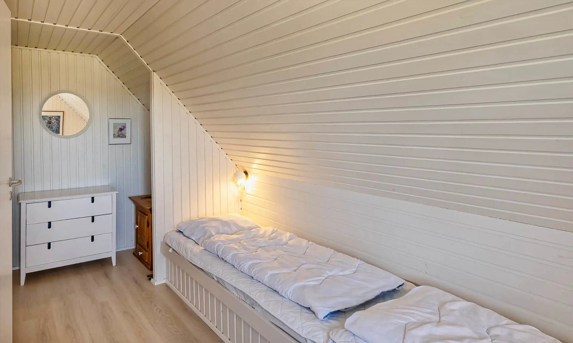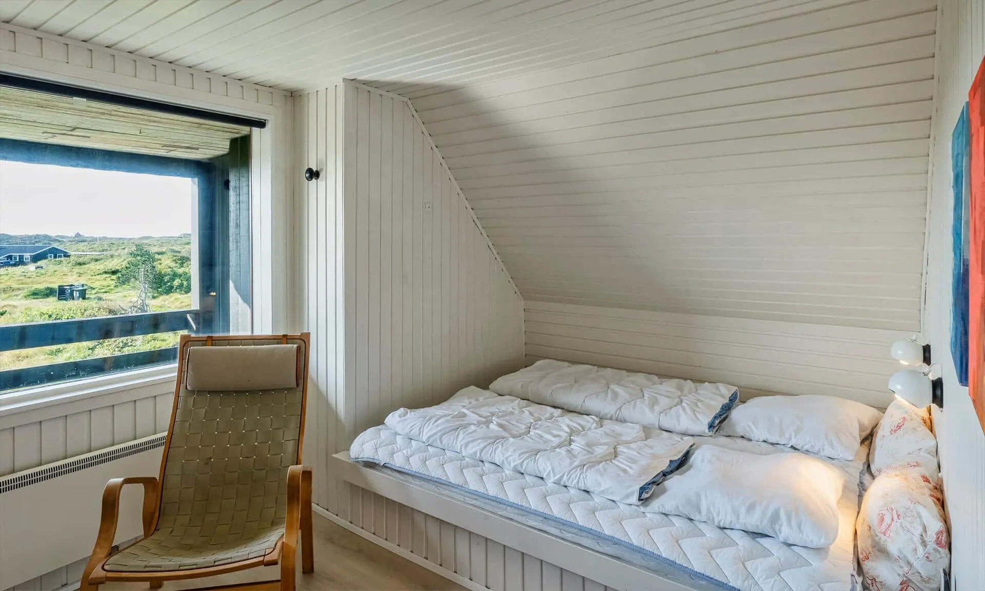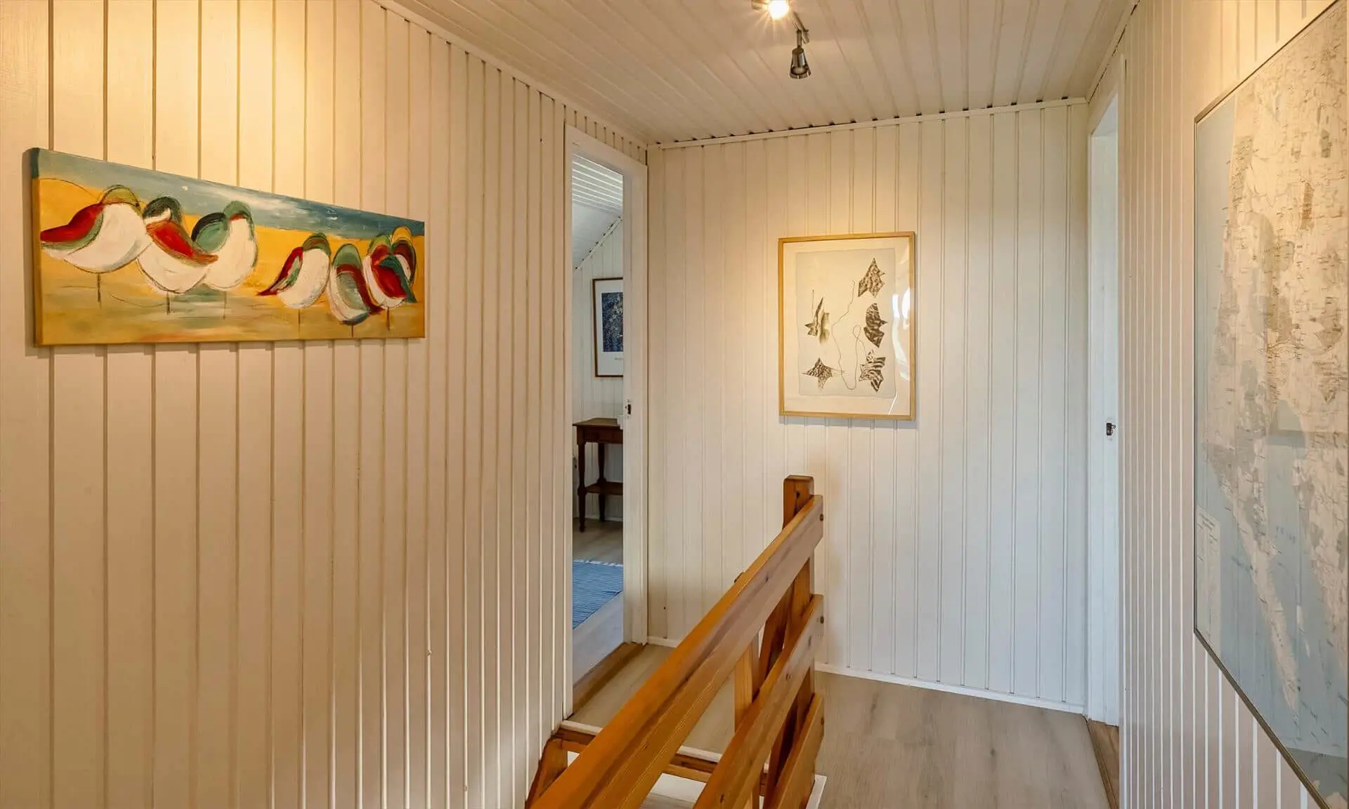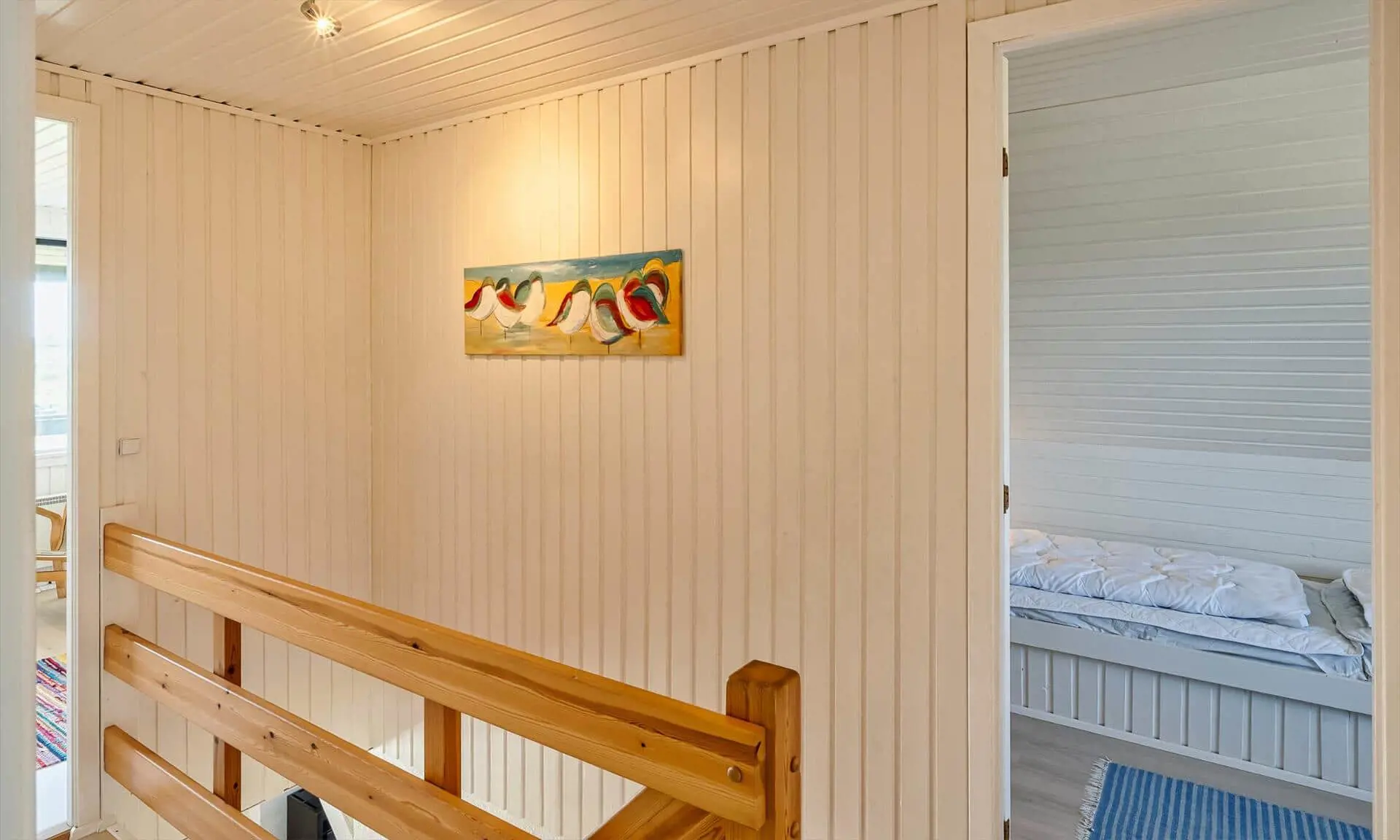 Im Obergeschoss erwarten Sie drei helle Schlafzimmer. Das Hauptschlafzimmer verfügt über ein Doppelbett und Zugang zu einem Laubengang, von dem aus Sie eine großartige Aussicht über die Landschaft genießen können. Die beiden weiteren Zimmer haben jeweils zwei Einzelbetten, die hintereinander angeordnet sind – ideal für Kinder und Erwachsene. DB + EB + EB + EB + EB.
