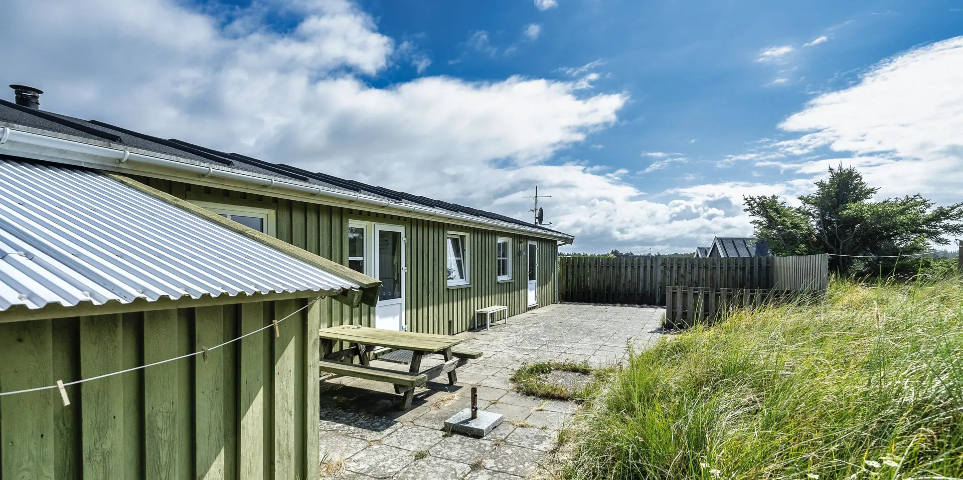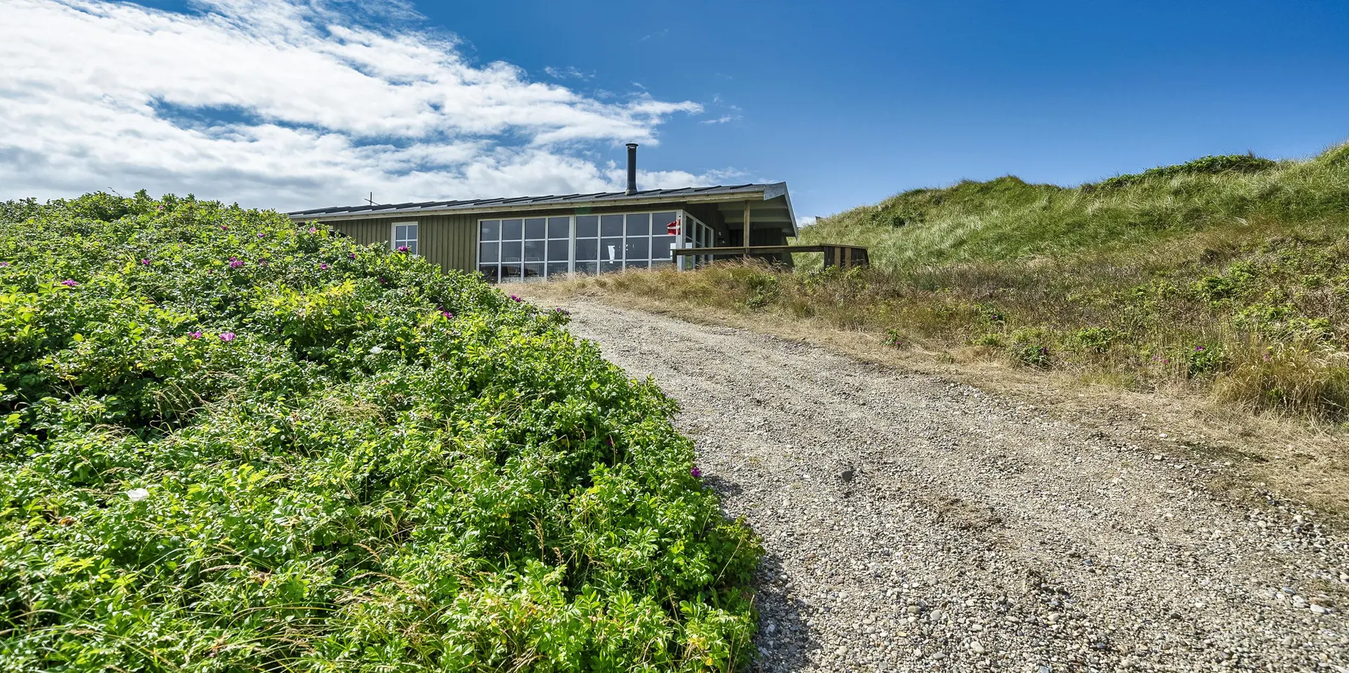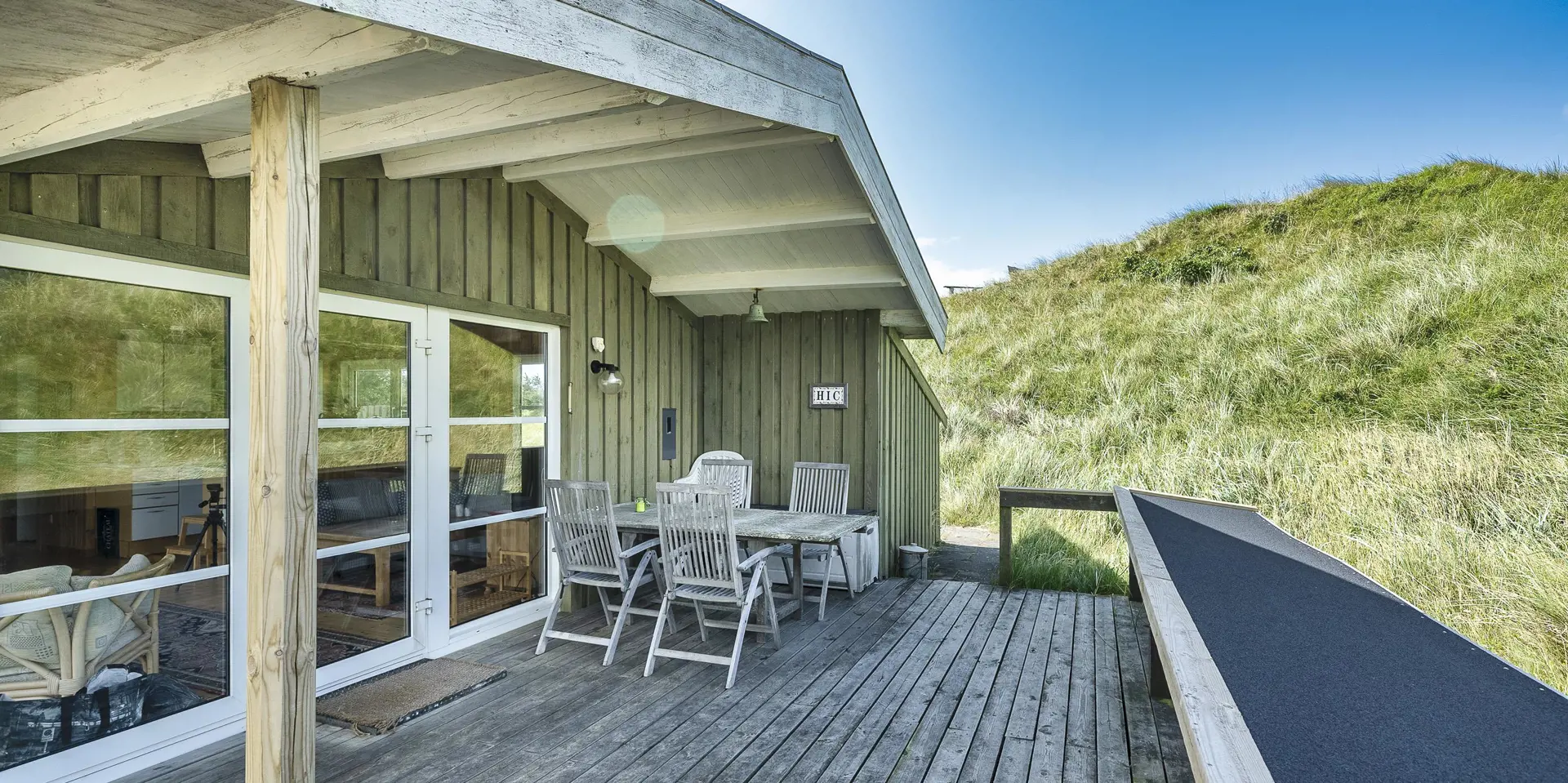 Flott eingerichtetes Ferienhaus mit Namen ”HIC” in Mitten der Dünenlandschaft vom Grærup Strand gelegen. Das Ferienhaus ist für 4 Personen ausgestattet. Wer die Ruhe liebt und wenig Trubel braucht wählt dieses Ferienhaus und bekommt Entspannung pur. Der Grærup Strand ist nur 300 Meter vom Haus entfernt. Der Strand ist kein Autostrand er ist nur über die Dünenkette zu erreichen. Grærup Strand bietet keine Einkaufsmöglichkeiten, das müsste dann in dem nächsten Ort Vejers Strand erledigt werden. Vejers Strand liegt nur 7 Km von Grærup entfernt. In diesem Ferienhaus ist viel Holz verarbeitet, an den Wänden, an der Decke, der Fußboden und sogar offene Balken sind zu sehen. In dem Wohnbereich ist ein Kamin aufgestellt und das deutsche Fernsehprogramm empfangen Sie über Stofa, dadurch empfangen Sie nur 5-8 deutsche Kanäle. Internet (W-LAN). Eine große Fensterfront in dem Wohn- und Essbereich spendet viel Helligkeit. Dazu haben Sie dann noch einen wundervollen Blick auf die Dünen. Die Küche ist einfach gehalten und verfügt einen Herd mit Cerankochfeld, einem Backofen, einer Geschirrspülmaschine und einer Kühl- und Gefrierkombination. Das Badezimmer verfügt über ein WC, ein Handwaschbecken und eine Dusche. Die Waschmaschine stehen hier im Badezimmer den Gästen zur Verfügung. Zwei Schlafzimmer: DB + DB. Der Terrassenbereich ist zur Rückseite vor einer Düne und ein kleiner Teil am Haus ist überdacht. Es sind keine Haustiere erlaubt. Das Rauchen ist nicht gestattet. Das Ferienhaus ist 1966 erbaut worden und in 1999 renoviert.
