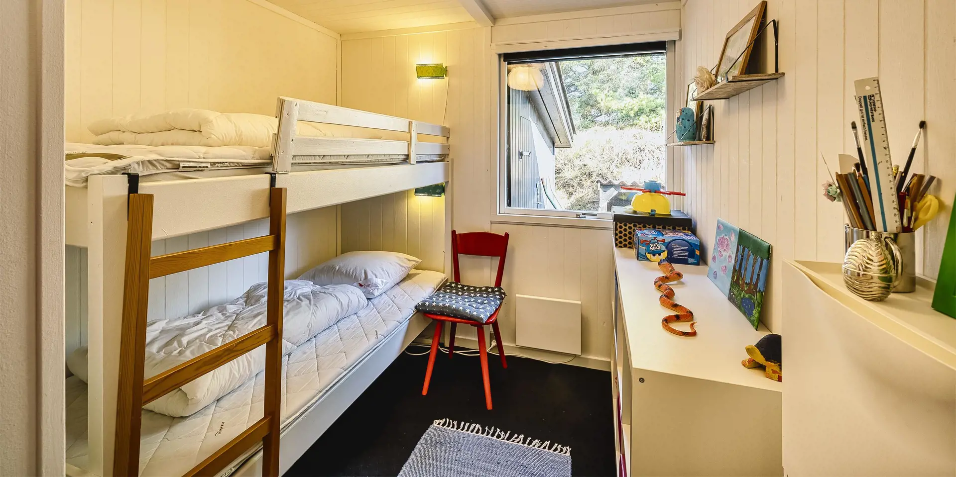2 Schlafzimmer. 1 mit Doppelbett 180x200 cm. 1 mit Etagenbett.