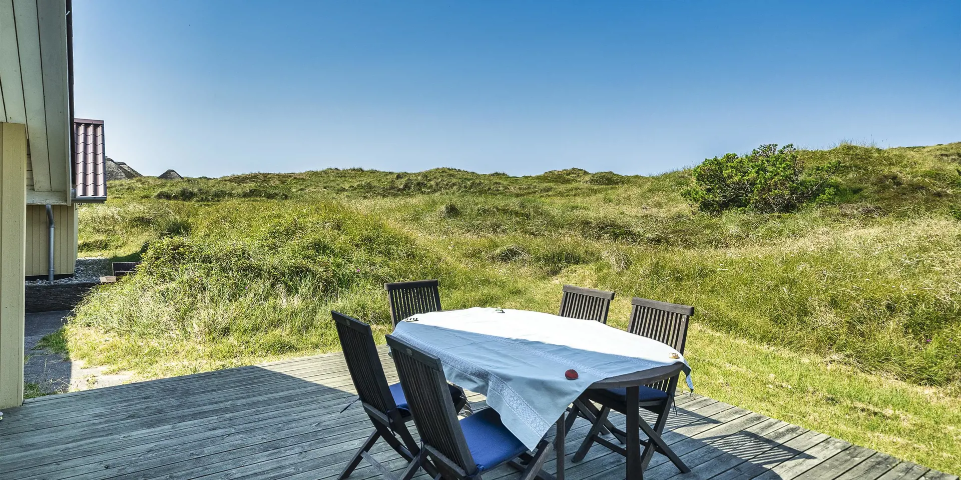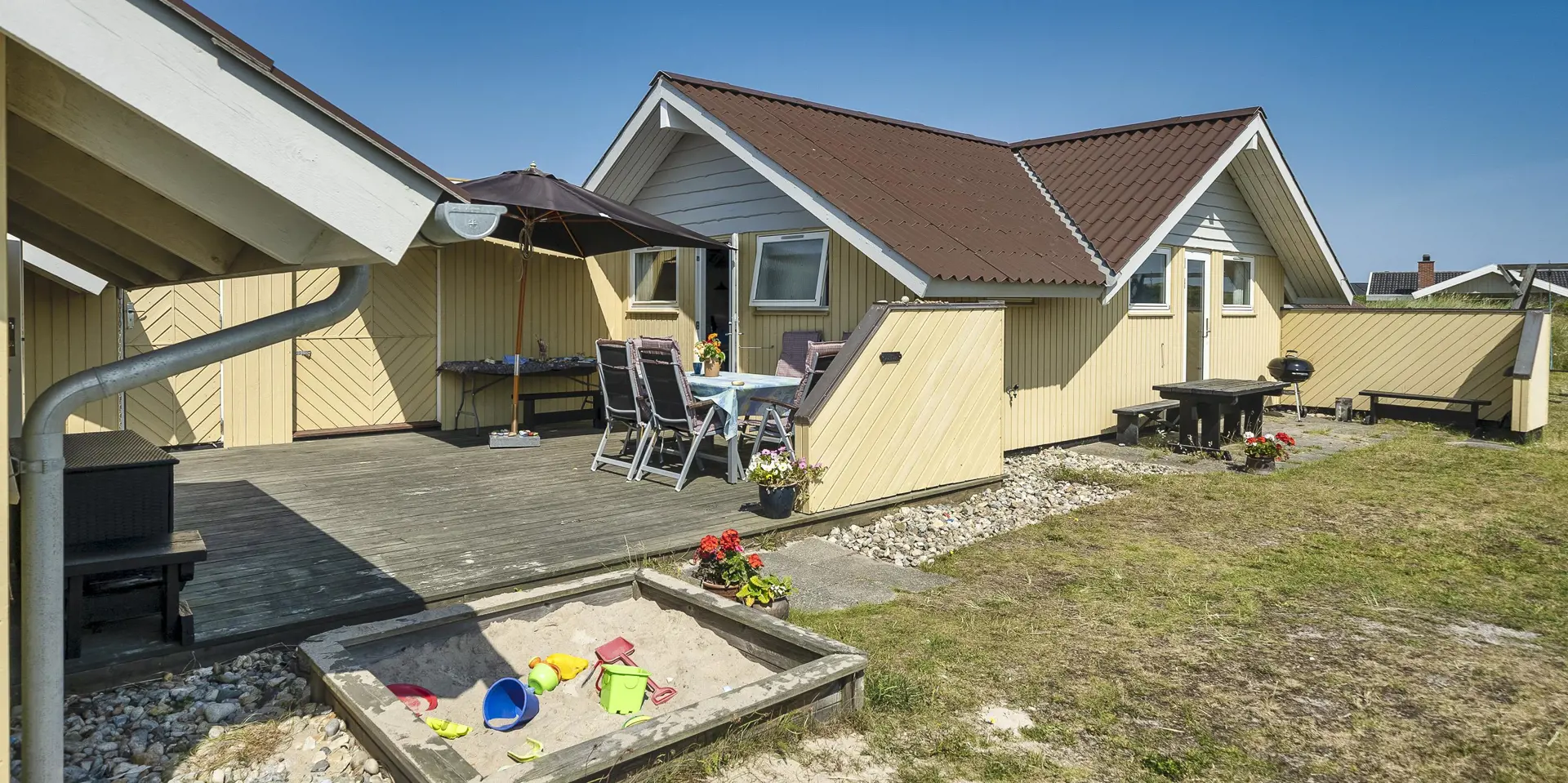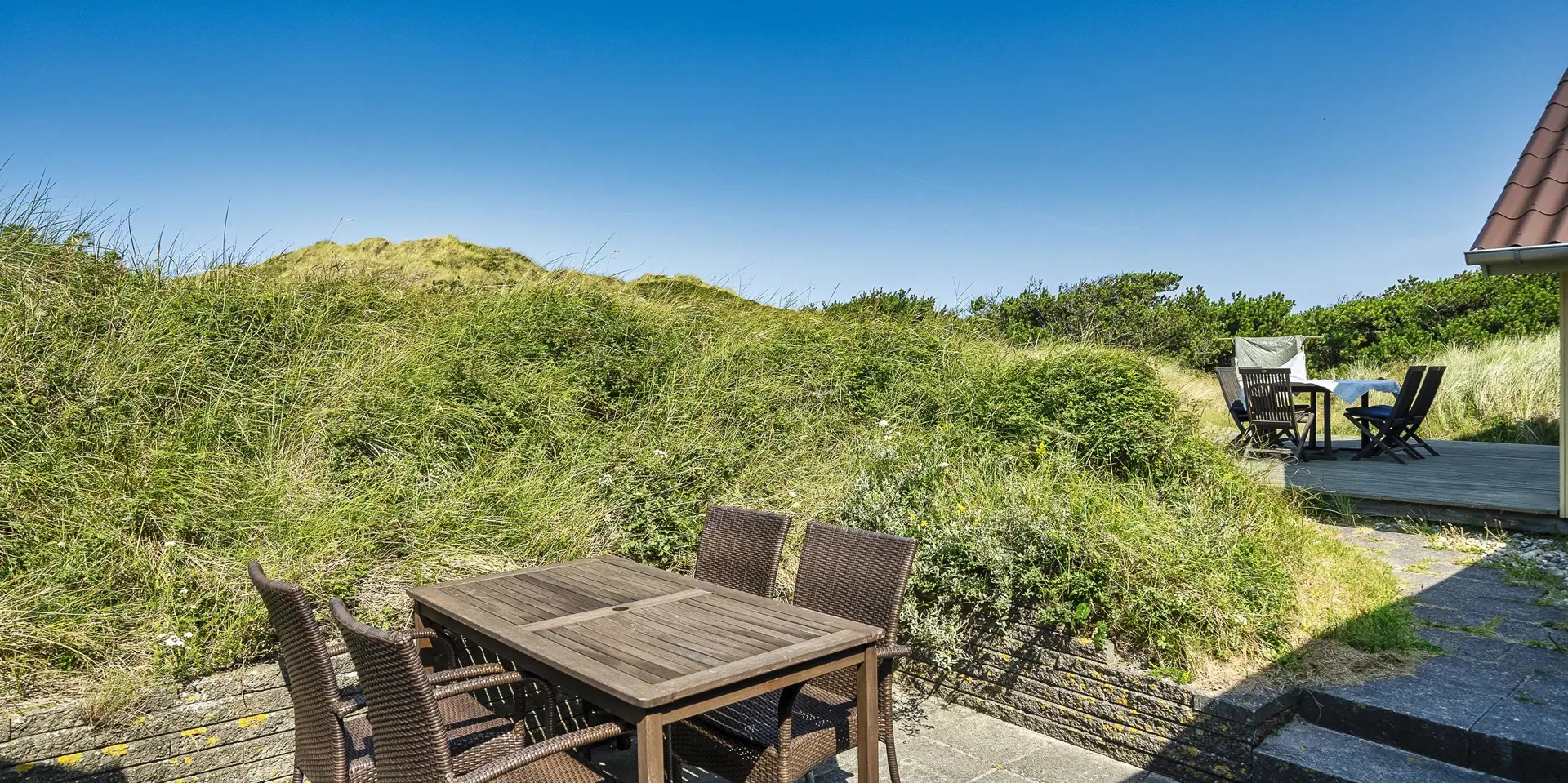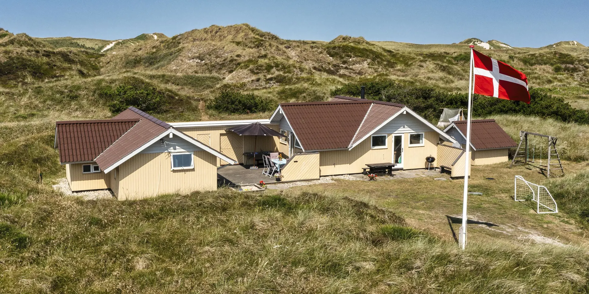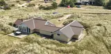 Helles und freundliches vom Architekten entworfenes Ferienhaus in Mitten der Dünen und auf einem ca. 3300 qm grossem Grudstück gelegen. Das Gebiet um den Strand von Grærup ist das ganze Jahr über ein fantastisch ruhiges und landschaftlich reizvolles Gebiet mit einer reichen Tierwelt. Es gibt gute Möglichkeiten für Wanderungen und Radtouren, entweder auf markierten Wegen oder auf eigene Faust. Am Eingang zum Grærup Strand befindet sich der Grærup Angelsee, in dem Sie Regenbogenforellen und diverse andere Fische angeln können. Ein Angelschein ist erforderlich und kann in Vejers Strand käuflich erworden werden. Der Strand ist ca. 50 Meter und umbei 5 Minuten fussläufig vom Ferienhaus entfernt. Die Räumlichkeiten des Ferienhauses sind auf zwei Gebäude verteilt. In dem Haupthaus befindet sich das Wohnzimmer mit dem Essbereich, die Küche, ein Schlafzimmer und ein Gäste WC. Hier im Wohn- und Essbereich befindet sich ein Kaminofen, der Ihnen eine angenehme Wärme und Gemütlichkeit spendet. Desweiteren haben Sie einen Ausgang zur Holzterrasse und einen wundervollen Blick über die Terrasse in die Dünen. Das Fernsehprogramm empfangen Sie über ein TV-Paket von BOXER mit dänischen, deutschen, norwegischen und schwedischen Kanälen. Das Ferienhaus verfügt auch über einen Internetanschluss (W-Lan). Die Küche bietet genügend Platz und verfügt über einen Herd mit Cerankochfeld, einem Backofen, einer Geschirrspülmaschine, einer Mikrowelle und einer Kühl- und Gefrierkombination. Vom Küchenbereich haben Sie auch einen Ausgang zu einem Terrassenbereich. Das kleine Gäste-WC verfügt über ein WC und ein Handwaschbecken. Ebenso ist in diesem Gäste-WC die Waschmaschine untergebracht. Dann befindet sich noch ein Schlafzimmer im Haupthaus. Dieses Schlafzimmer verfügt über zwei Einzelbetten, wobei die Matratzen nur aus Schaumstoff bestehen. Es gibt gibt eine kleine Büroecke, wo Sie die Möglichkeit haben sich an einen Schreibtisch zu setzen und zu malen, lesen oder schreiben und zusätzlich befindet sich dort auch ein Drucker, den Sie nutzen können. Über der Zwischenterrasse gelangen Sie dann in den Neubau bzw. das Nebenhaus. Hier haben Sie zwei schöne geräumige Schlafzimmer, einen kleinen Flurbereich und ein großes Badezimmer. Das eine Schlafzimmer ist mit einem Doppelbett und Kleiderschrank ausgestattet. Das zweite Schafzimmer verfügt über drei Einzelbetten. Das große Badezimmer ist mit einer Fußbodenheizung ausgestattet und verfügt über ein WC, ein Handwaschbecken und eine Dusche. Desweiteren befindet sich hier auch der Whirlpool und die Sauna. In dem Flurbereich steht zusätzlich noch eine Kühl- und Gefrierkombination bereit. Das Haus ist von mehreren Terrassen umgeben, auf denen das ganze Jahr über eine geschützte Ecke zu finden ist, von der aus die Natur in vollen Zügen genossen werden kann. Für die Kleinen Gäste befindet sich eine kleine Sandkiste und eine Schaukel auf dem Grundstück. Es ist max. ein Hund erlaubt. Das Rauchen im Ferienhaus ist nicht erlaubt. Das Ferienhaus ist 1984 erbaut worden und in 1997 renoviert. 3 Schlafzimmer: DB + 2B + DB/1B