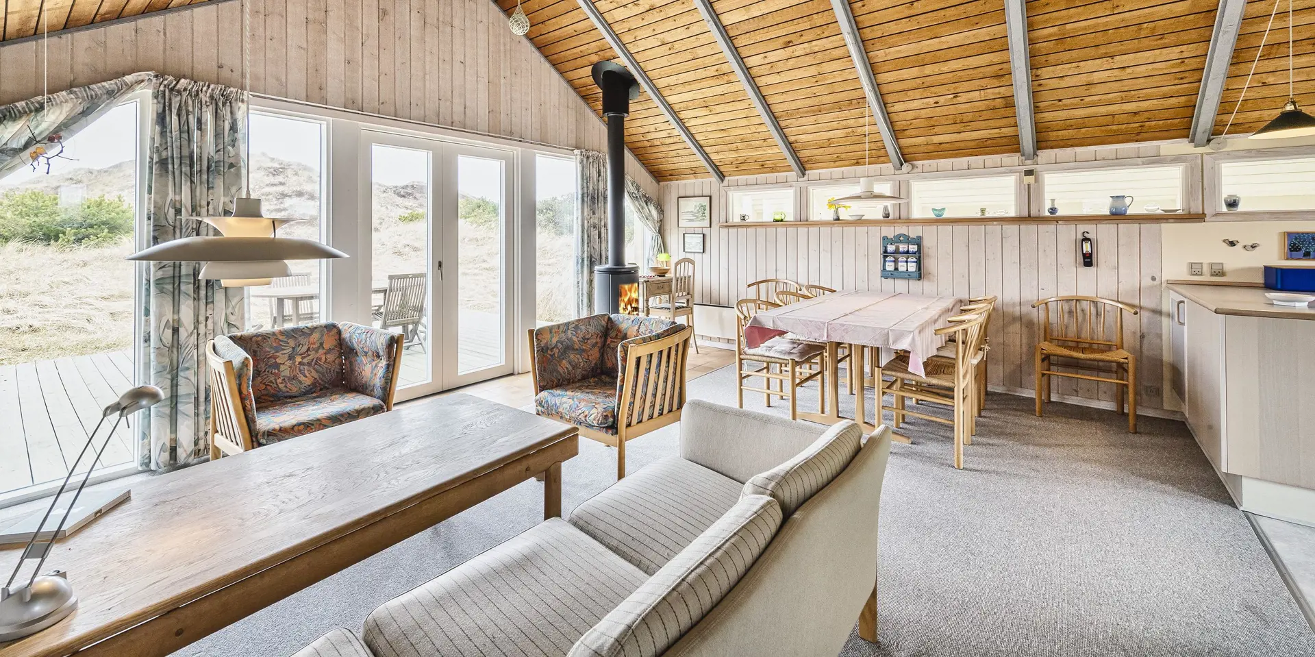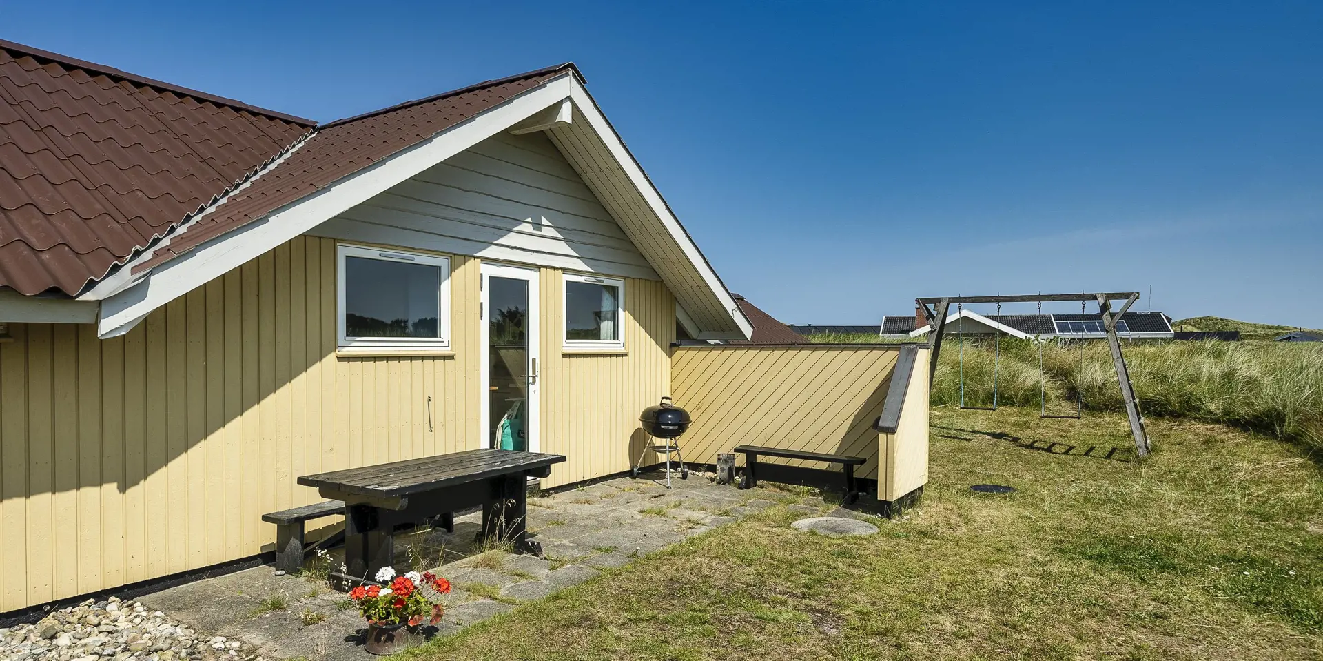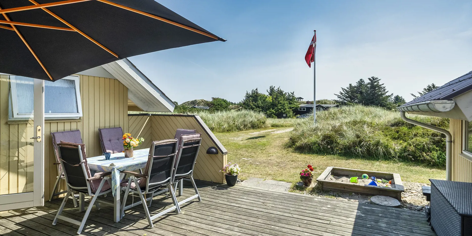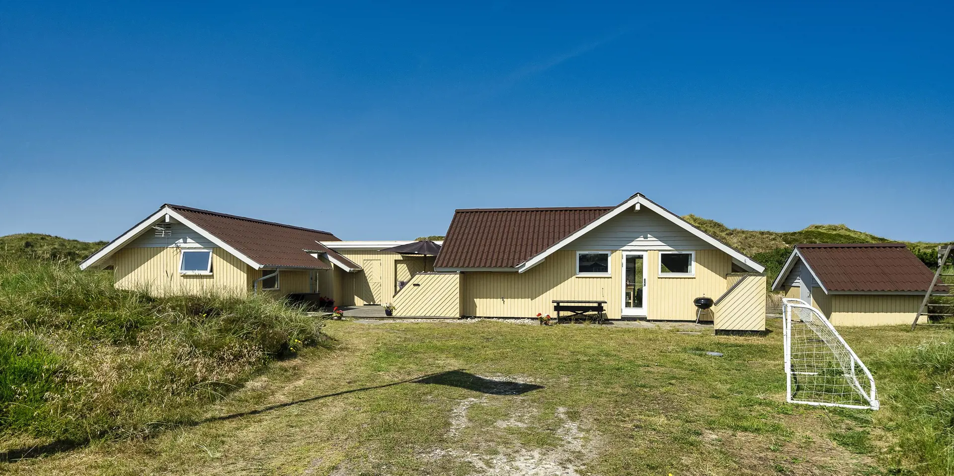 Helles und freundliches vom Architekten entworfenes Ferienhaus in Mitten der Dünen und auf einem ca. 3300 qm grossem Grudstück gelegen. Das Gebiet um den Strand von Grærup ist das ganze Jahr über ein fantastisch ruhiges und landschaftlich reizvolles Gebiet mit einer reichen Tierwelt. Es gibt gute Möglichkeiten für Wanderungen und Radtouren, entweder auf markierten Wegen oder auf eigene Faust. Am Eingang zum Grærup Strand befindet sich der Grærup Angelsee, in dem Sie Regenbogenforellen und diverse andere Fische angeln können. Ein Angelschein ist erforderlich und kann in Vejers Strand käuflich erworden werden. Der Strand ist ca. 50 Meter und umbei 5 Minuten fussläufig vom Ferienhaus entfernt. Die Räumlichkeiten des Ferienhauses sind auf zwei Gebäude verteilt. In dem Haupthaus befindet sich das Wohnzimmer mit dem Essbereich, die Küche, ein Schlafzimmer und ein Gäste WC. Hier im Wohn- und Essbereich befindet sich ein Kaminofen, der Ihnen eine angenehme Wärme und Gemütlichkeit spendet. Desweiteren haben Sie einen Ausgang zur Holzterrasse und einen wundervollen Blick über die Terrasse in die Dünen. Das Fernsehprogramm empfangen Sie über ein TV-Paket von BOXER mit dänischen, deutschen, norwegischen und schwedischen Kanälen. Das Ferienhaus verfügt auch über einen Internetanschluss (W-Lan). Die Küche bietet genügend Platz und verfügt über einen Herd mit Cerankochfeld, einem Backofen, einer Geschirrspülmaschine, einer Mikrowelle und einer Kühl- und Gefrierkombination. Vom Küchenbereich haben Sie auch einen Ausgang zu einem Terrassenbereich. Das kleine Gäste-WC verfügt über ein WC und ein Handwaschbecken. Ebenso ist in diesem Gäste-WC die Waschmaschine untergebracht. Dann befindet sich noch ein Schlafzimmer im Haupthaus. Dieses Schlafzimmer verfügt über zwei Einzelbetten, wobei die Matratzen nur aus Schaumstoff bestehen. Es gibt gibt eine kleine Büroecke, wo Sie die Möglichkeit haben sich an einen Schreibtisch zu setzen und zu malen, lesen oder schreiben und zusätzlich befindet sich dort auch ein Drucker, den Sie nutzen können. Über der Zwischenterrasse gelangen Sie dann in den Neubau bzw. das Nebenhaus. Hier haben Sie zwei schöne geräumige Schlafzimmer, einen kleinen Flurbereich und ein großes Badezimmer. Das eine Schlafzimmer ist mit einem Doppelbett und Kleiderschrank ausgestattet. Das zweite Schafzimmer verfügt über drei Einzelbetten. Das große Badezimmer ist mit einer Fußbodenheizung ausgestattet und verfügt über ein WC, ein Handwaschbecken und eine Dusche. Desweiteren befindet sich hier auch der Whirlpool und die Sauna. In dem Flurbereich steht zusätzlich noch eine Kühl- und Gefrierkombination bereit. Das Haus ist von mehreren Terrassen umgeben, auf denen das ganze Jahr über eine geschützte Ecke zu finden ist, von der aus die Natur in vollen Zügen genossen werden kann. Für die Kleinen Gäste befindet sich eine kleine Sandkiste und eine Schaukel auf dem Grundstück. Es ist max. ein Hund erlaubt. Das Rauchen im Ferienhaus ist nicht erlaubt. Das Ferienhaus ist 1984 erbaut worden und in 1997 renoviert. 3 Schlafzimmer: DB + 2B + DB/1B