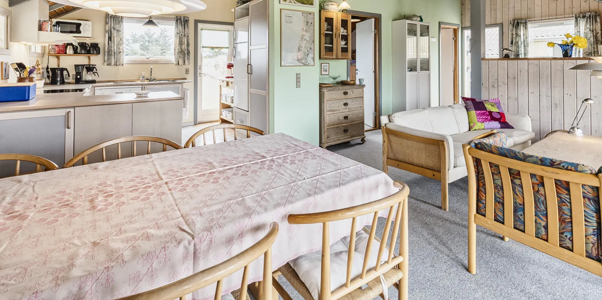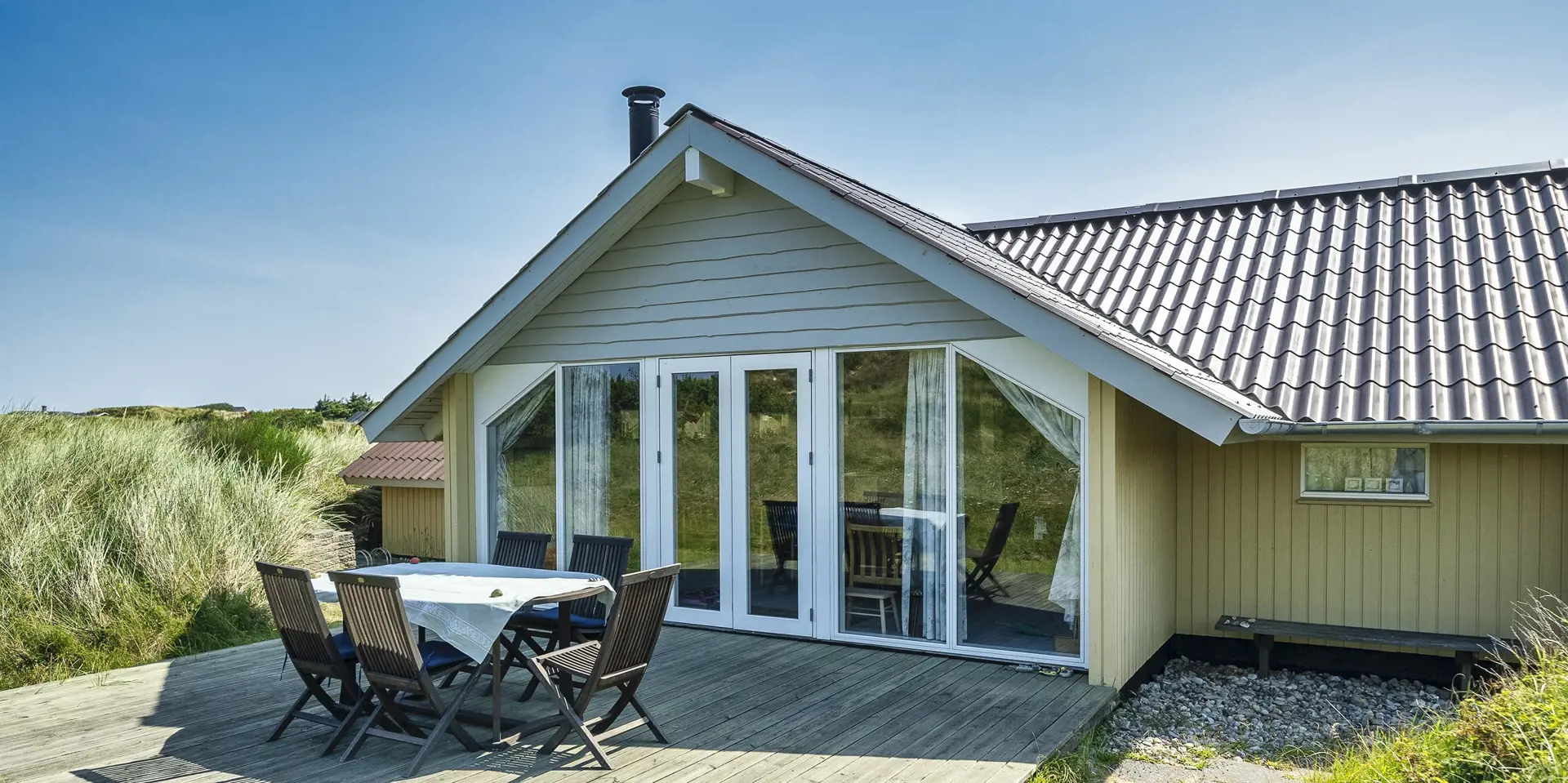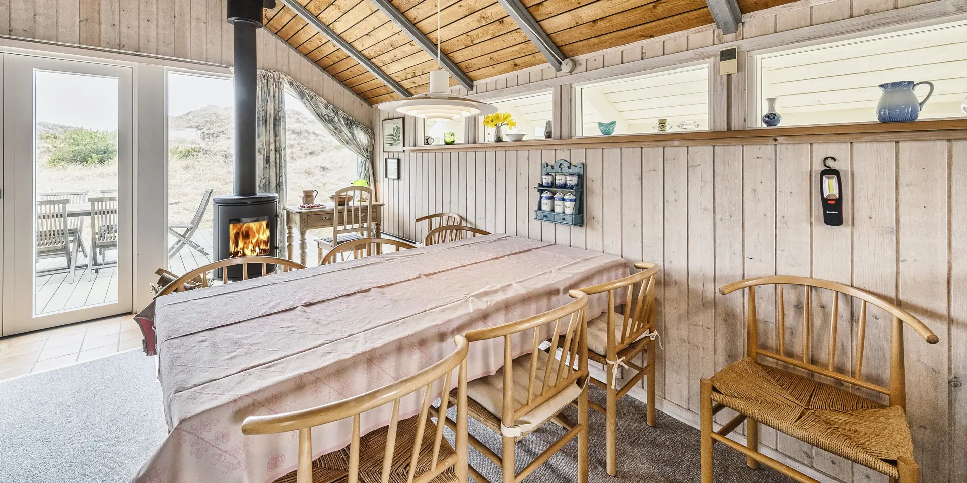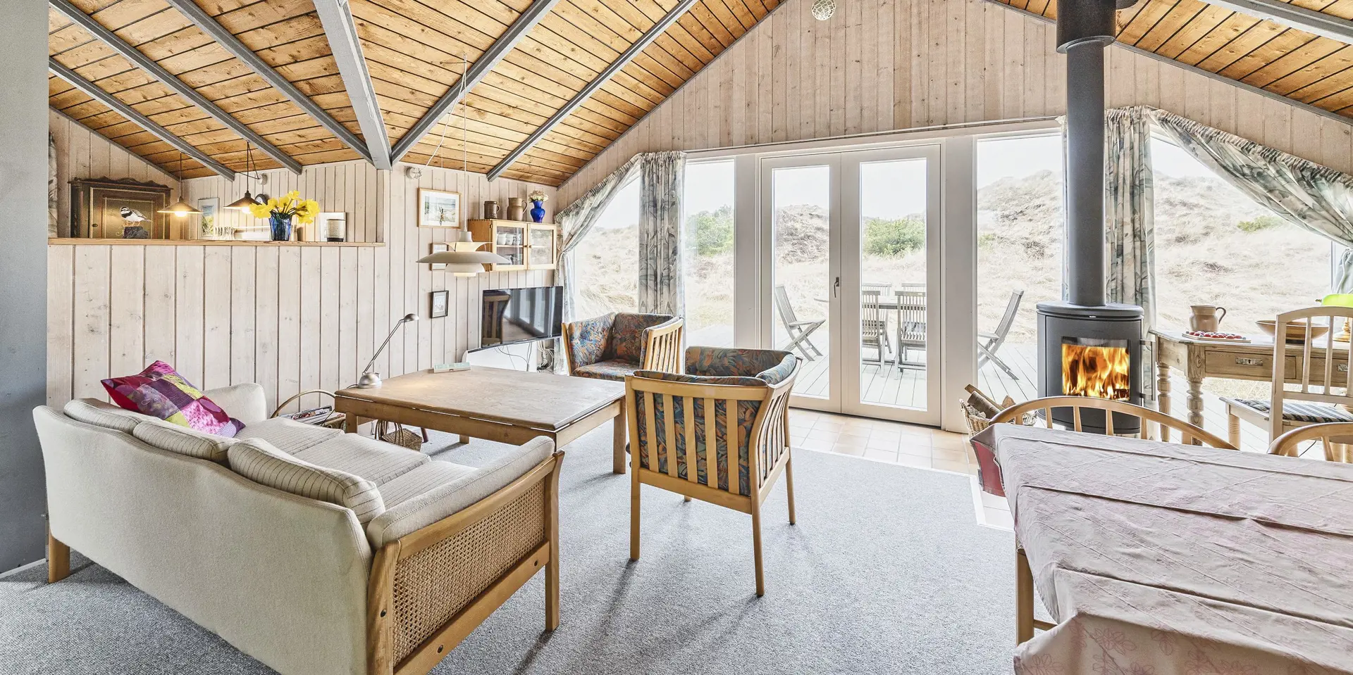 Helles und freundliches vom Architekten entworfenes Ferienhaus in Mitten der Dünen und auf einem ca. 3300 qm grossem Grudstück gelegen. Das Gebiet um den Strand von Grærup ist das ganze Jahr über ein fantastisch ruhiges und landschaftlich reizvolles Gebiet mit einer reichen Tierwelt. Es gibt gute Möglichkeiten für Wanderungen und Radtouren, entweder auf markierten Wegen oder auf eigene Faust. Am Eingang zum Grærup Strand befindet sich der Grærup Angelsee, in dem Sie Regenbogenforellen und diverse andere Fische angeln können. Ein Angelschein ist erforderlich und kann in Vejers Strand käuflich erworden werden. Der Strand ist ca. 50 Meter und umbei 5 Minuten fussläufig vom Ferienhaus entfernt. Die Räumlichkeiten des Ferienhauses sind auf zwei Gebäude verteilt. In dem Haupthaus befindet sich das Wohnzimmer mit dem Essbereich, die Küche, ein Schlafzimmer und ein Gäste WC. Hier im Wohn- und Essbereich befindet sich ein Kaminofen, der Ihnen eine angenehme Wärme und Gemütlichkeit spendet. Desweiteren haben Sie einen Ausgang zur Holzterrasse und einen wundervollen Blick über die Terrasse in die Dünen. Das Fernsehprogramm empfangen Sie über ein TV-Paket von BOXER mit dänischen, deutschen, norwegischen und schwedischen Kanälen. Das Ferienhaus verfügt auch über einen Internetanschluss (W-Lan). Die Küche bietet genügend Platz und verfügt über einen Herd mit Cerankochfeld, einem Backofen, einer Geschirrspülmaschine, einer Mikrowelle und einer Kühl- und Gefrierkombination. Vom Küchenbereich haben Sie auch einen Ausgang zu einem Terrassenbereich. Das kleine Gäste-WC verfügt über ein WC und ein Handwaschbecken. Ebenso ist in diesem Gäste-WC die Waschmaschine untergebracht. Dann befindet sich noch ein Schlafzimmer im Haupthaus. Dieses Schlafzimmer verfügt über zwei Einzelbetten, wobei die Matratzen nur aus Schaumstoff bestehen. Es gibt gibt eine kleine Büroecke, wo Sie die Möglichkeit haben sich an einen Schreibtisch zu setzen und zu malen, lesen oder schreiben und zusätzlich befindet sich dort auch ein Drucker, den Sie nutzen können. Über der Zwischenterrasse gelangen Sie dann in den Neubau bzw. das Nebenhaus. Hier haben Sie zwei schöne geräumige Schlafzimmer, einen kleinen Flurbereich und ein großes Badezimmer. Das eine Schlafzimmer ist mit einem Doppelbett und Kleiderschrank ausgestattet. Das zweite Schafzimmer verfügt über drei Einzelbetten. Das große Badezimmer ist mit einer Fußbodenheizung ausgestattet und verfügt über ein WC, ein Handwaschbecken und eine Dusche. Desweiteren befindet sich hier auch der Whirlpool und die Sauna. In dem Flurbereich steht zusätzlich noch eine Kühl- und Gefrierkombination bereit. Das Haus ist von mehreren Terrassen umgeben, auf denen das ganze Jahr über eine geschützte Ecke zu finden ist, von der aus die Natur in vollen Zügen genossen werden kann. Für die Kleinen Gäste befindet sich eine kleine Sandkiste und eine Schaukel auf dem Grundstück. Es ist max. ein Hund erlaubt. Das Rauchen im Ferienhaus ist nicht erlaubt. Das Ferienhaus ist 1984 erbaut worden und in 1997 renoviert. 3 Schlafzimmer: DB + 2B + DB/1B