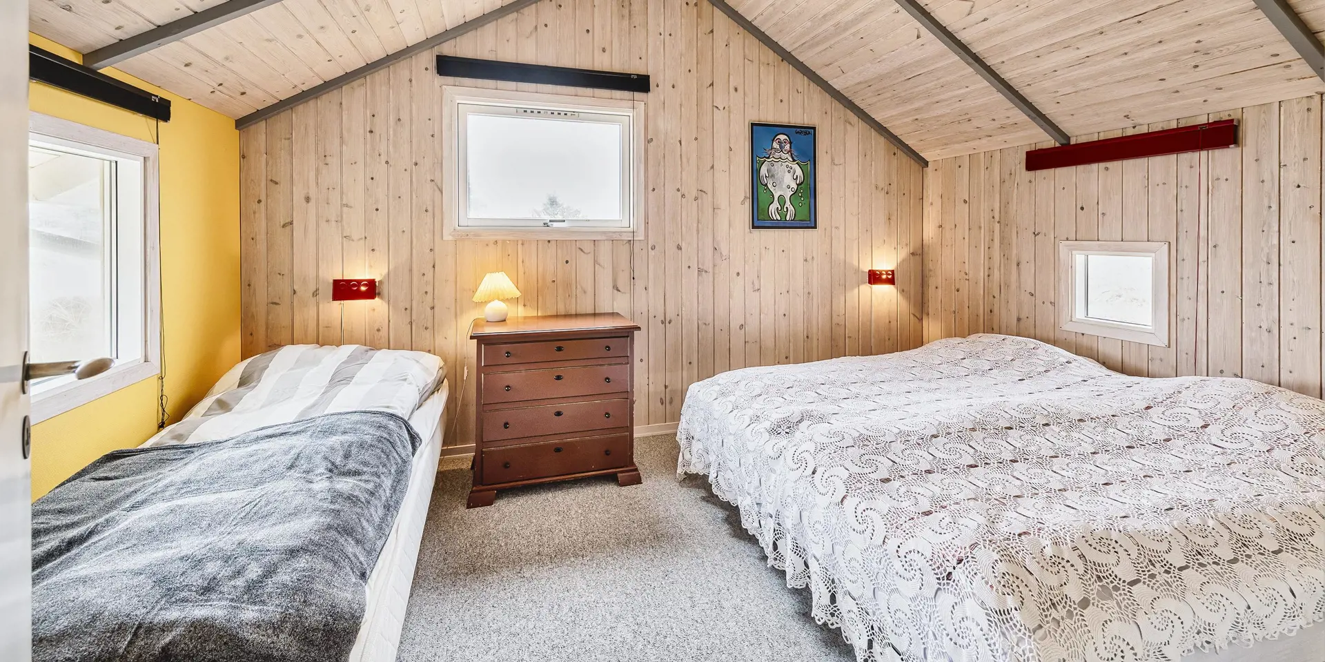 3 Schlafzimmer. 1 mit Doppelbett 180x200 cm. 1 mit Doppelbett und 1 Einzelbetten. 1 mit 2 Einzelbetten (je 90x200 cm).