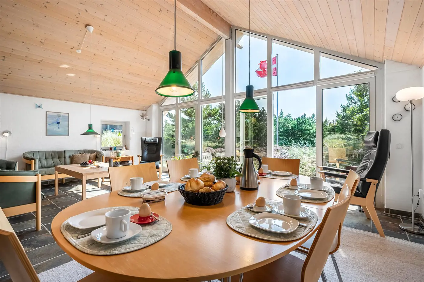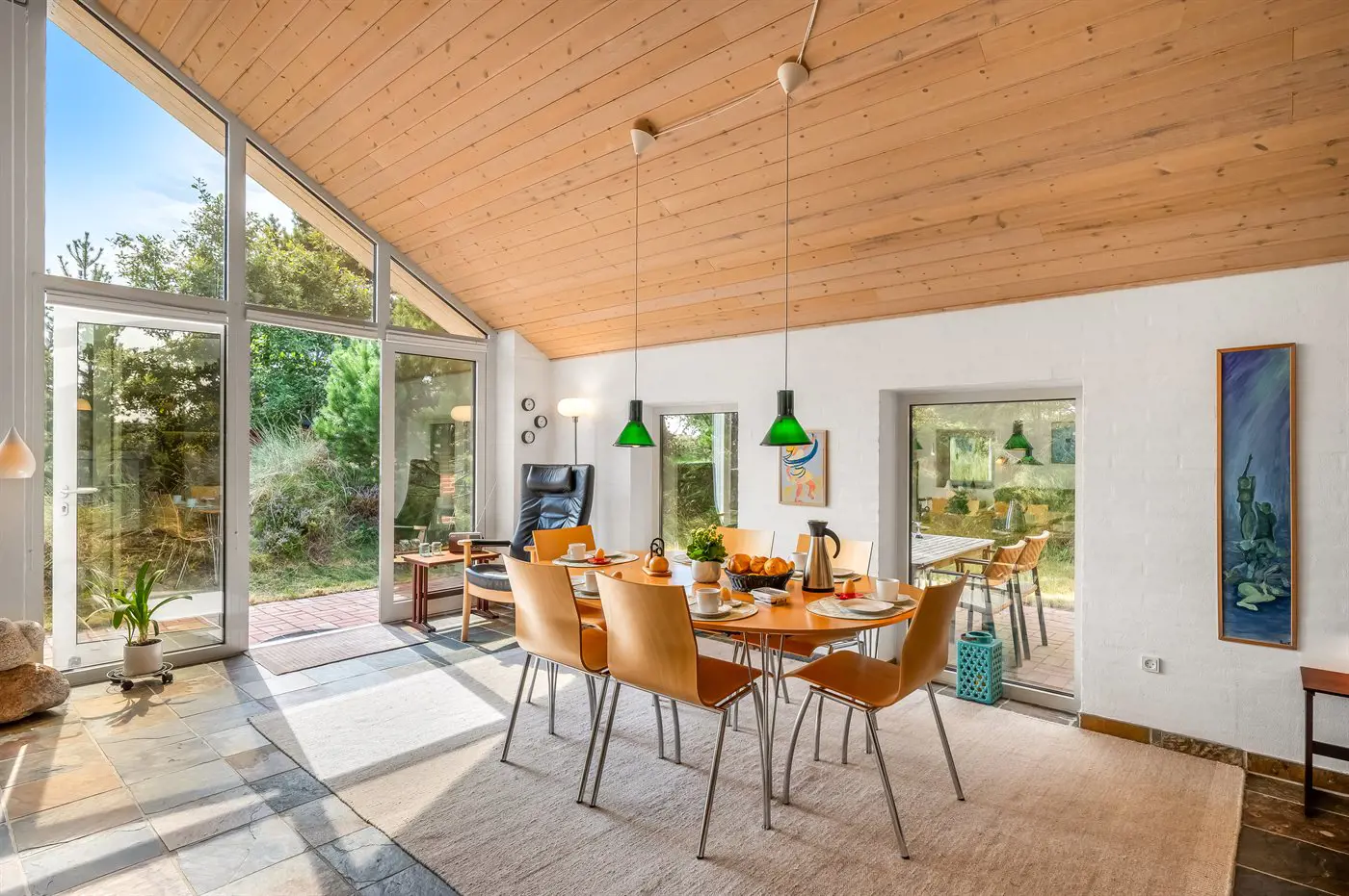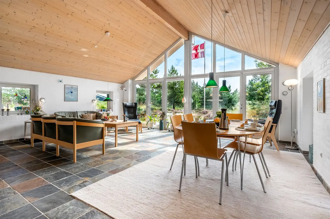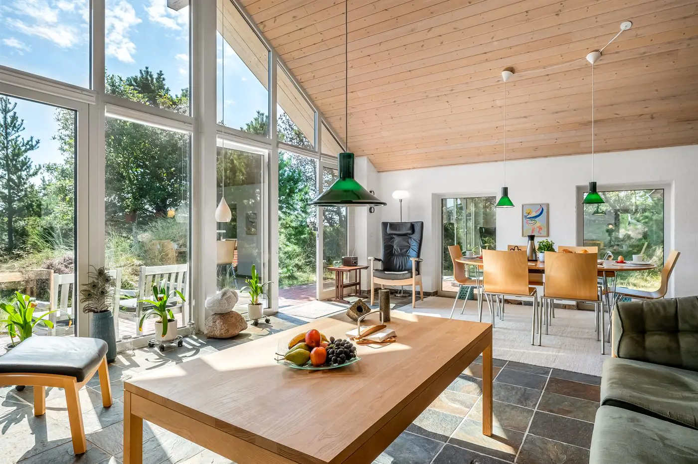 Das Wohnzimmer ist mit einem großen Esstisch, zwei separaten Sitzgruppen und mehreren bequemen Sesseln ausgestattet – ideal zum Entspannen und zum gemütlichen Beisammensein für die ganze Familie. Durch die Wohnzimmerfenster blickst du direkt auf das Naturgrundstück mit einem reichen Tierleben. Haustiere sind nicht erlaubt.