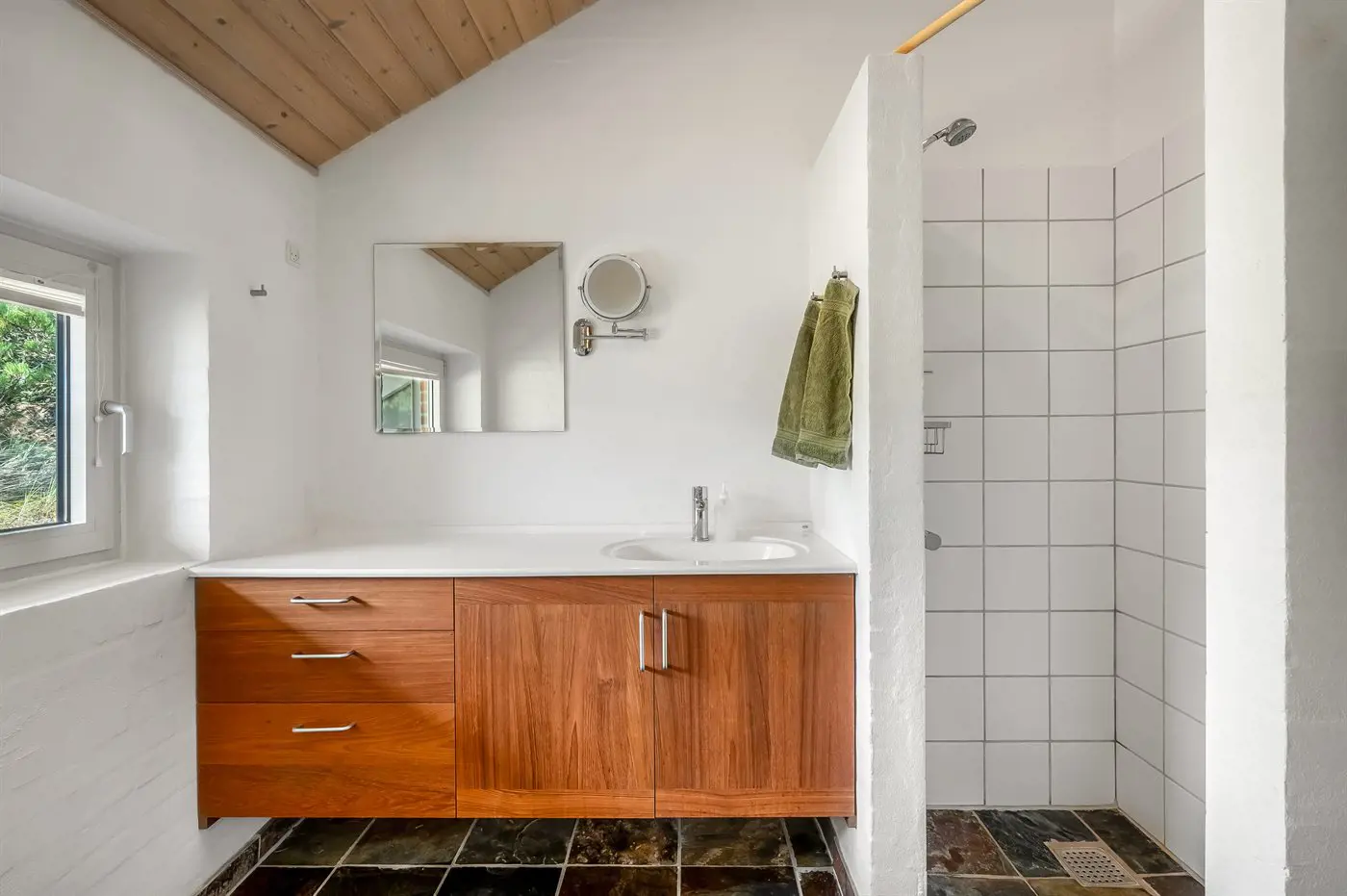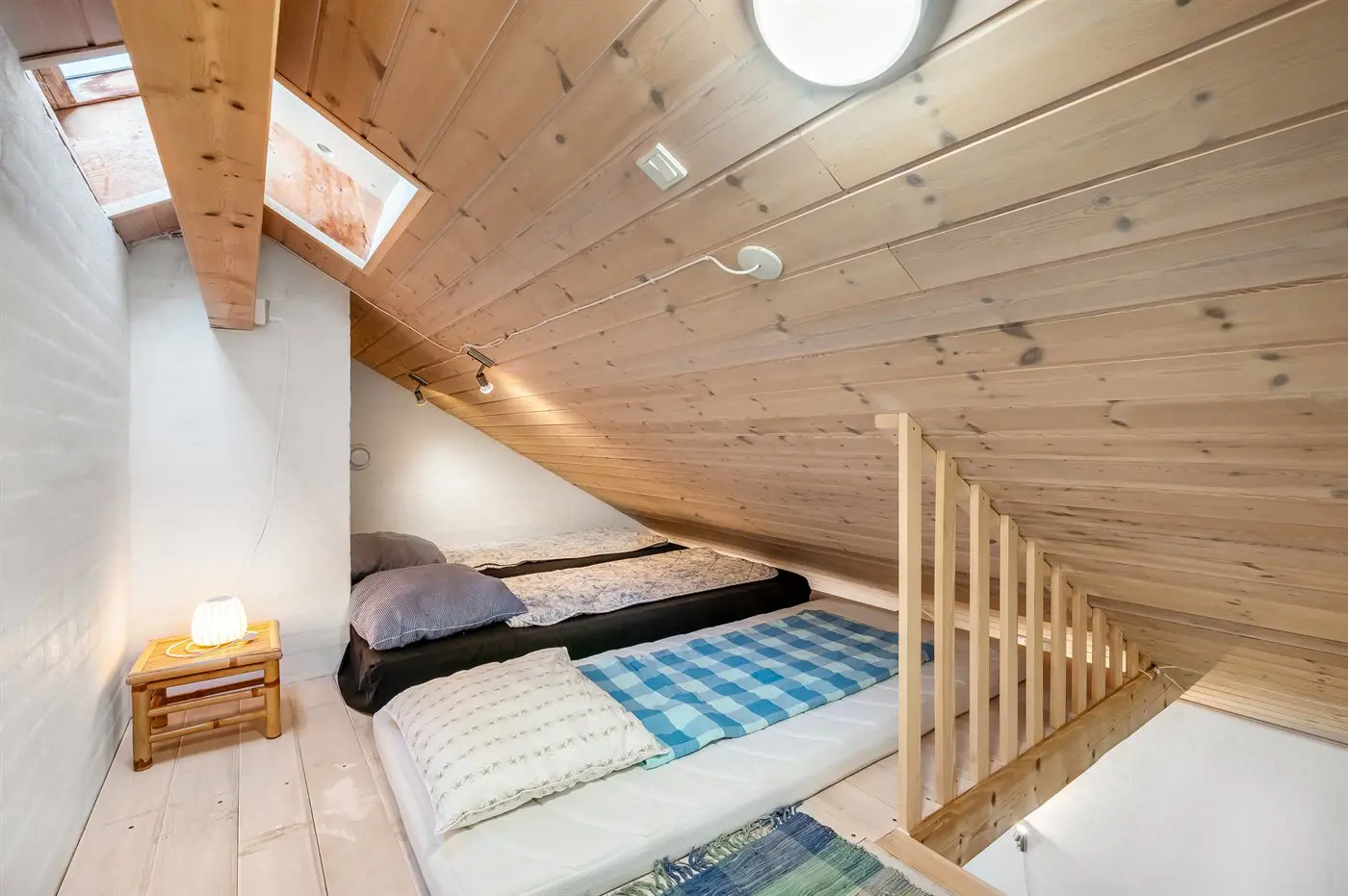 Innen besticht das Haus durch die besonders hohe Qualität. Die Fußböden sind aus chinesischem Schiefer, die Türen sind massiv und alle Einbauten in Küche, Bad und Schlafzimmern wurden vom Tischler aus Mahagoni angefertigt. Die Einrichtung ist durchdacht, mit einem zentral gelegenen Aufenthalts- und Gemeinschaftsbereich um den Kaminofen. Decken bis zum First, große Fenster und ein Dachfenster sorgen für ein offenes und helles Ambiente. Hier kannst du gemütlich essen, spielen und unvergessliche Erinnerungen schaffen.