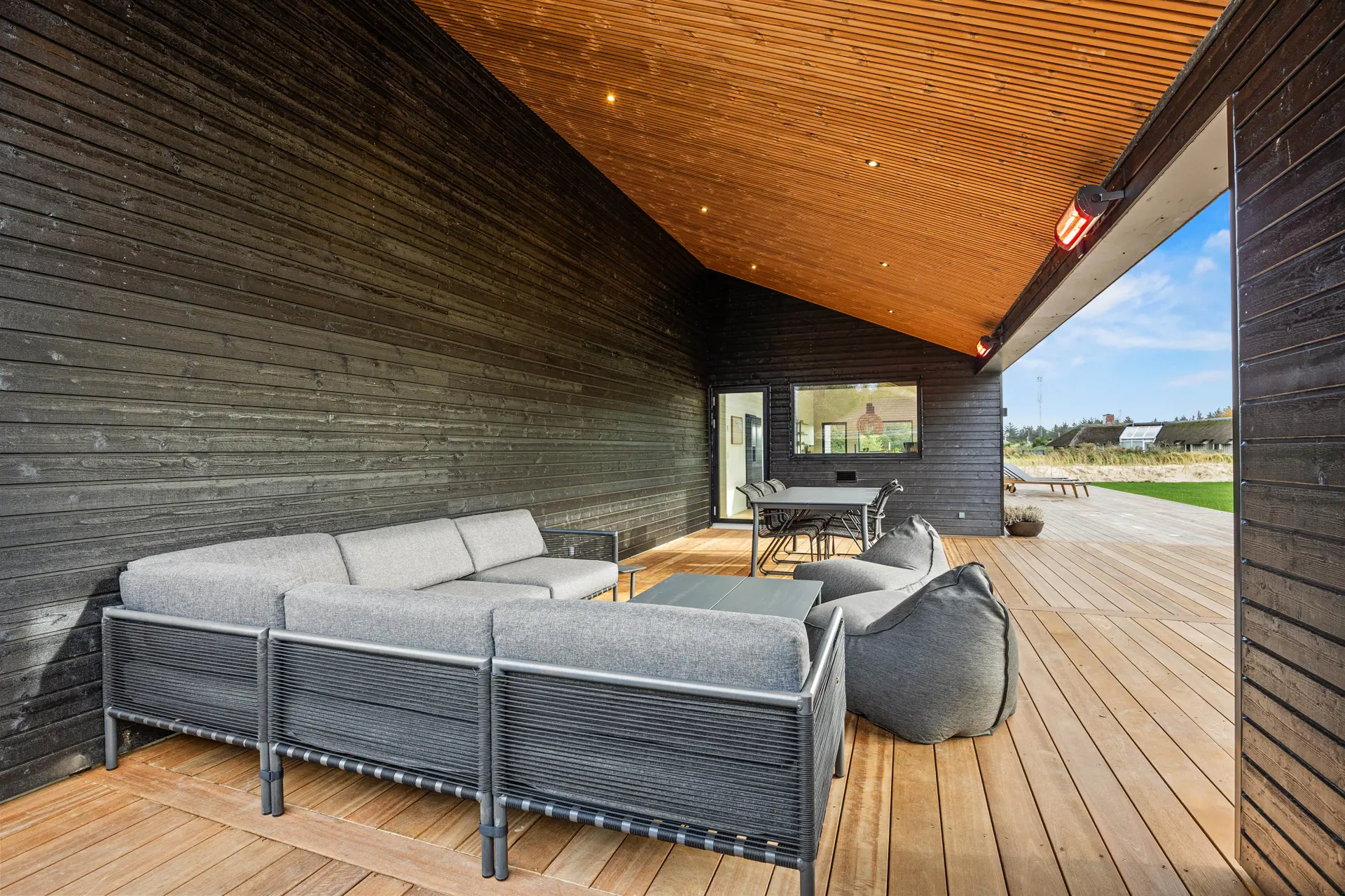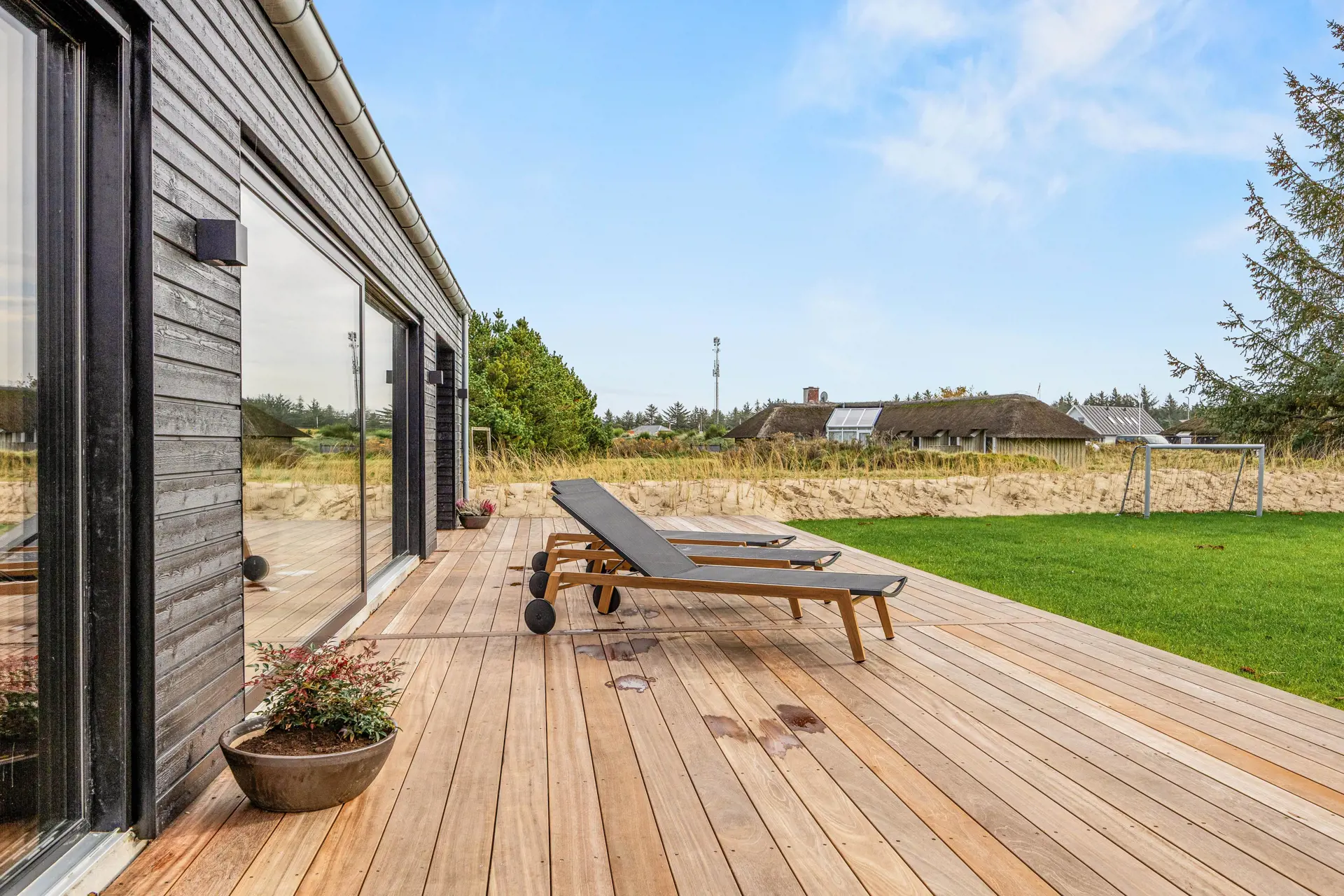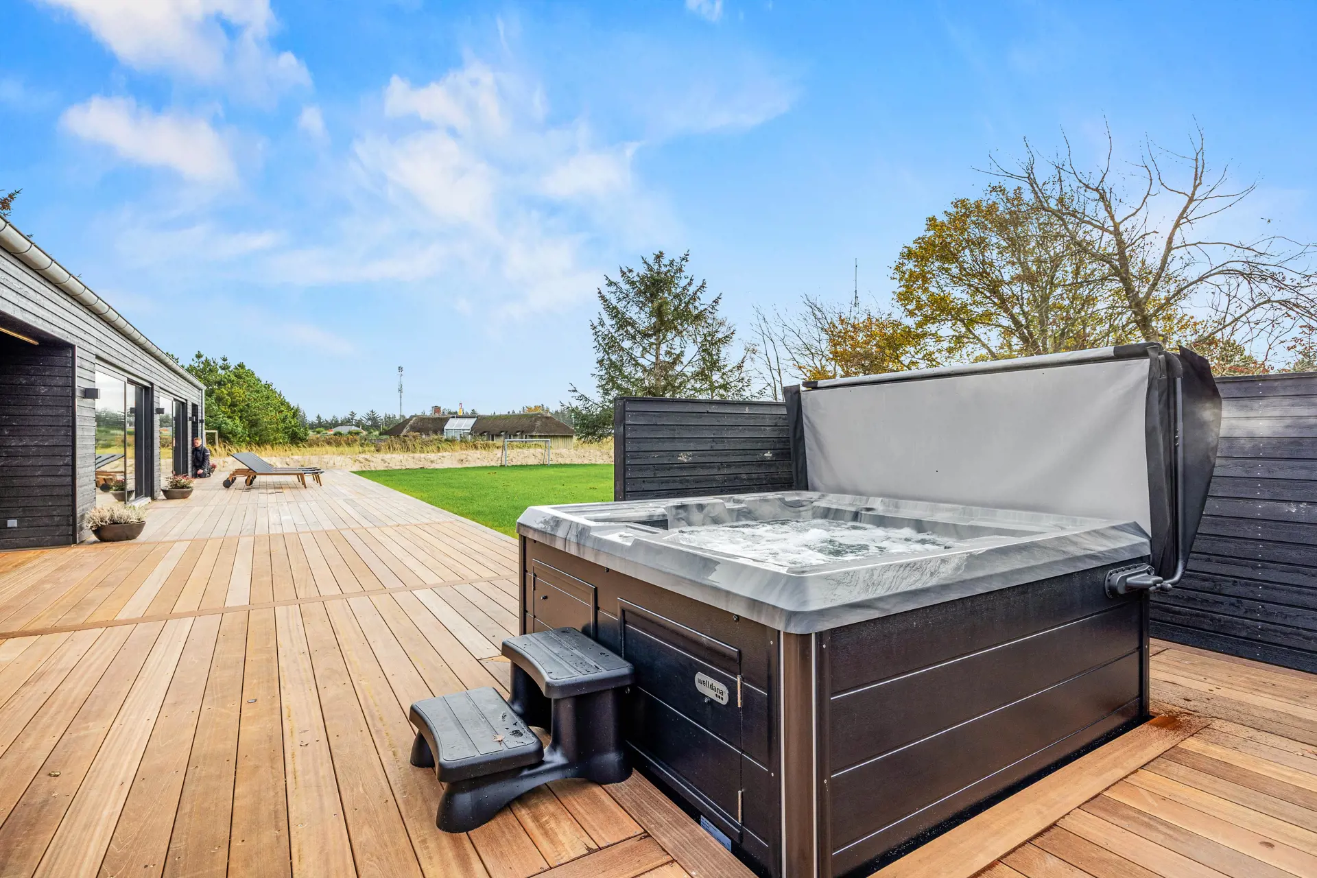 Das Ferienhaus in Vejers bietet eine beeindruckende Grundstücksfläche von 1552 m², die euch ein privates Outdoor-Paradies zur Verfügung stellt. Entspannt auf der offenen oder überdachten Terrasse von etwa 60 m2, während die Kinder im großzügigen Garten spielen. Genießt luxuriöse Momente in einem Außenwhirlpool und erlebt den ultimativen Komfort dank Wärmelampen auf einer der zwei überdachten Terrassen. Diese sind mit komfortablen Loungemöbeln ausgestattet, die zum Verweilen einladen.